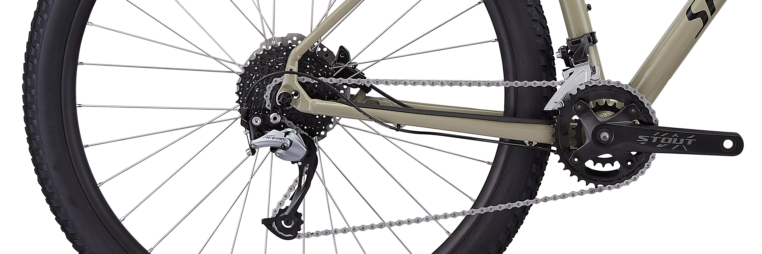 Un desviador trasero Shimano Acera controla los cambios con duradera compostura. Se mueve en un amplio rango de cambios con 11-36d, para que puedas pedalear tranquilo sabiendo que siempre vas a tener a mano el cambio justo a mano.
