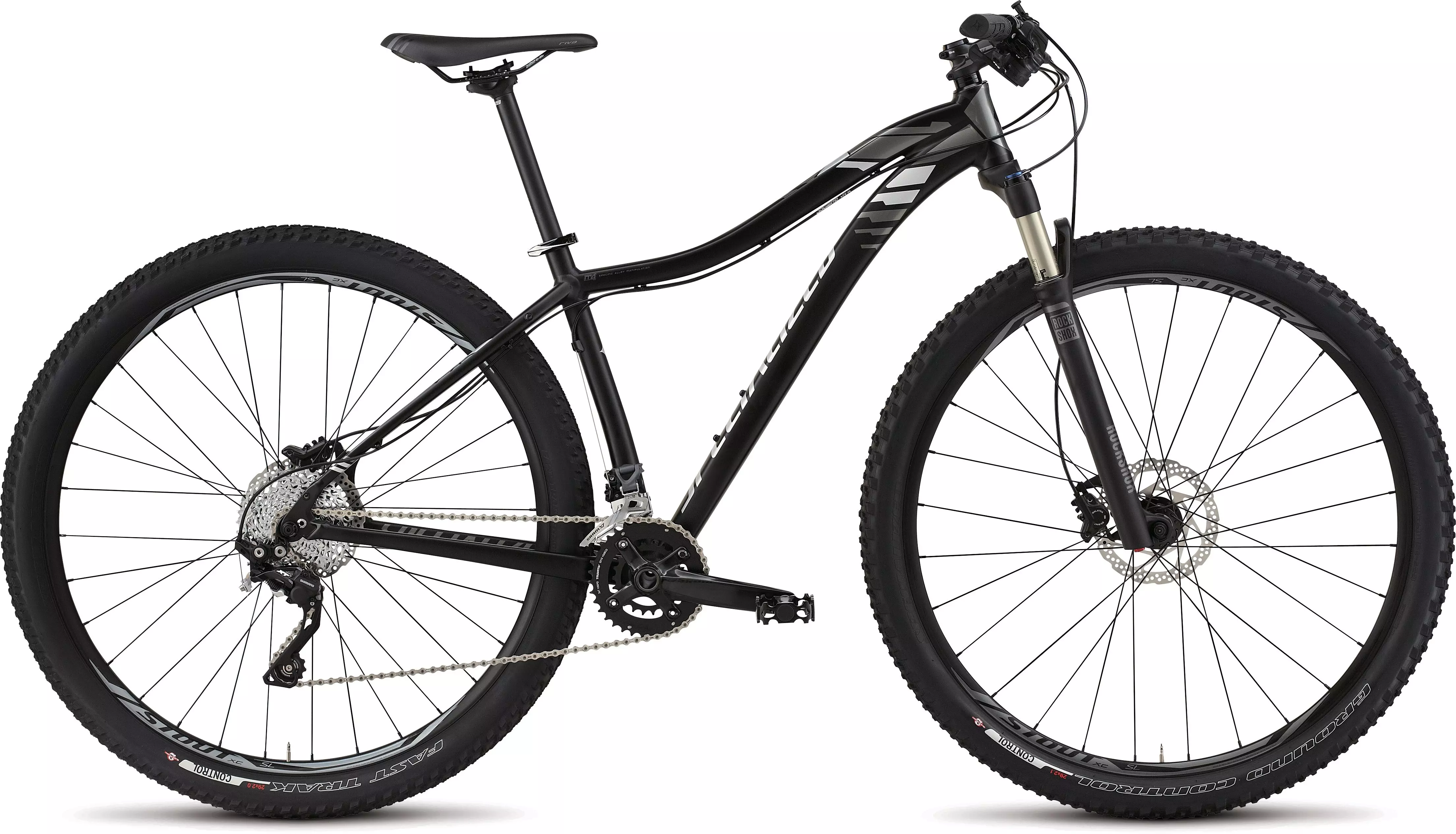 Specialized M4 Aluminium, Women's XC 29er Geometry, women's fully butted tubesets w/ smooth welds, integrated headtube forged post-mount 160mm dropouts, replaceable hanger