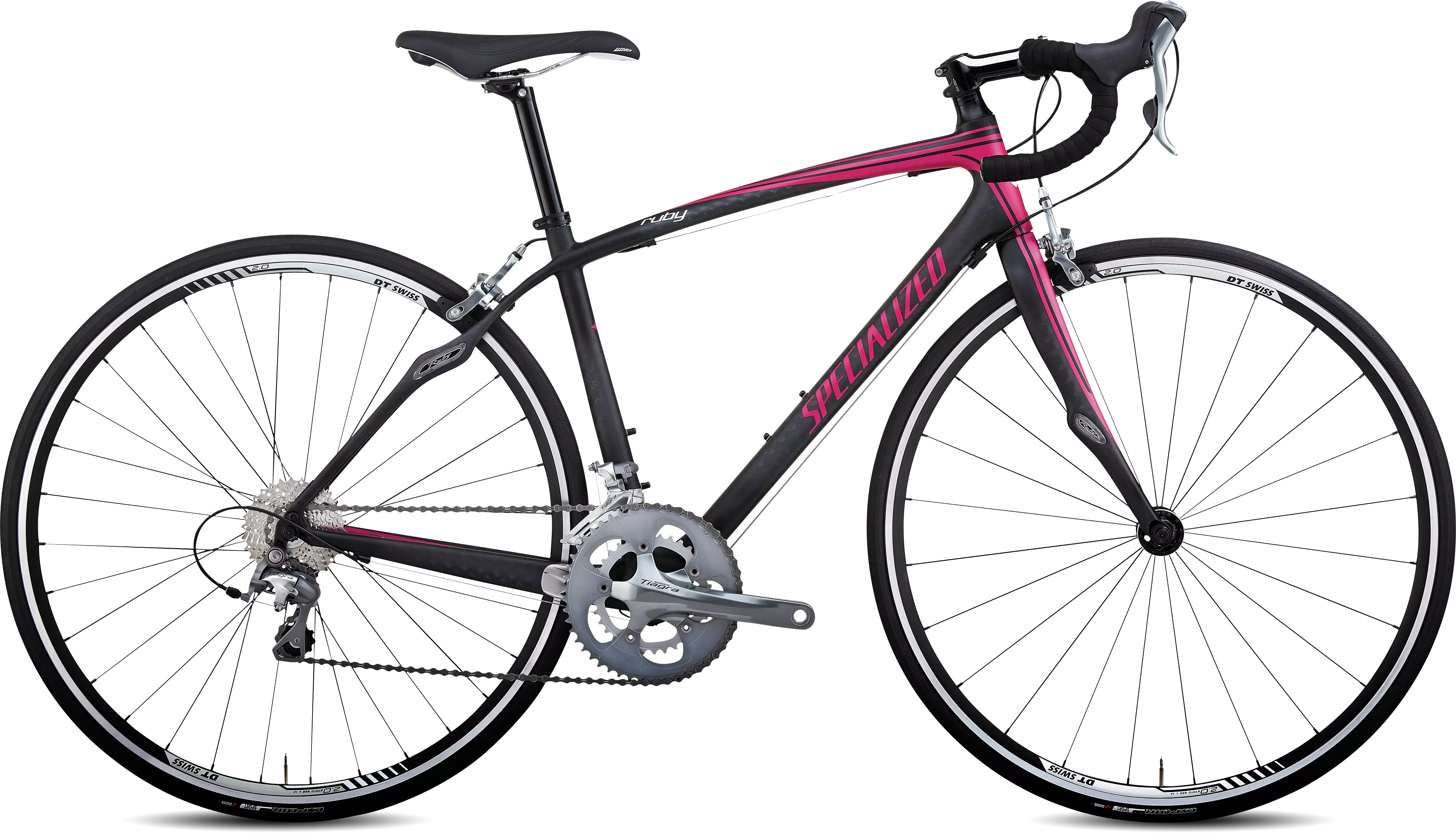 Ruby is a quick and efficient, FACT carbon bike, with Zertz vibration dampers in the frame and fork, designed to cover long distances in maximum control and comfort. High-quality Shimano Tiagra compact drivetrain and our new DT-Axis 2.0 wheelset to keep weight down and performance up.