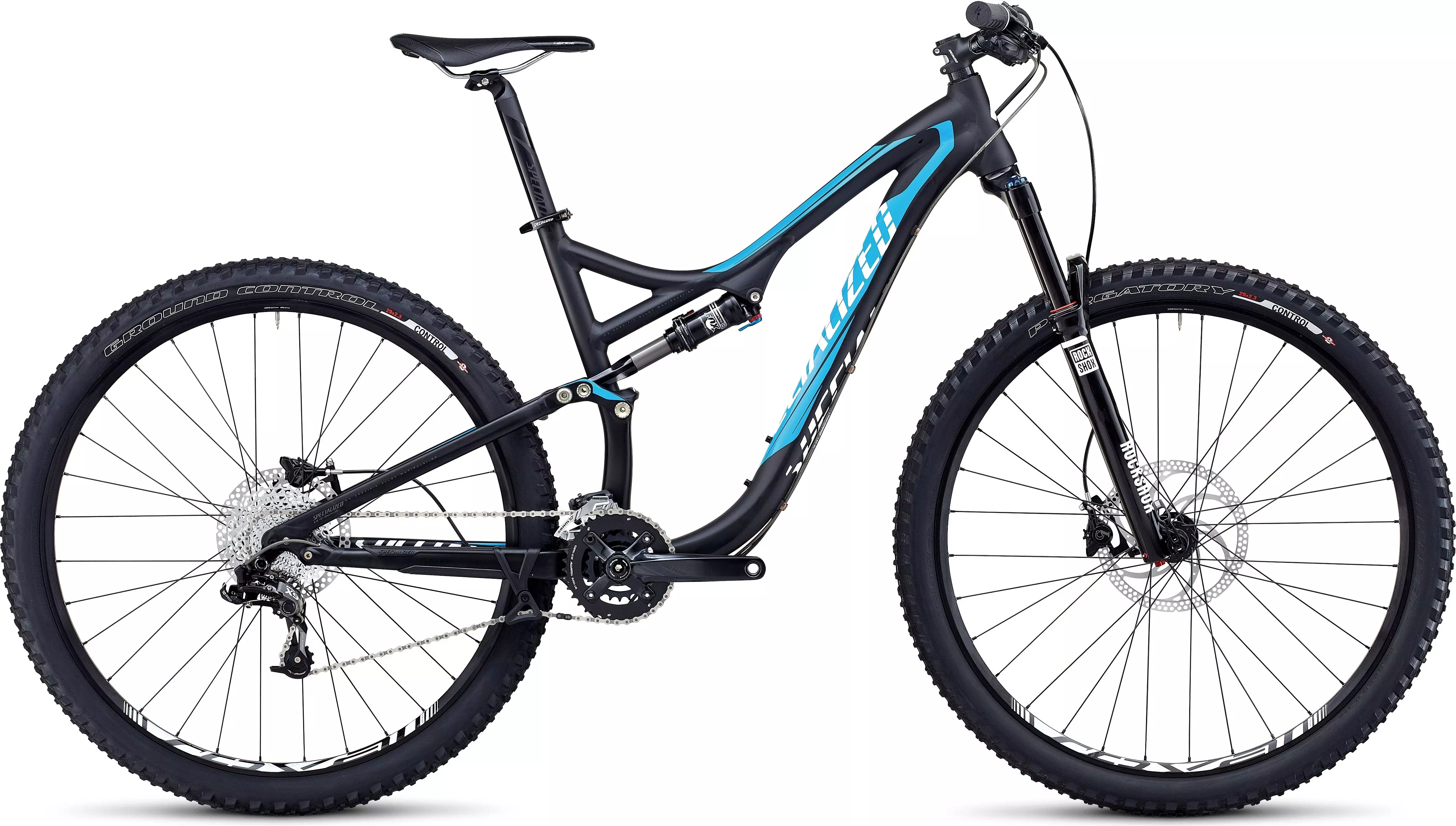 The Stumpjumper FSR Comp 29 is built from an M5 aluminium frame with 130mm of rear wheel travel, a custom Fox Float CTD Evolution shock with AUTOSAG, RockShox Revelation RC3 fork, and a custom SRAM S-1250 10-speed XC Trail double crankset.