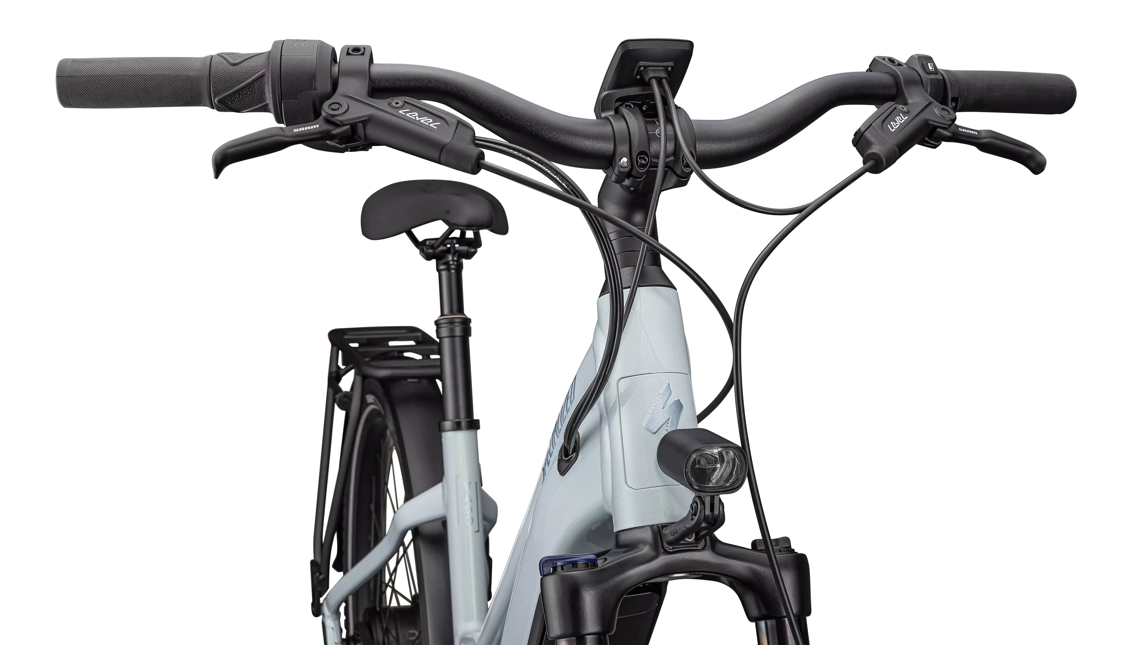 E5 Aluminum, bottom bracket motor mount, fully integrated &lockable downtube battery, internal cable routing, lock and front rack mount, sliding dropout