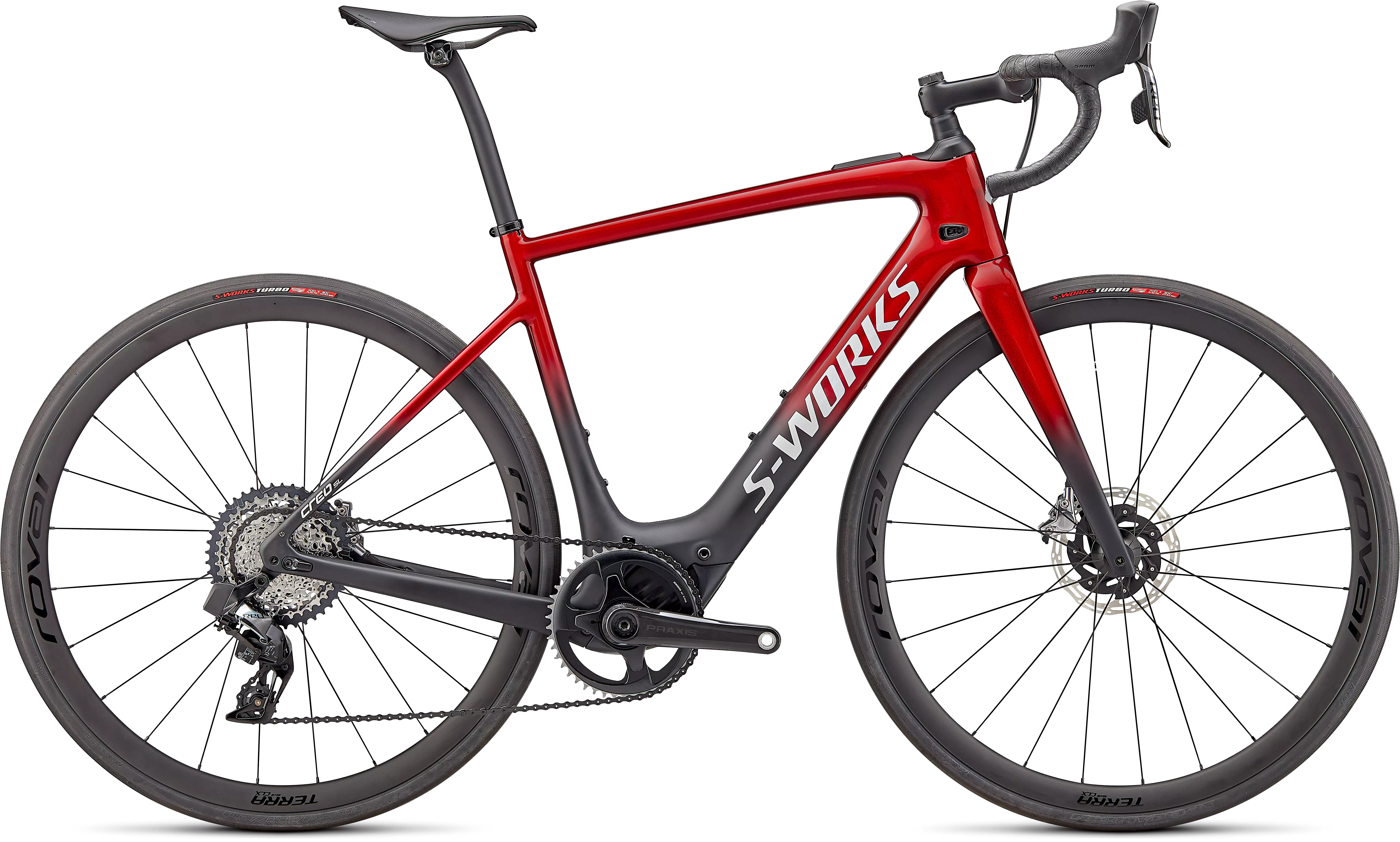 Zoals al onze S-Works fietsen is de S-Works Turbo Creo SL onze topper. Het FACT 11r-frame en Future Shock 2.0 met een hydraulische demper zijn afgemonteerd met een 1x SRAM Red AXS eTap en een 10-44t cassette voor een ongelooflijk versnellingsbereik. Hij rolt met Roval Terra CLX Disc carbon wielen en 30 mm S-Works Turbo-banden. En voor de puntjes op de i, hebben we een S-Works Carbon Hover stuur, een S-Works Future stuurpen en een Body Geometry S-Works Power zadel gemonteerd. We zorgen ook voor een range extender, omdat je nooit meer wilt stoppen met fietsen.