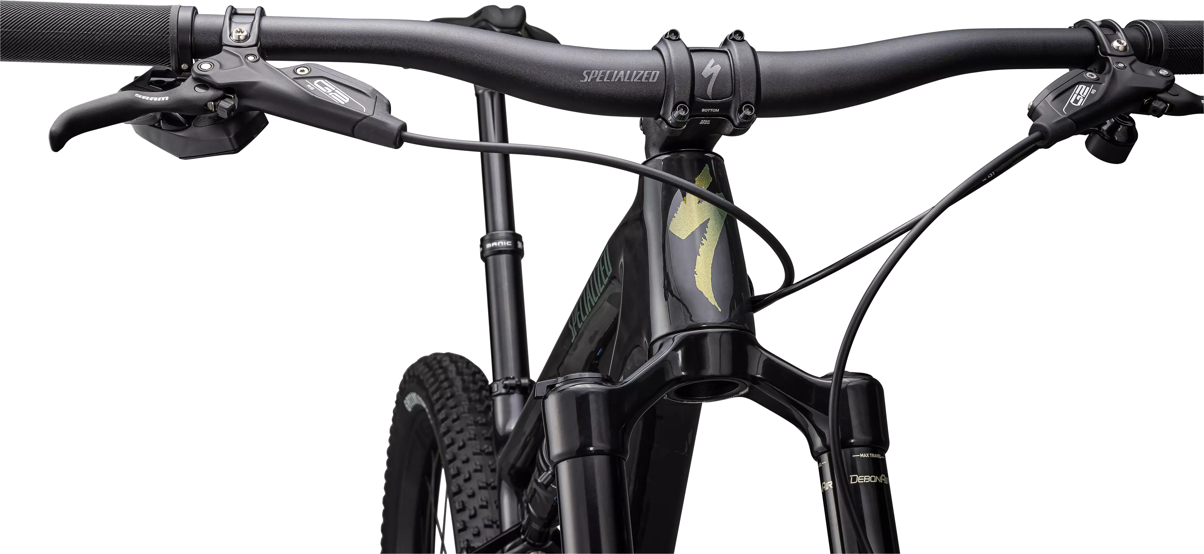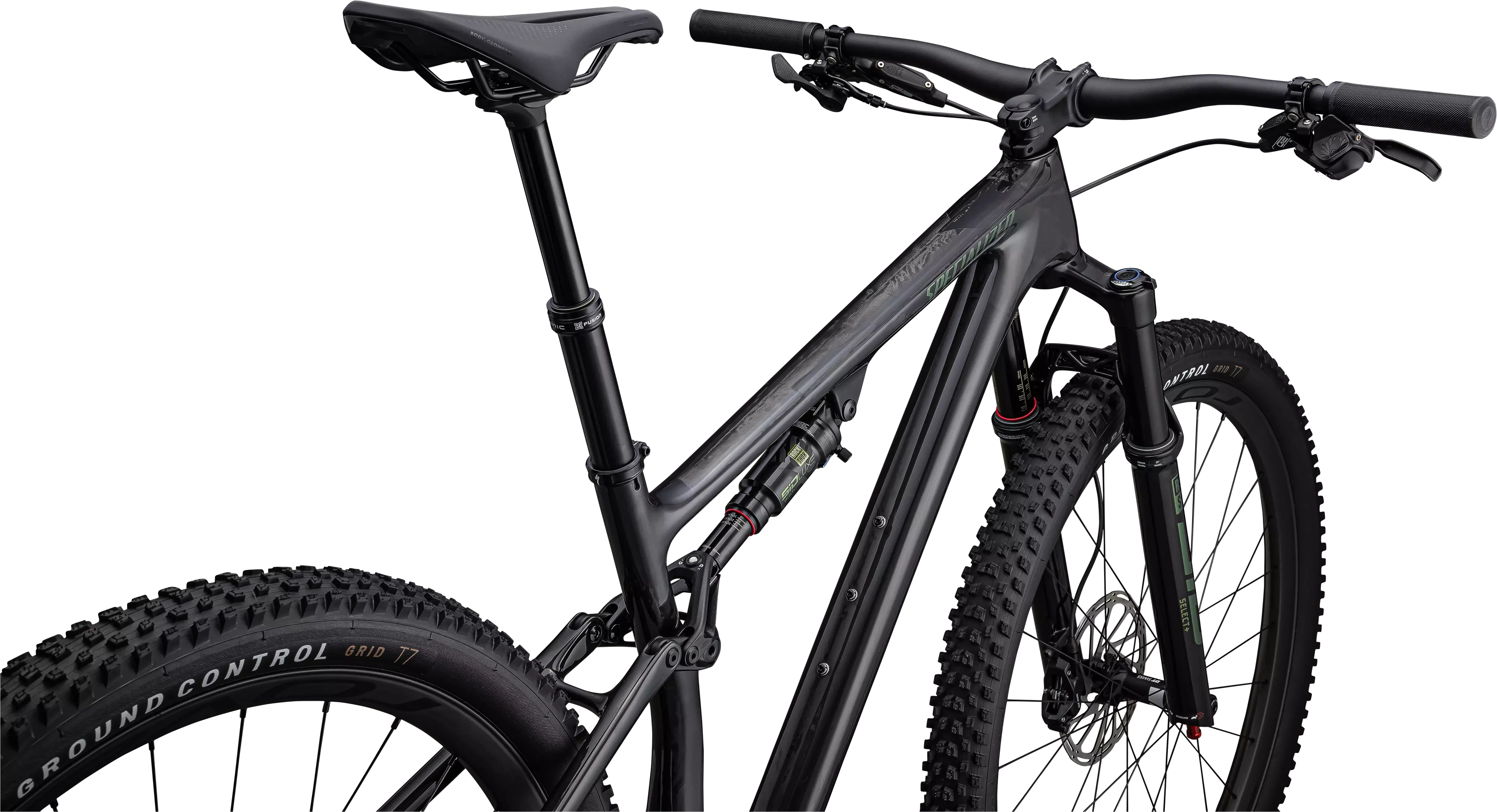 A suspensão na dianteira é fornecida pela RockShox com seu garfo SID Select+ de 120 milímetros, que apresenta o amortecedor Charger 2 RL com ajuste de compressão de duas posições para uma impressionante eficiência de pedalada, enquanto a mola DebonAir oferece ajuste fácil e sensação consistente em toda a faixa de curso.