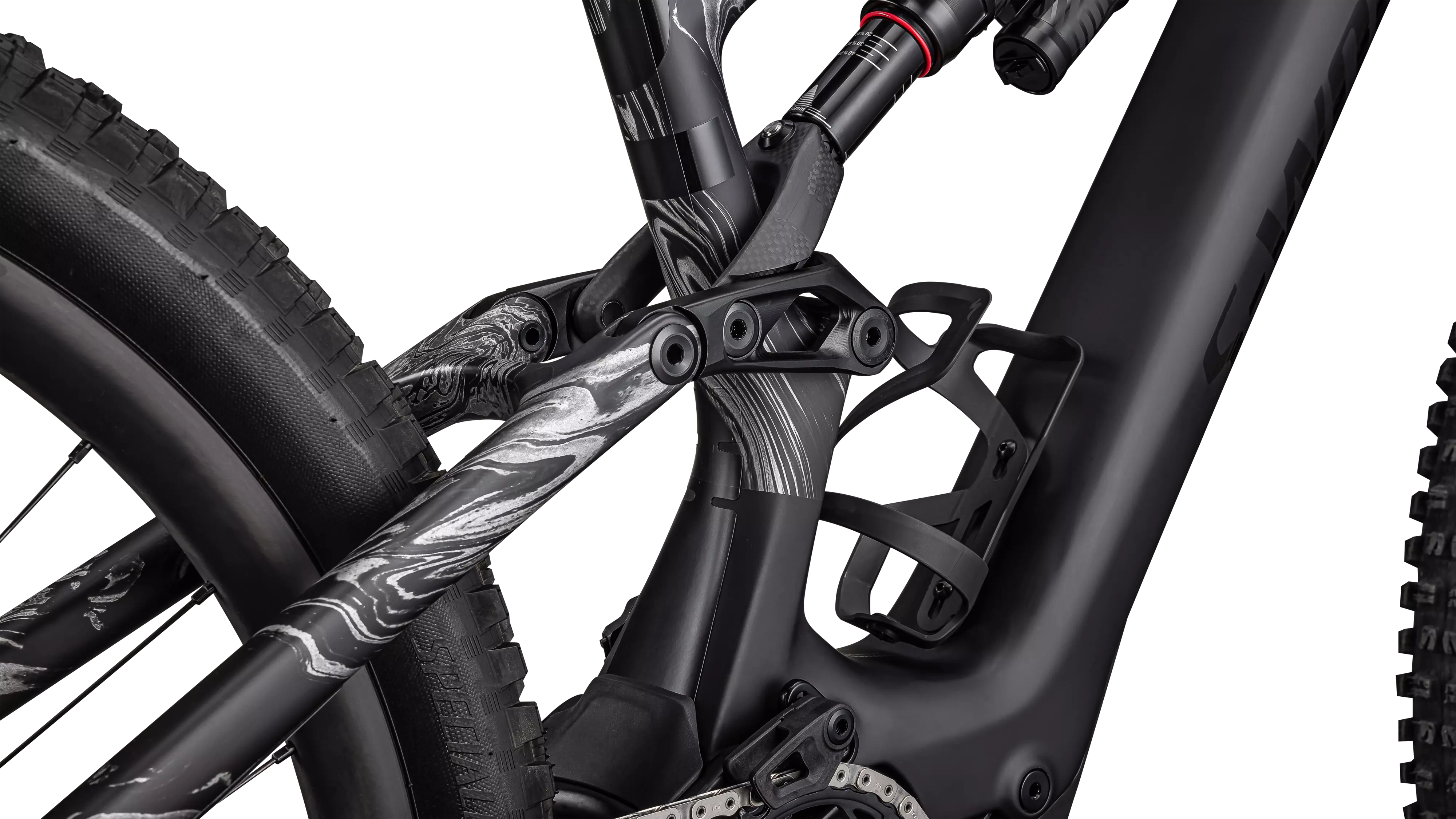 O QUADRO DE REFERÊNCIA — Tudo começa aqui. Sensação de pilotagem viva e precisa. A disposição estratégica das fibras de carbono proporciona um chassi super-responsivo. Ajustamos todo o chassi—parte dianteira, traseira e o link que os unifica—como uma única unidade para minimizar a flexão lateral durante a pedalada e aproveitar cada pedaço de força aplicada nos pedais.
