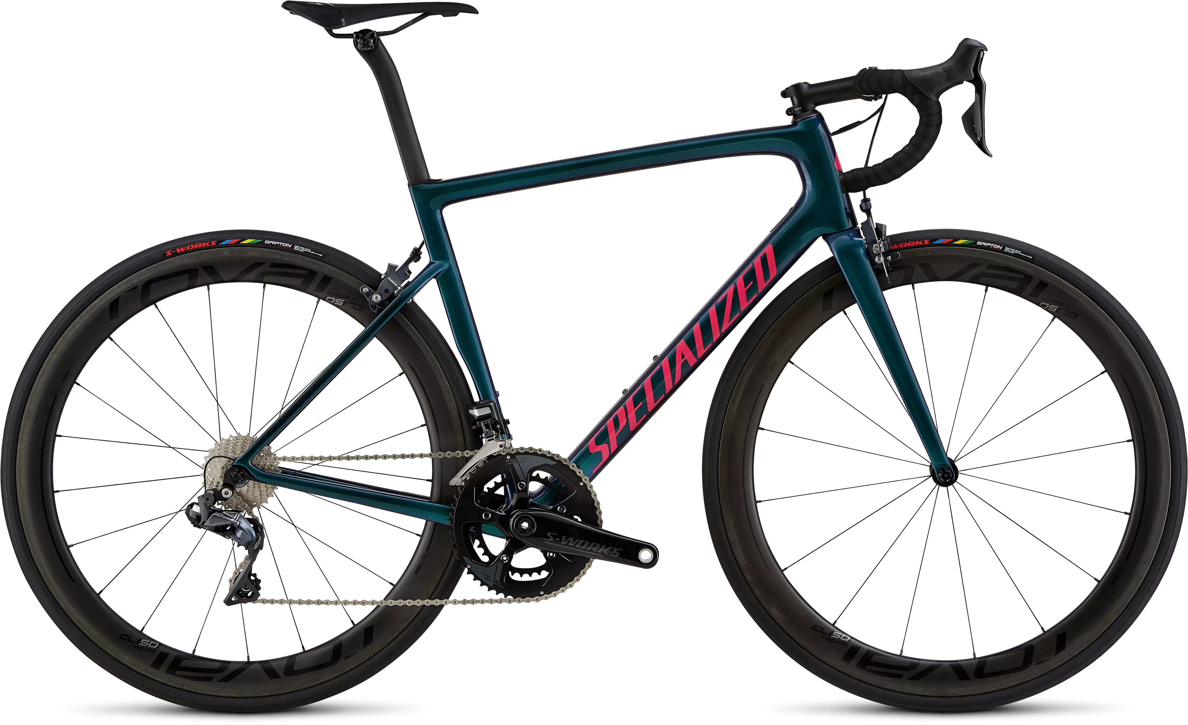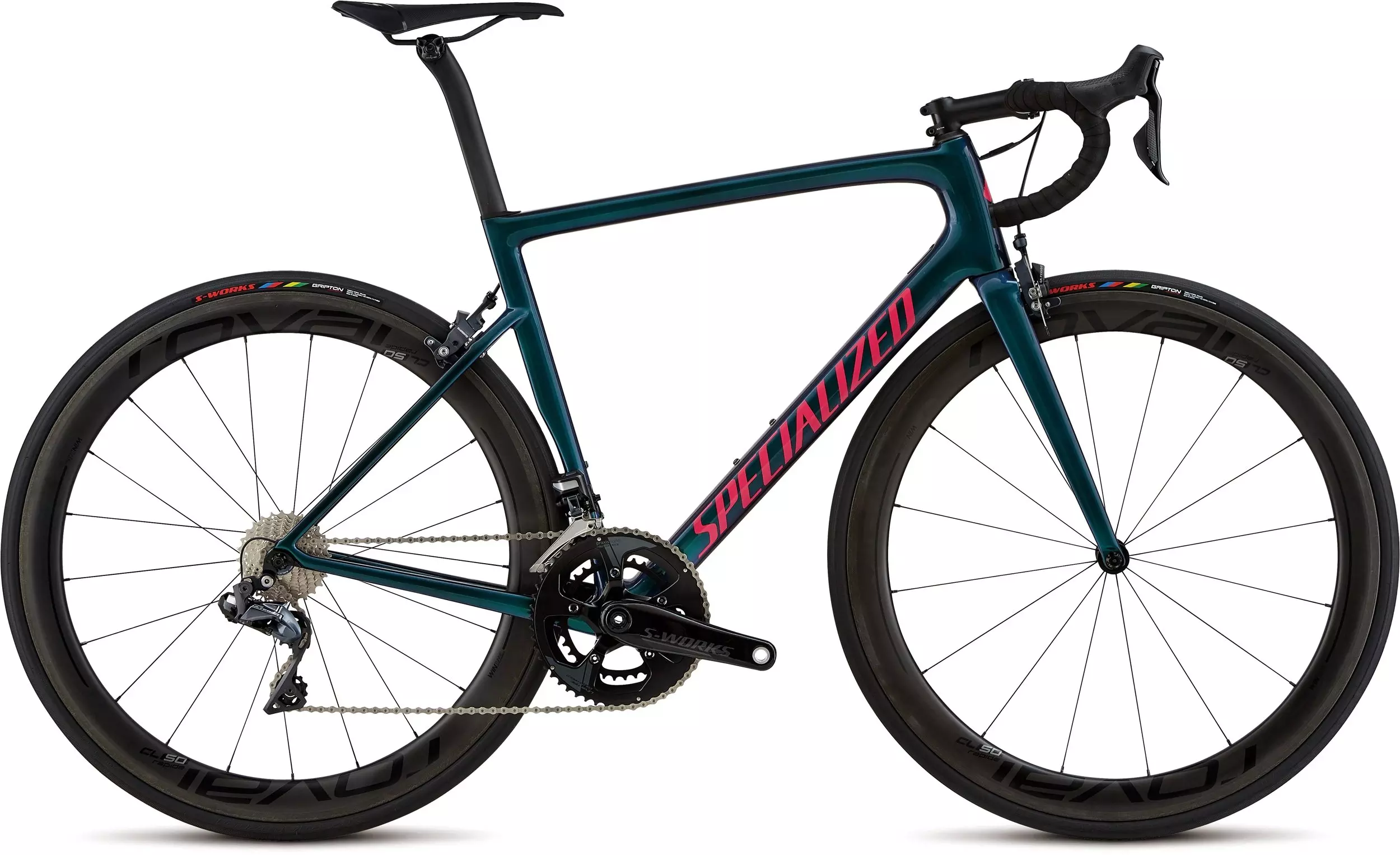 A Tarmac Pro vem equipada com os novos componentes Ultegra 8150 Di2 com suportes para freios, pedivelas S-Works Power Cranks, porém impressionantemente aerodinâmicas, rodas Roval CL 50 com pneus S-Works Turbo de 26mm.