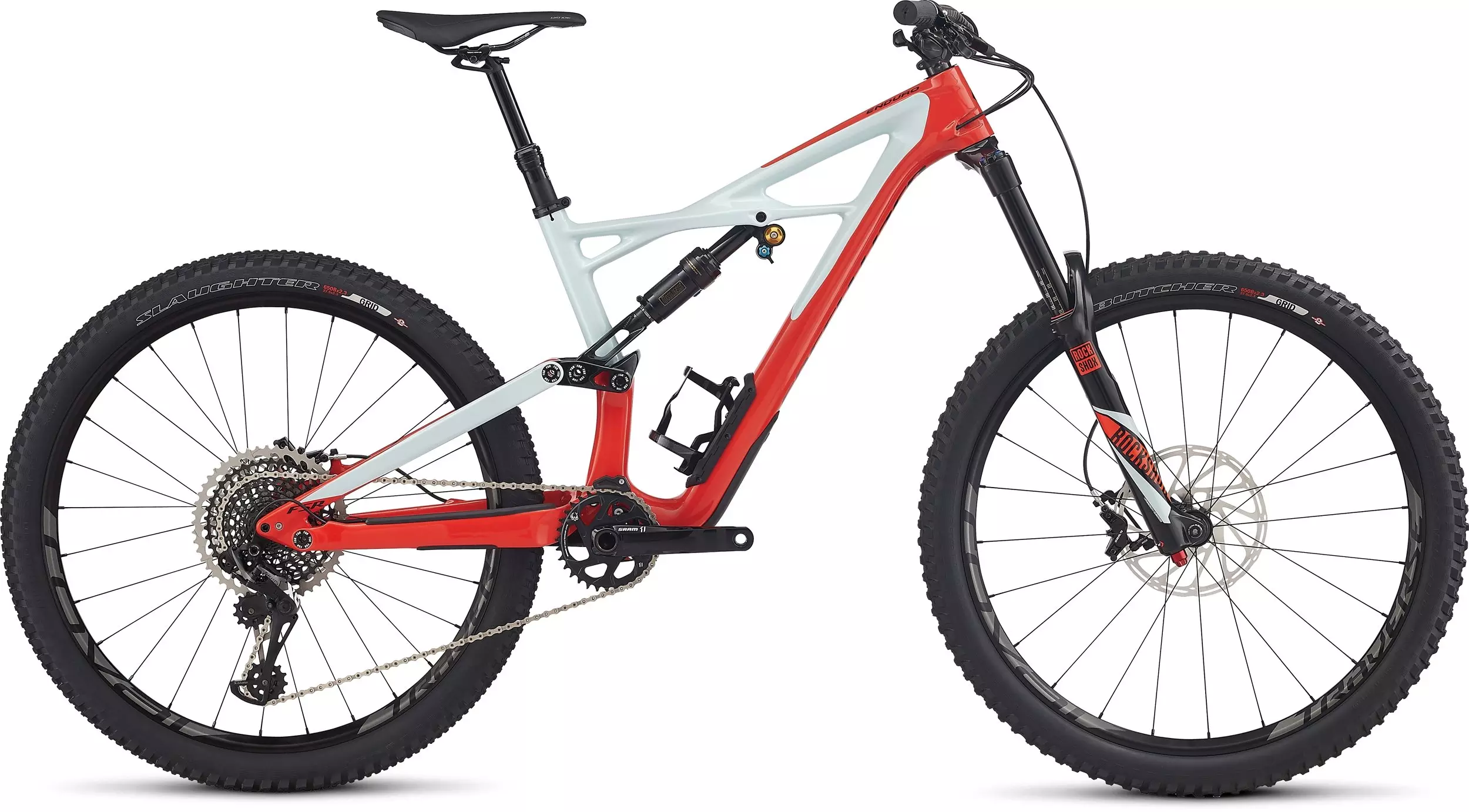 Blistering speed, nimble handling, mega travel length—our Enduro Pro Carbon 650b has it all in spades. It's been redesigned from the ground up, and what it delivers is one of the most capable trail bikes we've ever made. Get ready to be stoked. We gave it a whole new geometry, with a slacker front end, a longer top tube, even shorter chainstays, and a lower bottom bracket. All of this together makes the bike truly feel glued to the ground, and the platform is more responsive and capable then ever. We even added some brand new bits, like integrated storage with a SWAT™ Door at the down tube, and made "old" new again by making a triumphant return to a threaded bottom bracket. To keep the weight down, the frame is constructed from our top-tier FACT IS-X 11m carbon fiber. And to ensure top-level performance on the descents, this material choice is greeted by 170mm of plush travel at both the front and rear. And handling suspension duties out back is the revolutionary Öhlins single tube rear shock. For the build, this Enduro spares no expense at hitting the pinnacle of performance, with a full SRAM X01 Eagle 12-speed groupset, powerful Guide RS brakes w/ S4 calipers, hand-built Roval wheels, and a RockShox Lyrik RC fork up front.