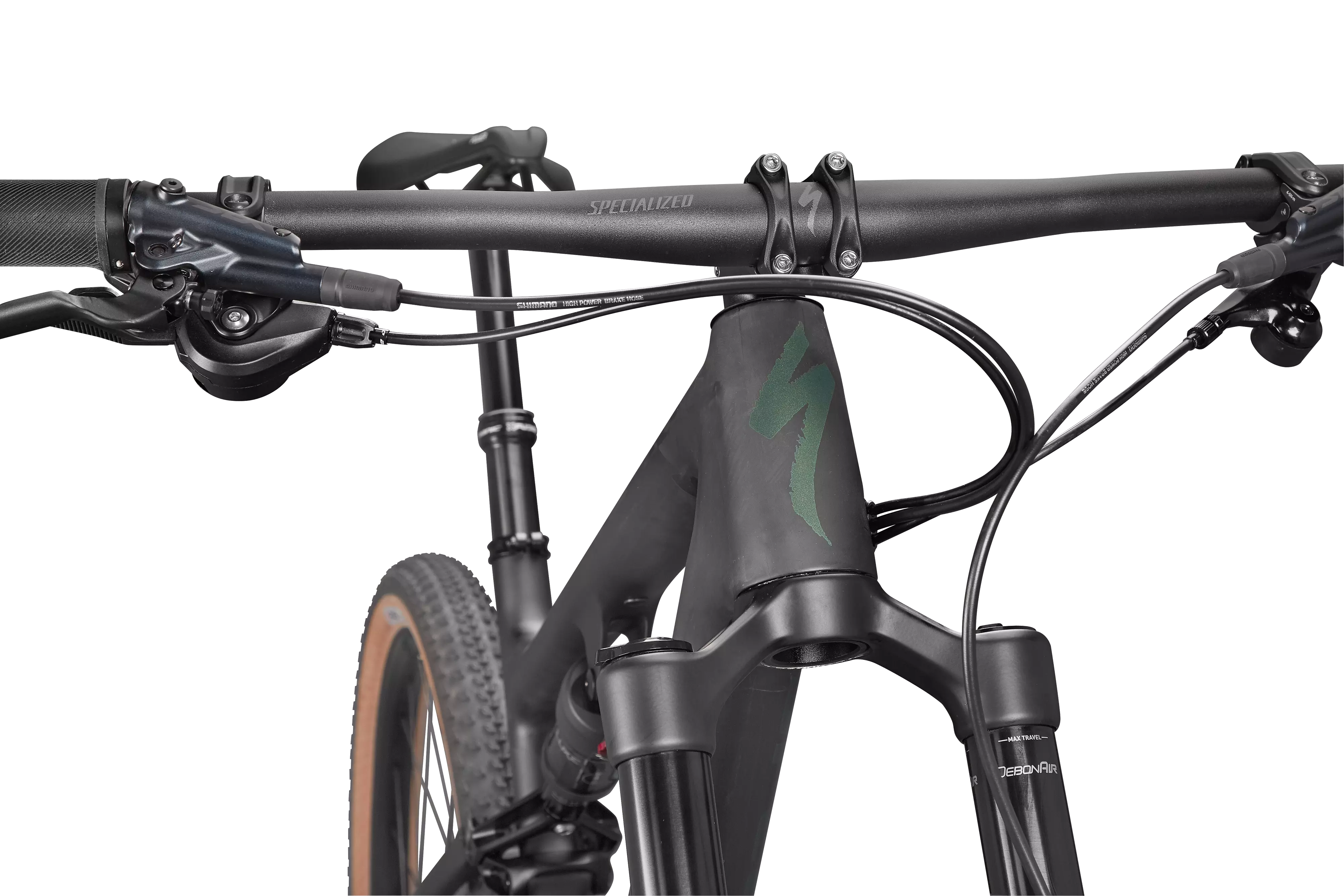 4-piston calipers on an XC bike? What a wonderful time to be alive—Shimano's 4-piston SLX calipers carry only a slight weight penalty over their 2-piston siblings, but offer plenty of smooth, controllable power to keep the EVO's newfound speed in check.