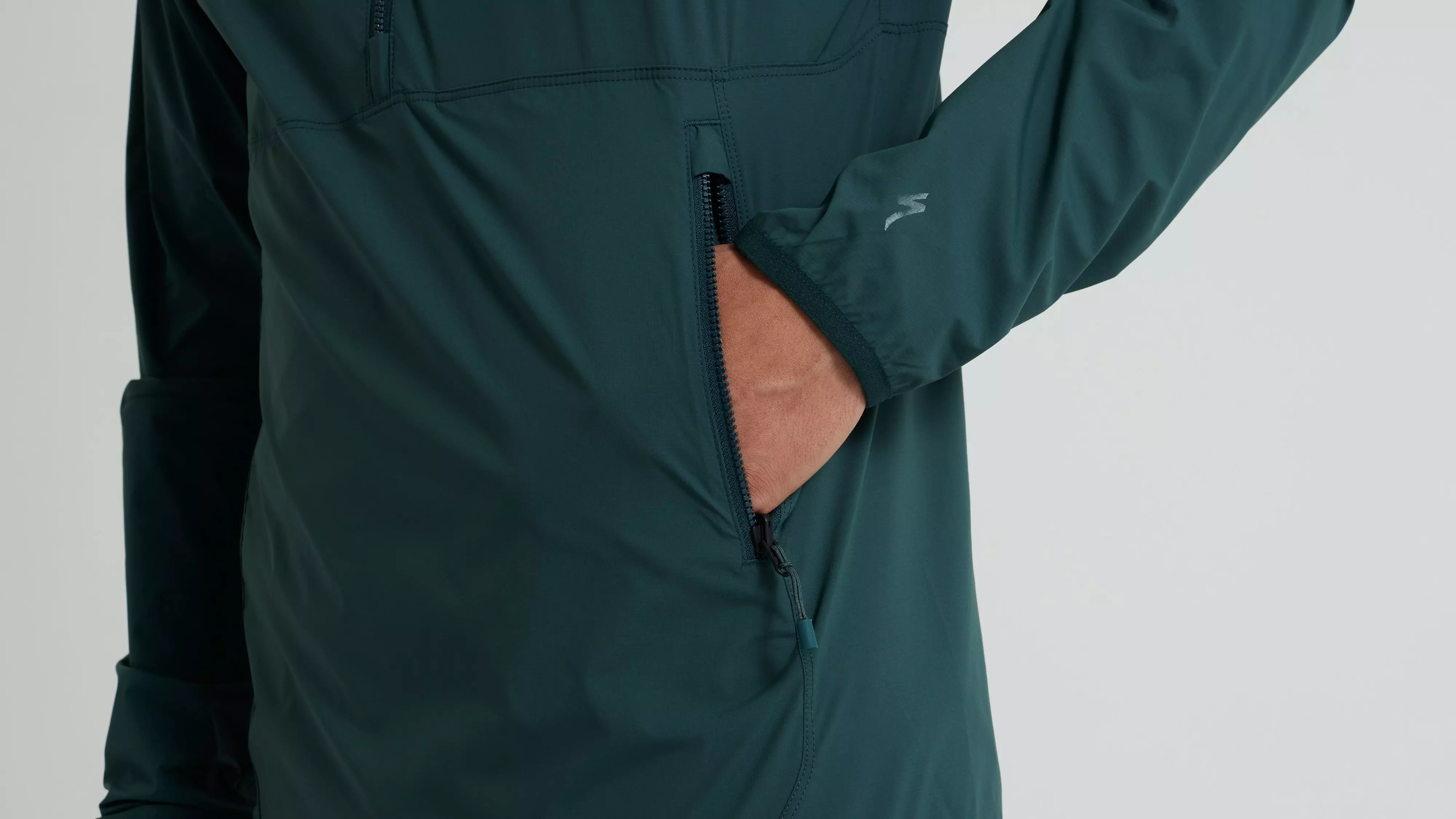 Integrated hood with fixed elastic for perfect fit and added weather protection.
