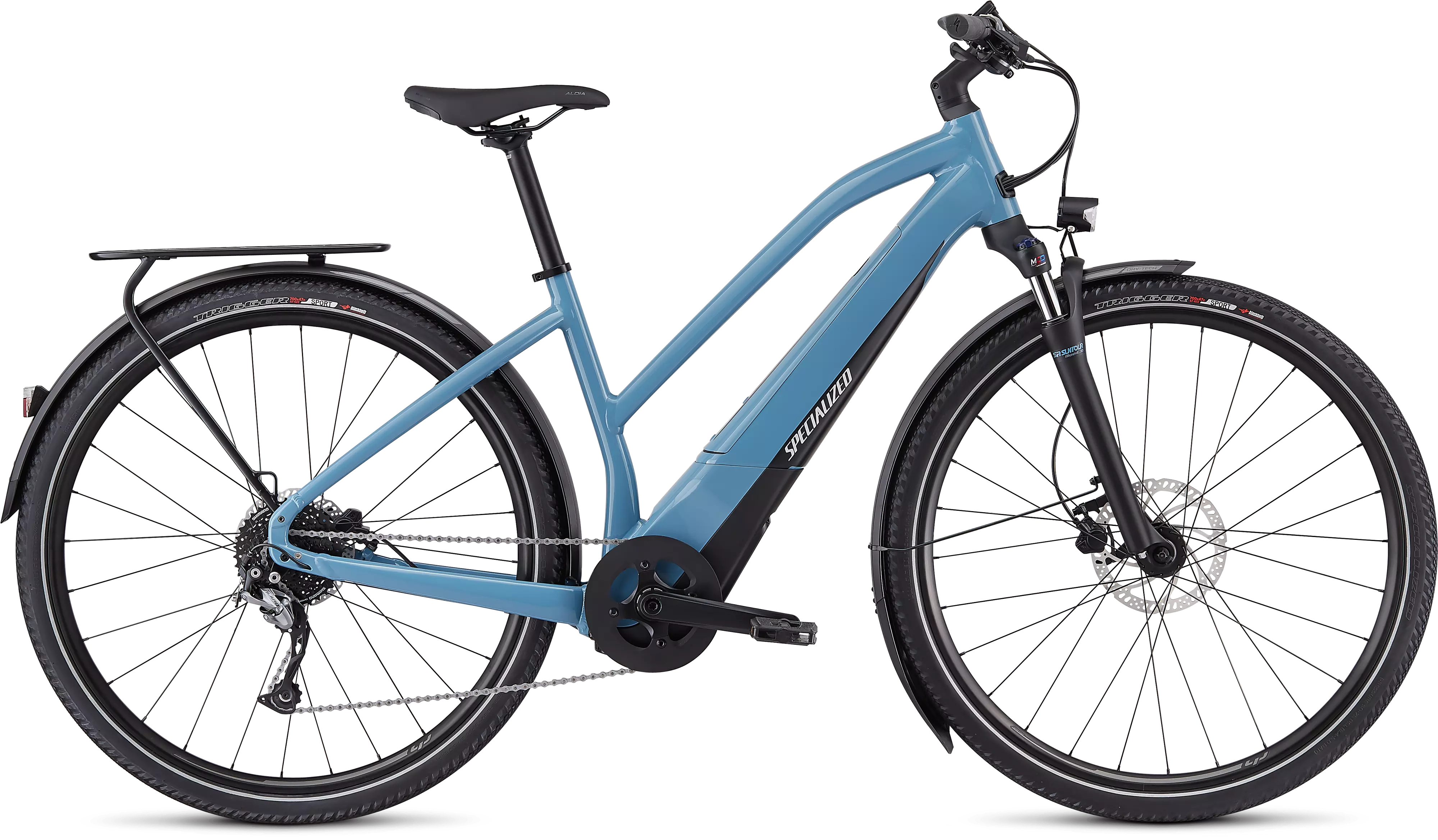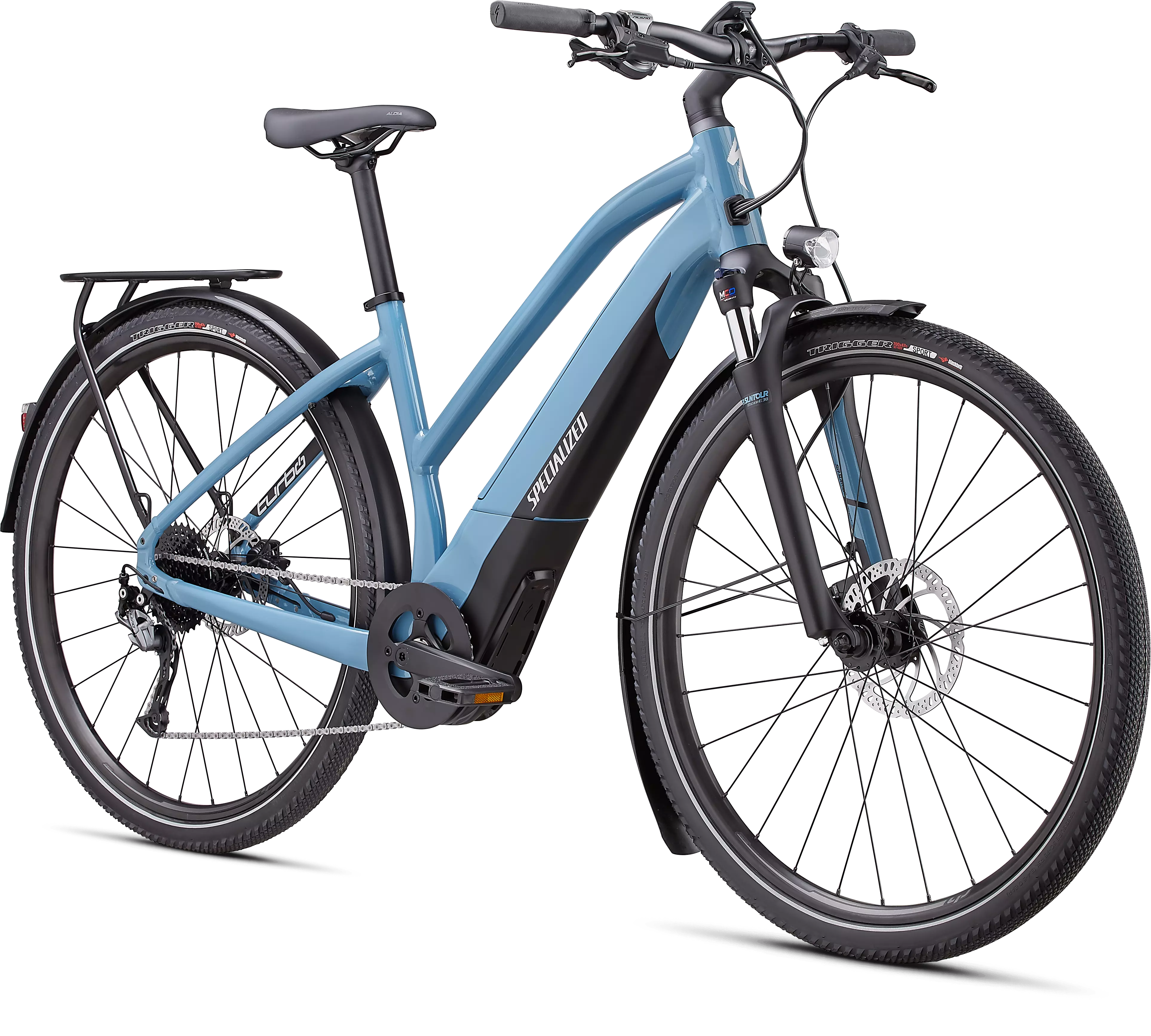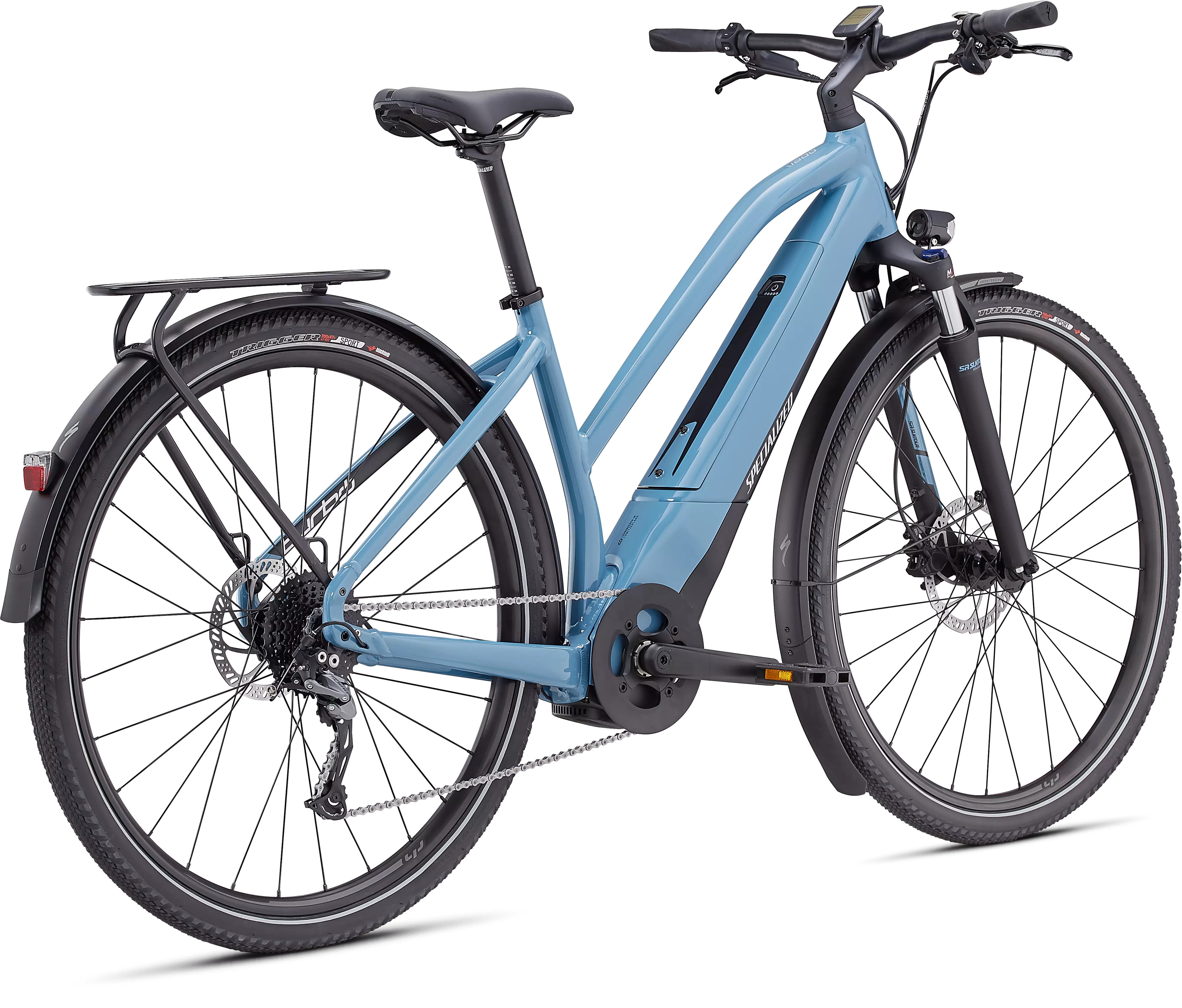 • The Turbo Vado frame features an alloy step-through frame that's pretty light and super easy to get on or off of.