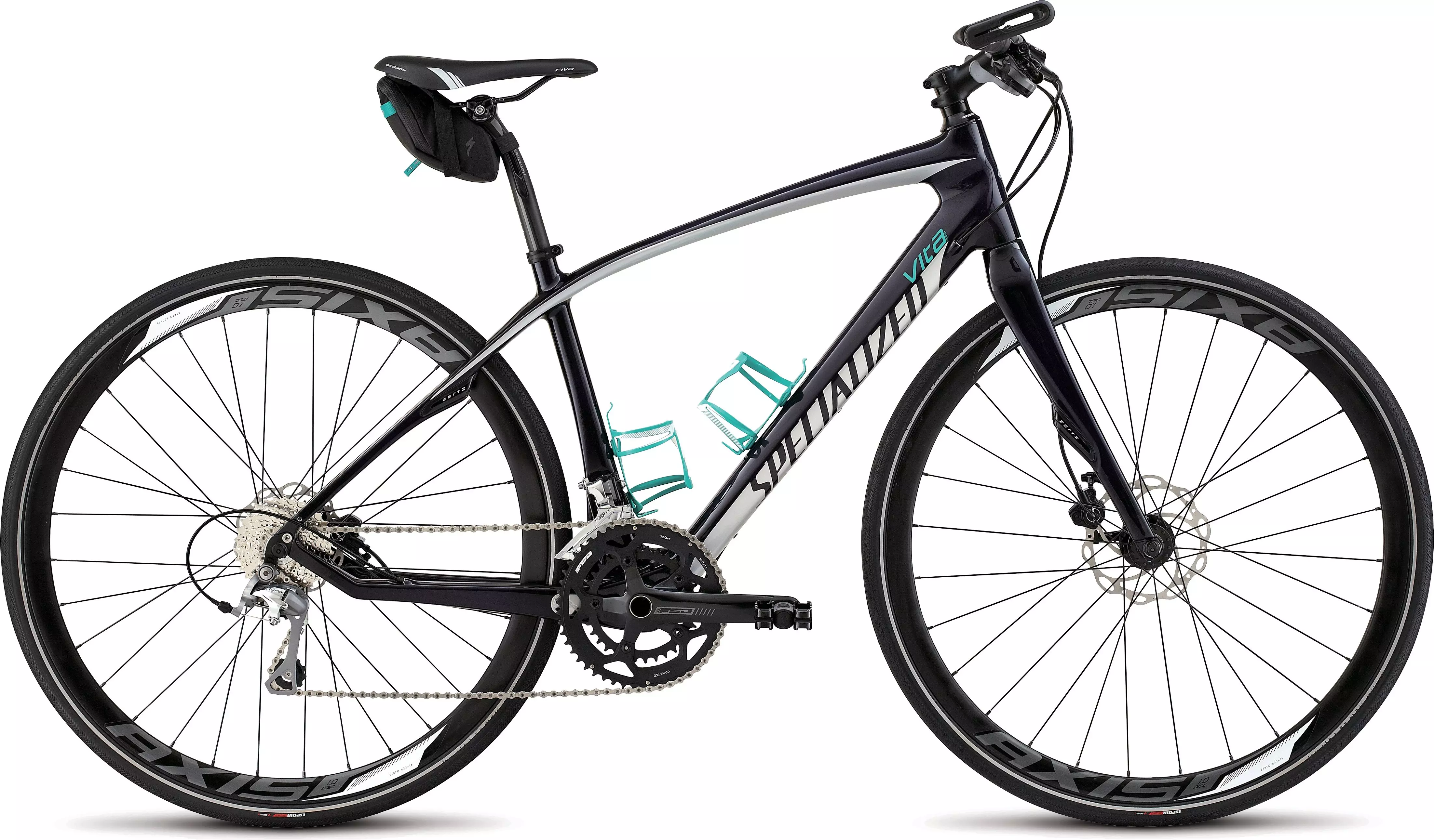 Delivering the performance of the world's best road bikes in a flat-bar, fitness-friendly form, Vita redefines the notion of versatility. The Vita Comp Carbon Disc EQ has a lightweight carbon frame with Women's Fitness Geometry, plus Zertz for a fast and efficient ride, and comes equipped with bottle cages and a seat bag to get you out there, right away. The 2x10 FSA/Shimano Tiagra drivetrain is lightweight and provides flawless shifting.