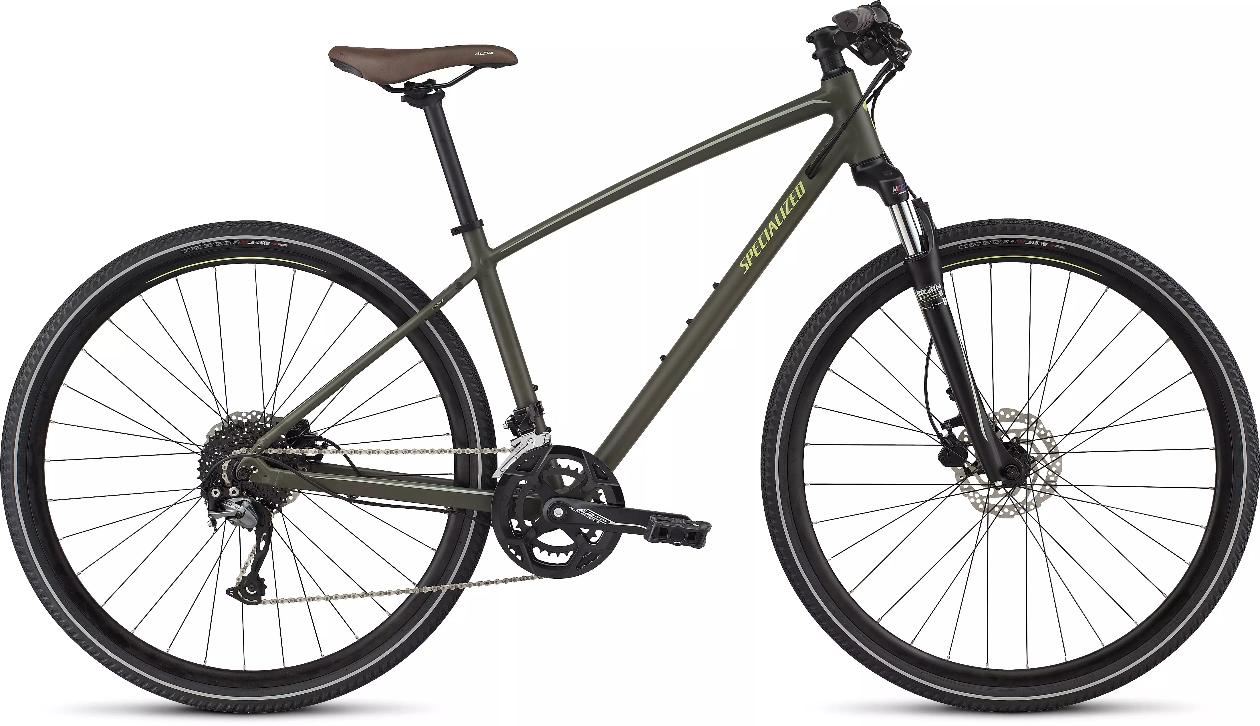 Specialized A1 SL Premium Aluminum, Fitness Geometry, fully-manipulated butted tubing, internal cable routing, flat mount disc, rack & Plug + Play mounts