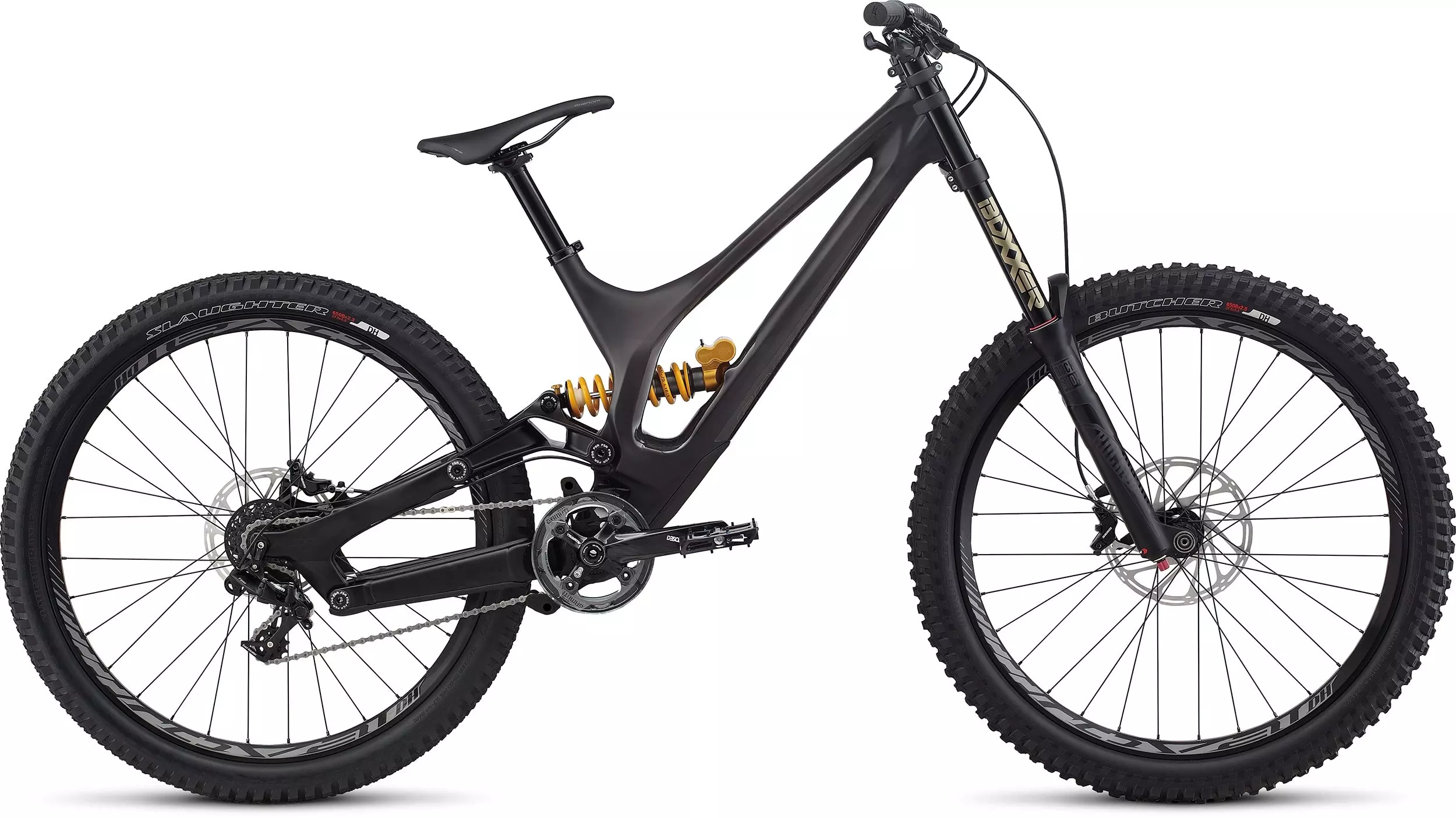 Pour la rigidité, la légèreté et la robustesse requises en descente, rien ne vaut un cadre en carbone. C'est pourquoi nous avons utilisé notre carbone haut de gamme FACT 10m pour créer le Demo 8 Carbon. Cette machine plébiscitée par les descendeurs utilise notre géométrie S3 650b, qui se distingue par un tube horizontal plus long pour plus de contrôle, des bases ultra courtes pour l'agilité, un boîtier de pédalier bas pour la stabilité et un angle de direction relativement ouvert qui offre une réactivité et une stabilité incomparable à haute vitesse. Pour la suspension, elle offre 200 mm de débattement à l'avant et à l'arrière via une fourche RockShox BoXXer RC 650b et notre amortisseur arrière Öhlins révolutionnaire. De quoi dévaler tous les terrains en toute confiance. Ajoutez à cela de puissants freins SRAM Guide R, une robuste transmission SRAM monoplateau et nos légendaires pneus Butcher & Slaughter DH et vous commencez à saisir pourquoi nos Demo 8 ont si souvent terminé la course en tête.
