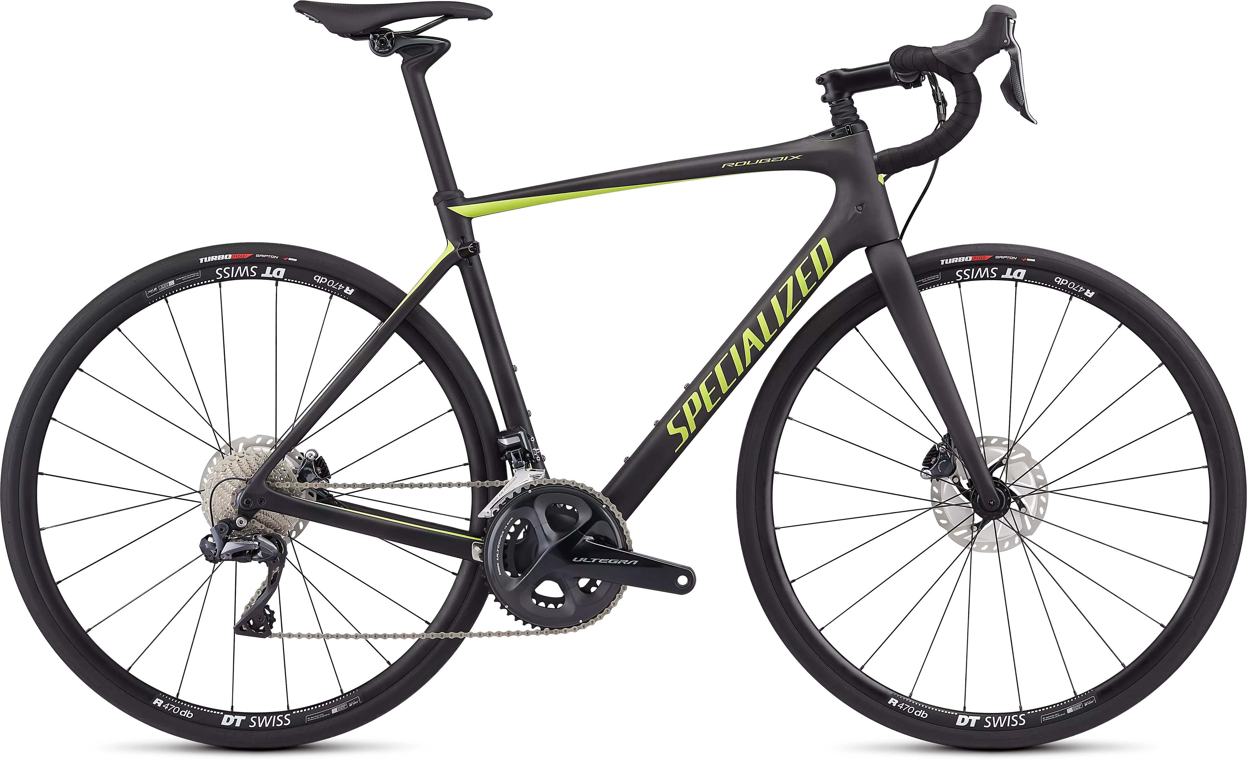 Ce Roubaix Comp est équipé de la nouvelle transmission Shimano Ultegra 8050 Di2, de freins à disque hydrauliques 8070 et de roues DT R470 Disc en aluminium.