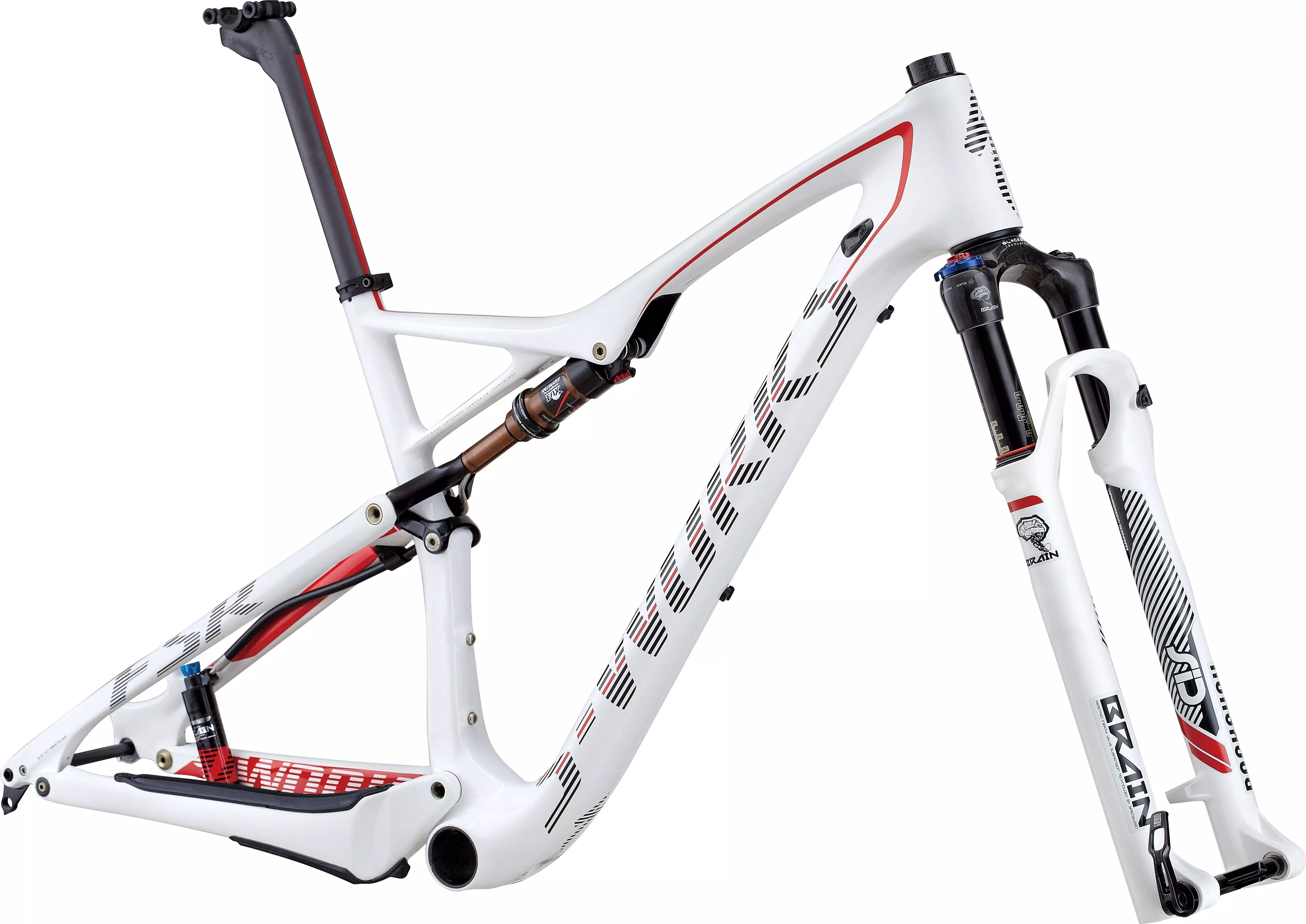 Custom RockShox SID World Cup 29 Brain, inertia valve damper, Solo Air spring, tapered carbon crown/steerer, top-mount Brain Fade and rebound adj., 15mm thru-axle, 95mm travel