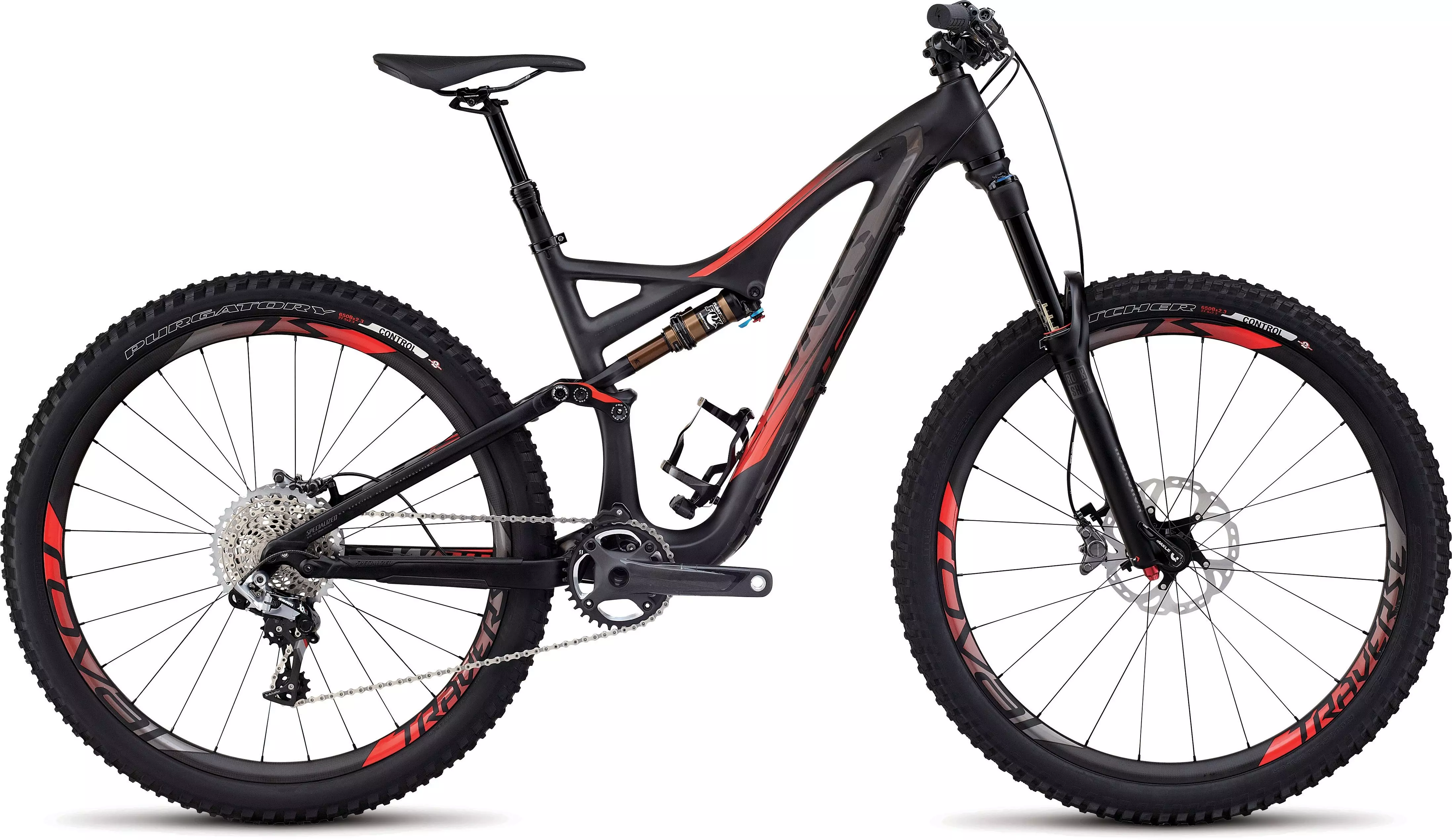 The world's most capable 650b trail bike, the full-FACT carbon S-Works Stumpjumper FSR Carbon 650b has 150mm of plush and efficient FSR suspension, a FOX CTD Factory shock with AUTOSAG, custom RockShox Pike RCT3 650b fork, and new carbon Roval Traverse Fattie wheelset.