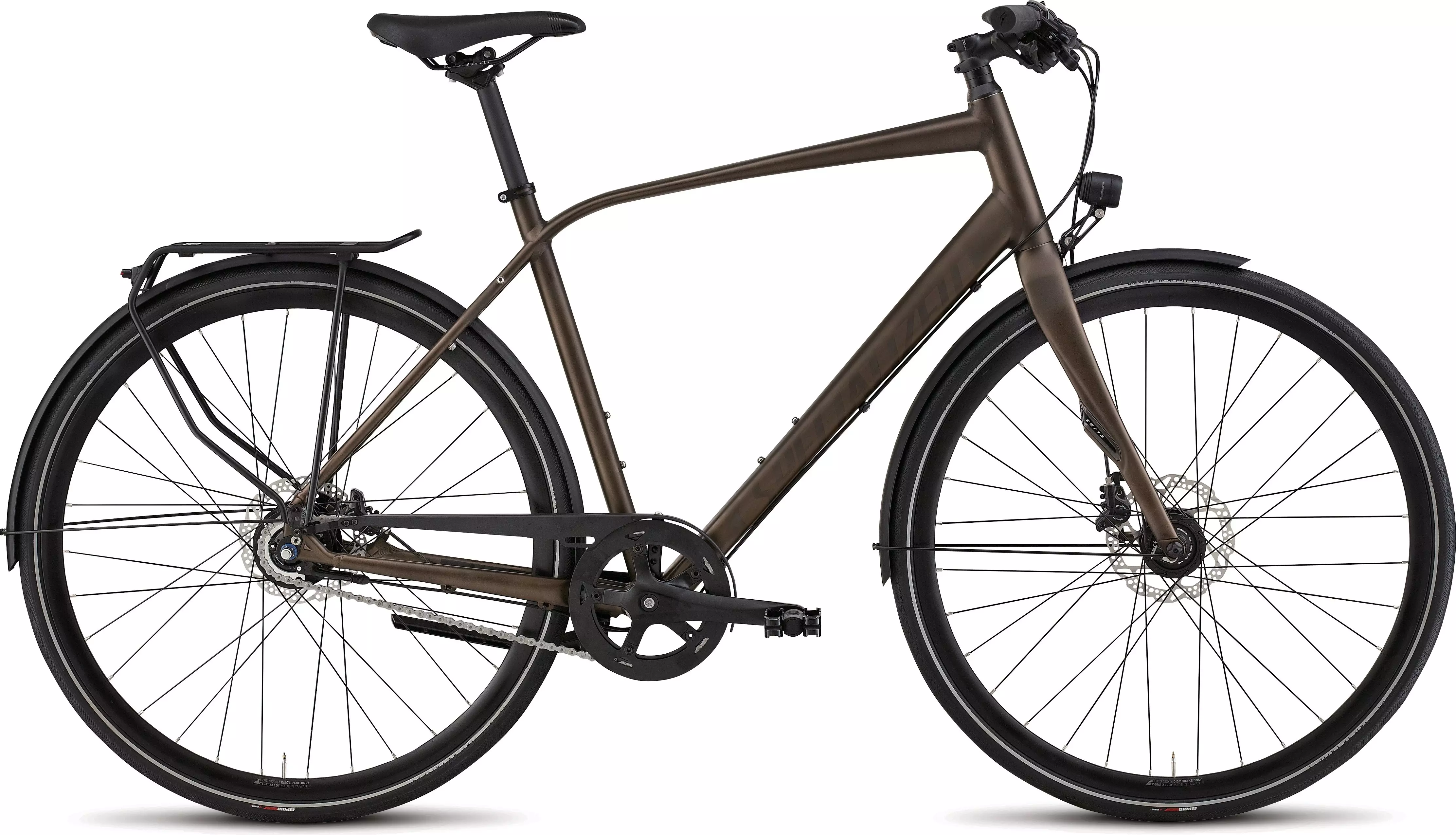 Specialized E5 Premium Aluminum, fully-manipulated tubing w/ smooth welds, compact design, integrated headset, internal cable routing, fender/rack mounts, kickstand mount, eccentric BB adjuster
