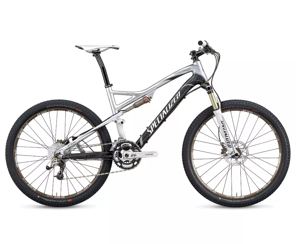 Specialized 100mm-travel E100 Future Shock fork with Brain Fade adjustment to match bump performance to rear Mini Brain. FACT carbon 1.5/1.25 steerer/crown assembly helps to make the E100 the lightest and stiffest performance mountain fork available.