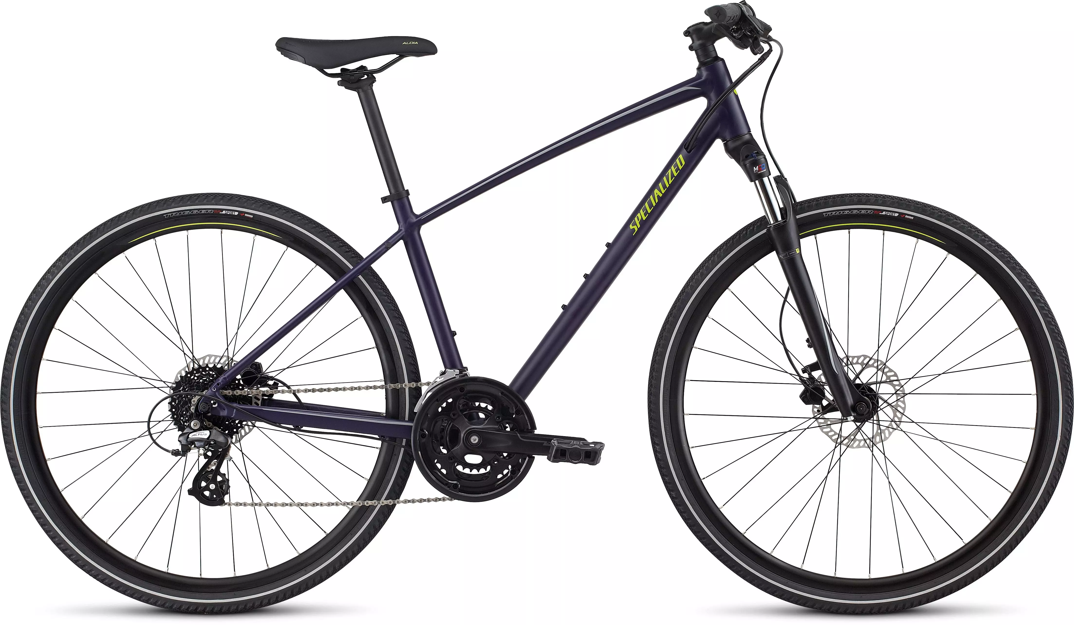 Specialized A1 SL Premium Aluminum, Fitness Geometry, fully-manipulated butted tubing, internal cable routing, flat mount disc, rack & Plug + Play mounts