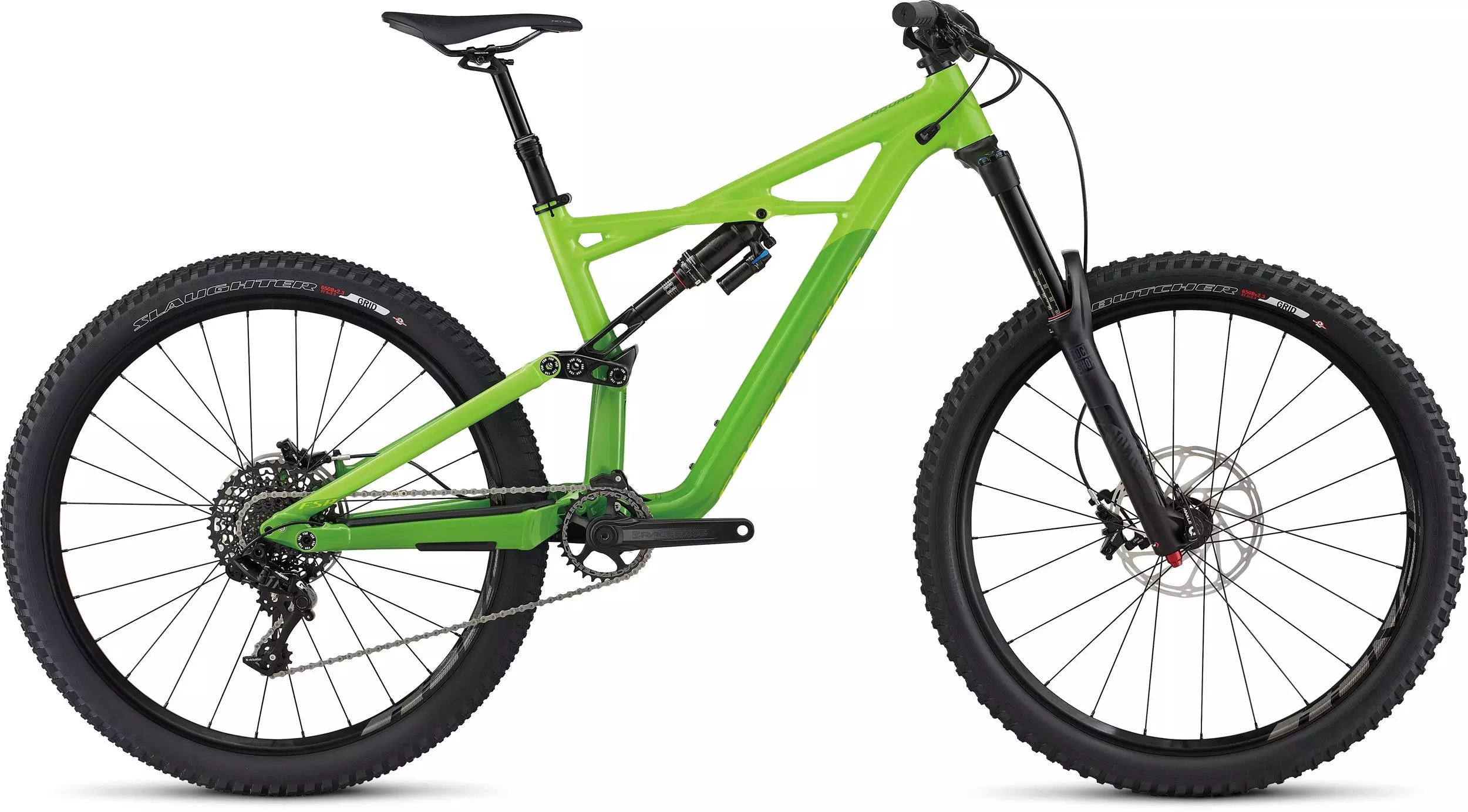 Nimble, flick'able, agile—whatever you want to call it, our Enduro Comp 650b embodies it in one hell of a beautiful, redesigned alloy package. We gave it a whole new geometry, with a slacker front end, a longer top tube, even shorter chainstays, and a lower bottom bracket. All of this together makes the bike truly feel glued to the ground, and the platform is more responsive and capable then ever. We even made ''old'' new again by making a triumphant return to a threaded bottom bracket. To make the Enduro capable of standing up to any trail, the frame is constructed with our legendary X-Wing layout and M5 alloy. And to ensure top-level performance on the descents, this material choice is greeted by 170mm of plush travel at both the front and rear. And handling suspension duties out back is the talk of the town rear shock, the RockShox Monarch Plus with our Rx Trail Tune. For the build, this Enduro is packed with drool-worthy gear, like SRAM one-by 11-speed shifting, powerful Guide R brakes w/ S4 calipers, stupid-fast Roval wheels, and a RockShox Yari fork up front.