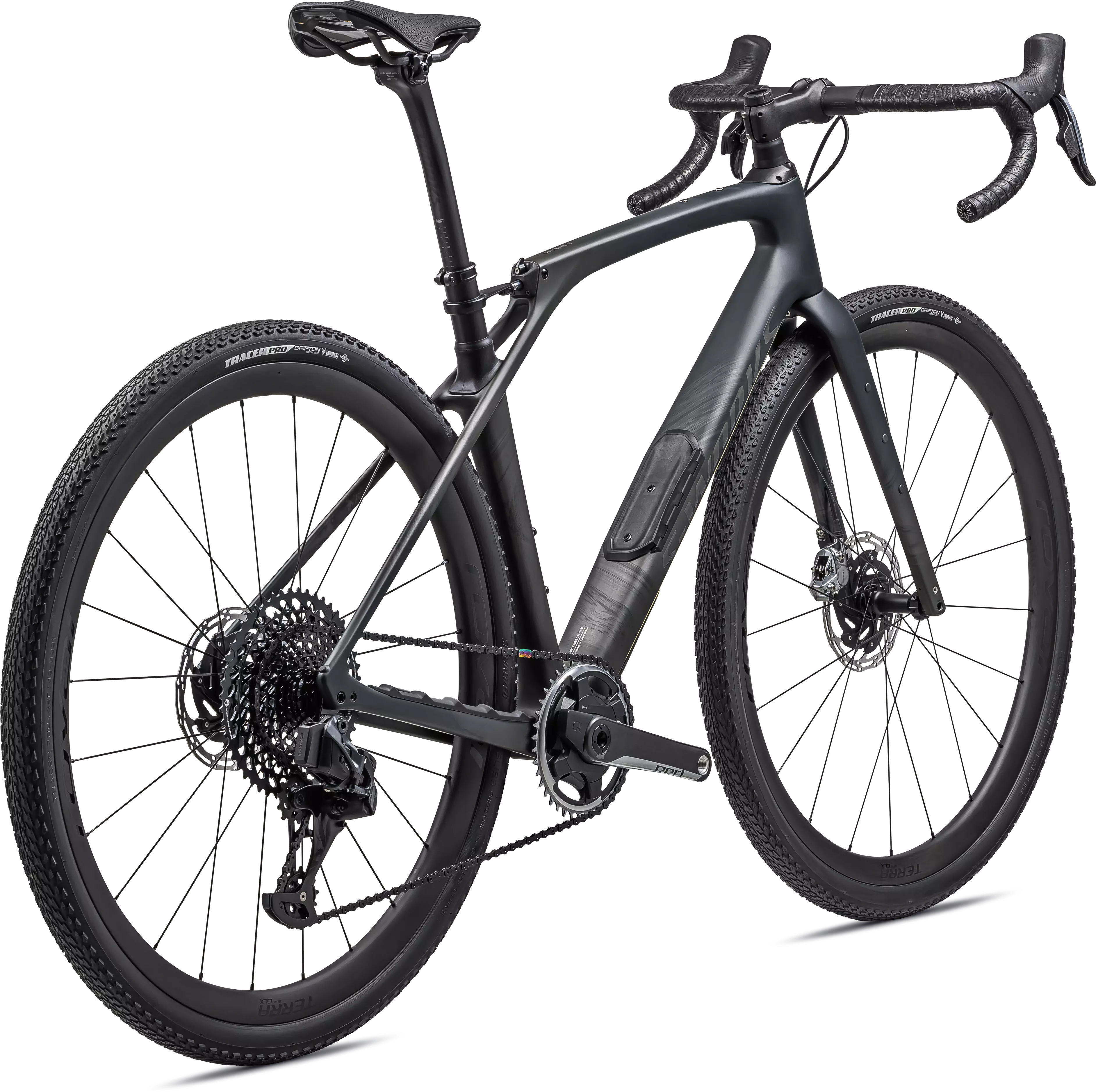 Con la suspensión delantera y trasera Future Shock, la nuevo Diverge STR ofrece todo el rendimiento sin concesiones. Al suspender al ciclista, en lugar de la bicicleta, la tecnología Future Shock aumenta el control y la eficiencia al tiempo que disminuye la fatiga, por lo que montarás más lejos y más rápido sobre terrenos bacheados, incluso más de lo que creías posible. Y la Diverge STR lo hace sin el peso, la respuesta lenta a la pedalada y la ineficiencia de otros sistemas de suspensión. La S-Works Diverge STR comienza con nuestro cuadro de carbono FACT 11r con suspensión Future Shock delantera y trasera. Está montada con el grupo SRAM Red eTap AXS Eagle que proporciona cambios rápidos y eficientes con un casete 10-50 para garantizar que tengas el desarrollo perfecto para abordar cualquier ruta y un medidor de potencia Quarq que te ayuda a dosificar tu esfuerzo a la perfección. La bicicleta rueda sobre las nuevas Roval Terra CLX II más ligeras y con neumáticos Tracer Pro de 42 mm. El manillar de carbono Terra, tija de sillín de carbono S-Works y el sillín S-Works Power with Mirror completan el conjunto, lo que convierte a esta Diverge STR en la Diverge más eficiente de la historia.
