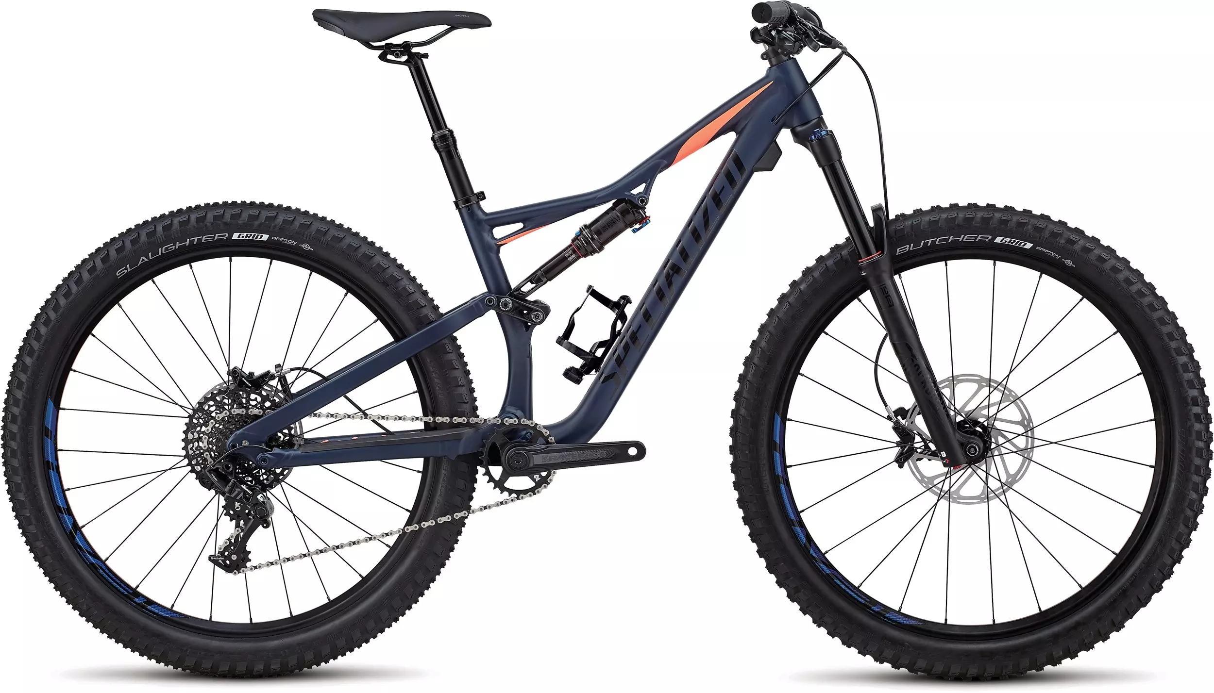 Specialized M5 Aluminum, 27.5 Trail Geometry, PF30 BB, internal cable routing, ManFu link, 12x148mm dropouts, sealed cartridge bearing pivots, replaceable derailleur hanger, 150mm of travel