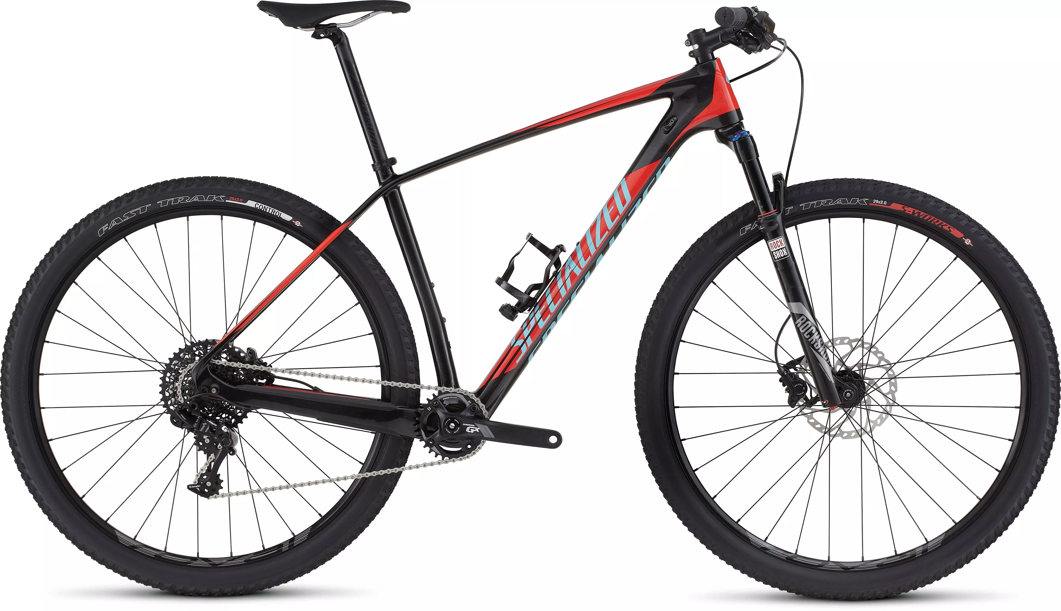 Casing the wheels is a 29x2.0" S-Works Fast Trak tire at the front and a 29x2.0" Fast Trak Control at the rear. Together, the tires provide a heightened level of fast-rolling traction and reliable protection that's well suited to the rigors of cross country racing.