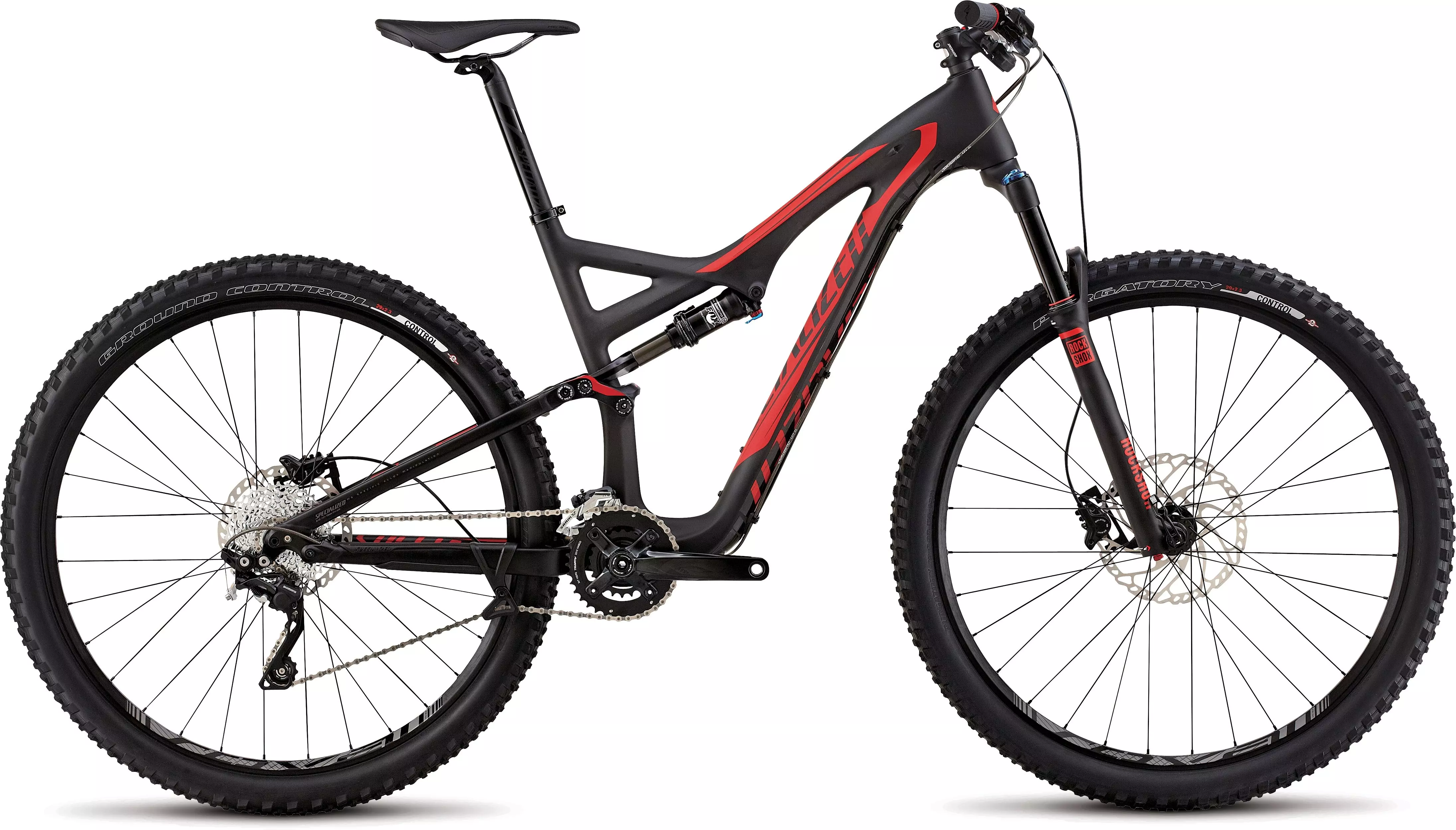 The FACT carbon Stumpjumper FSR Comp Carbon 29 has 130mm of plush FSR suspension, a RockShox Revelation RC air-sprung fork, powerful Shimano Deore hydraulic disc brakes, and custom FOX Float CTD Evolution shock with AUTOSAG.