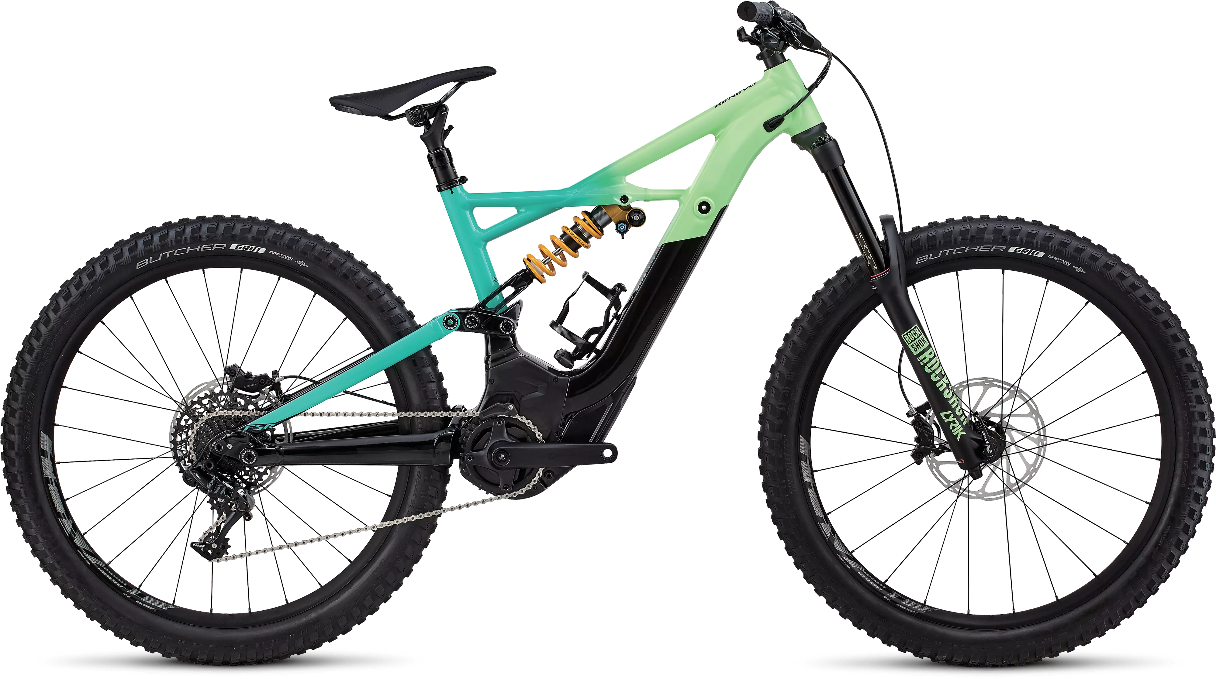 En cuanto a la batería, encontrarás que está totalmente integrada en el tubo diagonal siendo fácilmente desmontable para una carga rápida o poder intercambiarla. Tiene una larga vida útil con un largo alcance para hacer rutas largas y, junto con el motor, está estratégicamente situada para una distribución óptima de peso. También encontrarás nuestra aplicación Mission Control con todo el control de la tecnología Turbo, una pantalla Trail Display integrada que te ofrece todas las métricas que necesitas del trayecto, un mando Trail Remote que te permite cambiar fácilmente entre los modos sin quitar las manos del manillar y un medidor de potencia que muestra exactamente la cantidad de energía que está ejerciendo frente al motor. La Turbo Kenevo FSR 6Fattie presenta un montaje con todo lo que puedas desear, como el amortiguador Öhlins TTX22M de muelle, horquilla RockShox Lyrik de 180 mm de recorrido, grupo GX de SRAM uno-por y ruedas de aluminio Roval montadas a mano. También cuenta con nuestro sistema de rueda 6Fattie que disminuye la deflexión y aumenta drásticamente la tracción, flotación y diversión sobre el terreno.