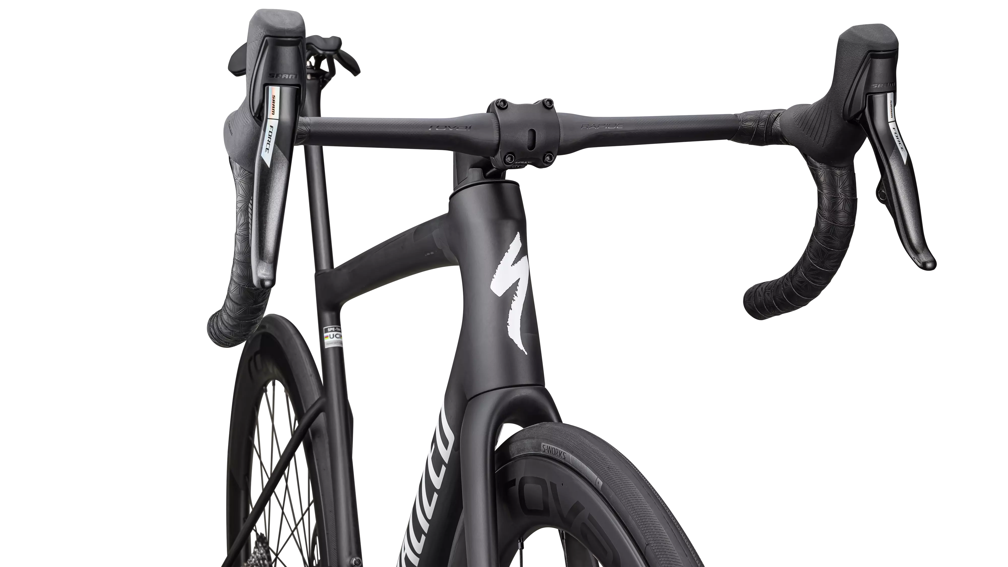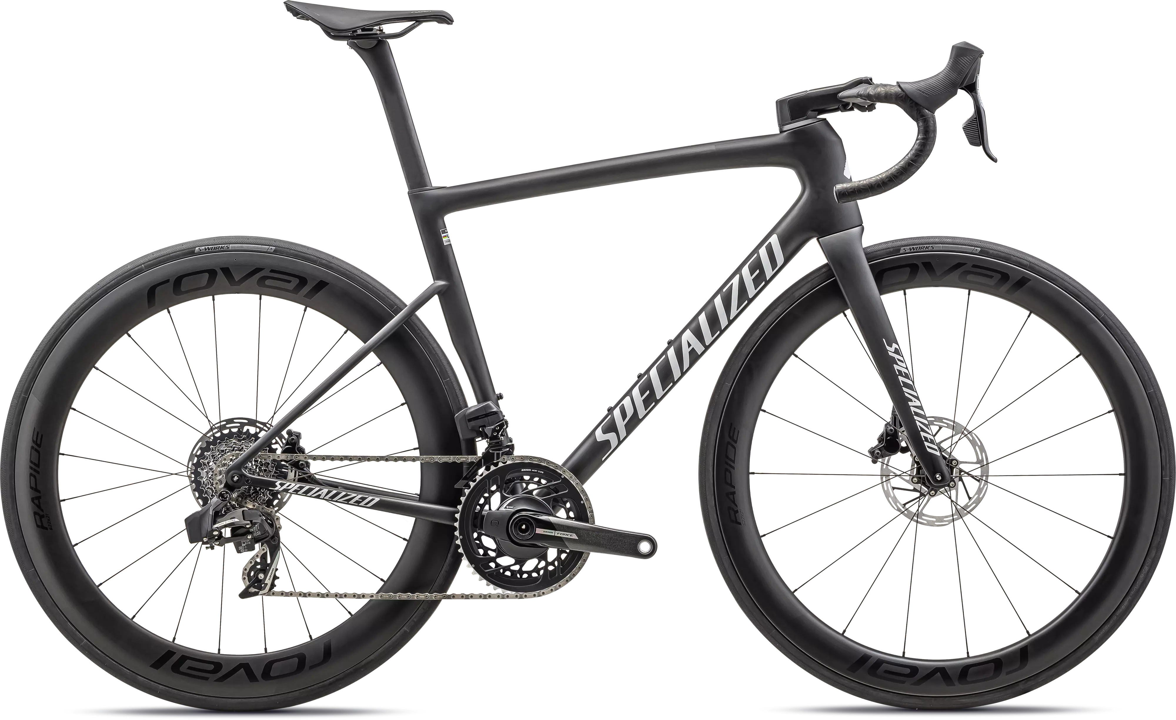 Le Tarmac SL8 Pro offre des performances exceptionnelles avec un groupe complet SRAM Force eTap AXS équipé d'un capteur de puissance, d'une paire de roues Roval Rapide CL II compatibles Tubeless et d'un cintre Roval Rapide monté avec une potence Tarmac SL7. Vous êtes prêt pour la compétition.