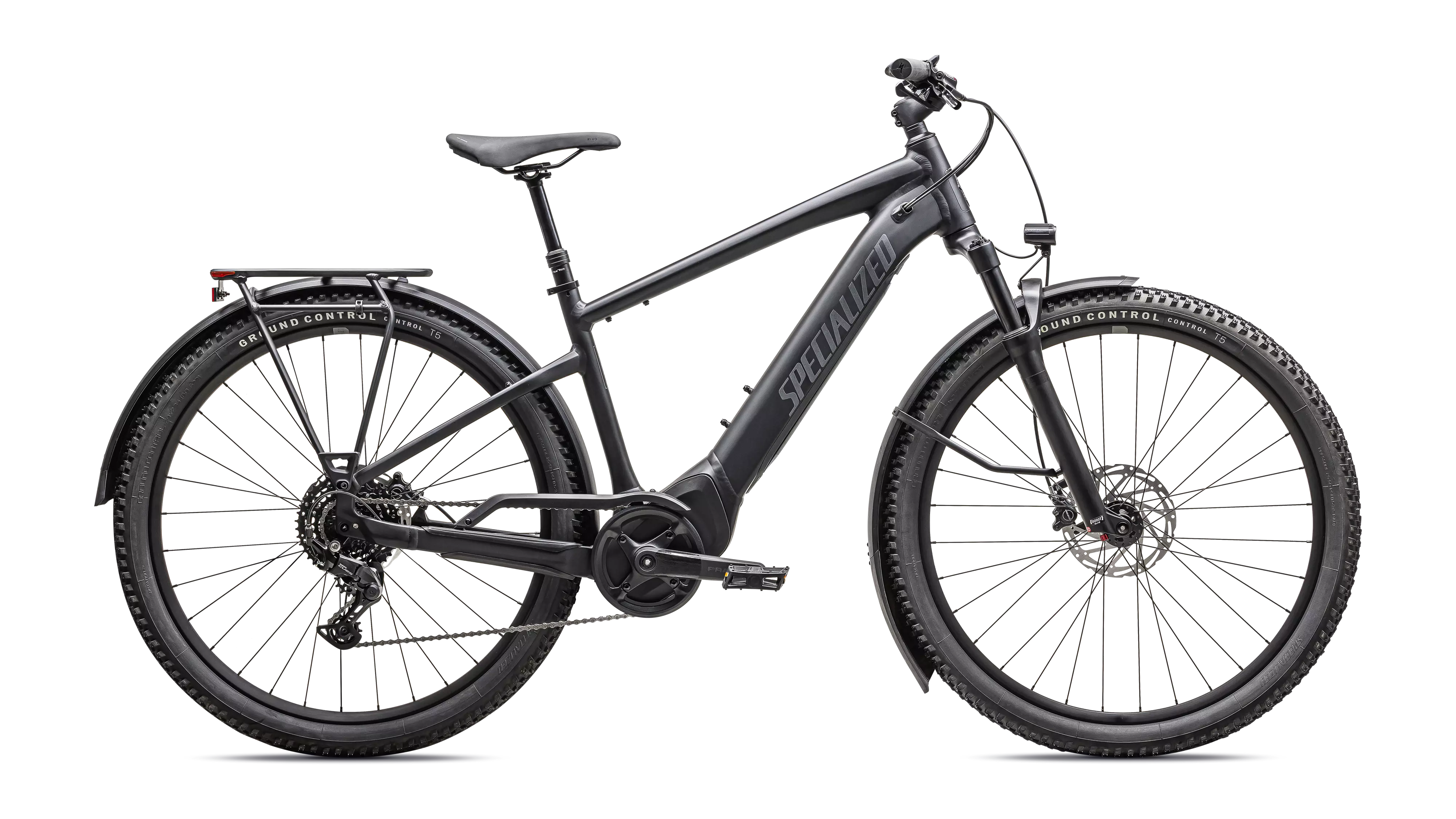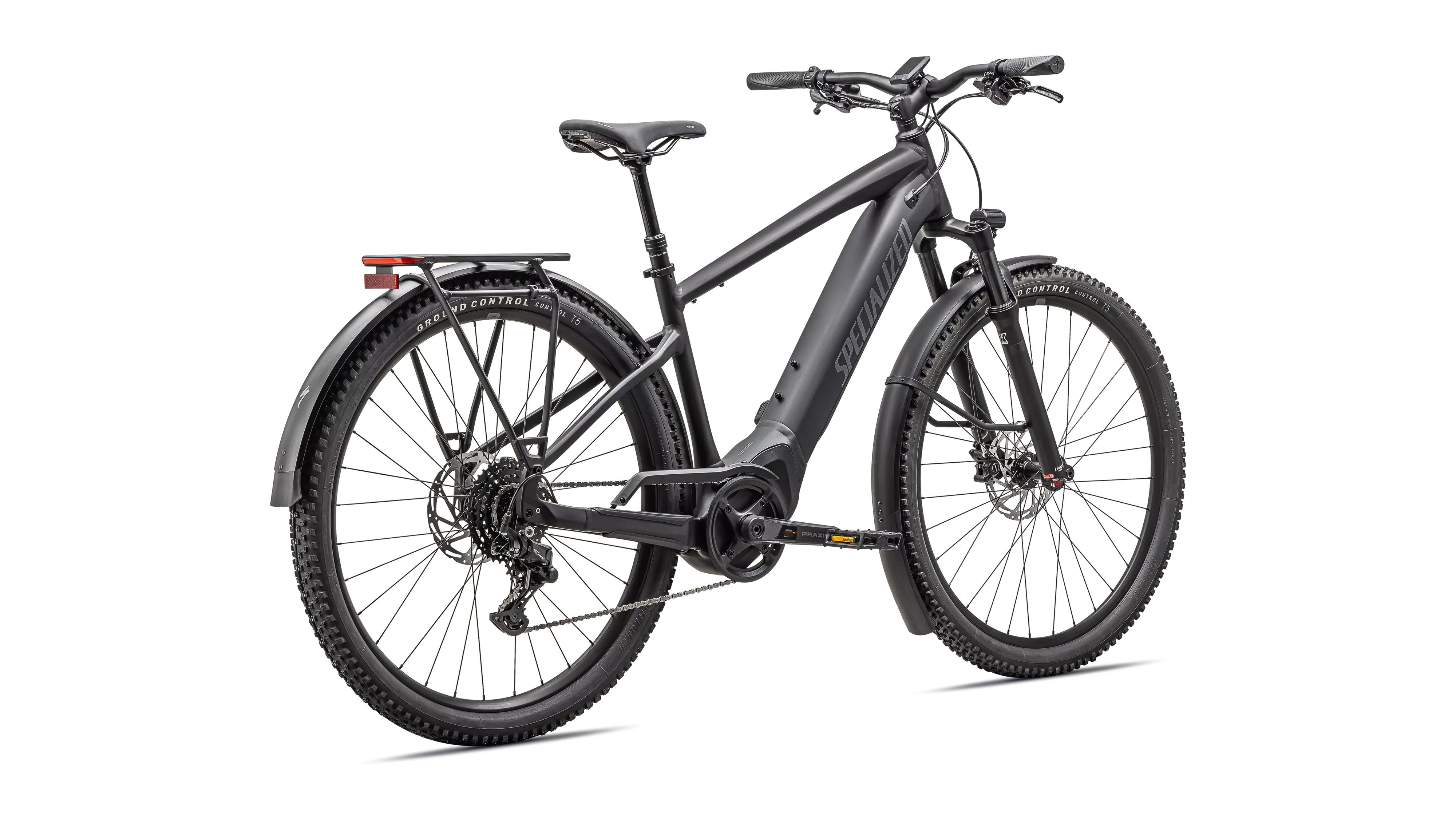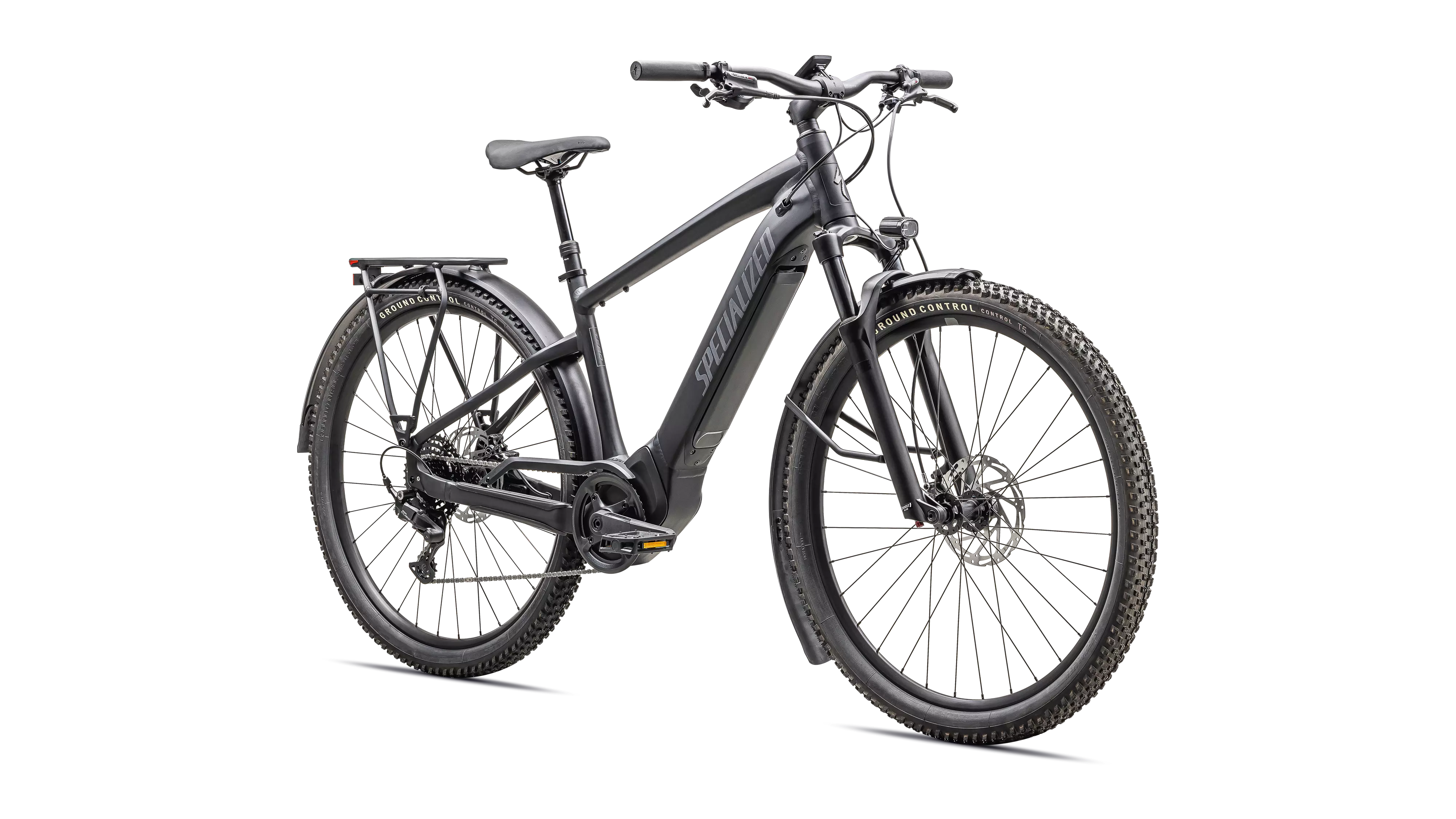 E5 Aluminum, mid-drive motor, fully integrated & lockable downtube battery, internal cable routing, wheel lock mount, and front rack compatible