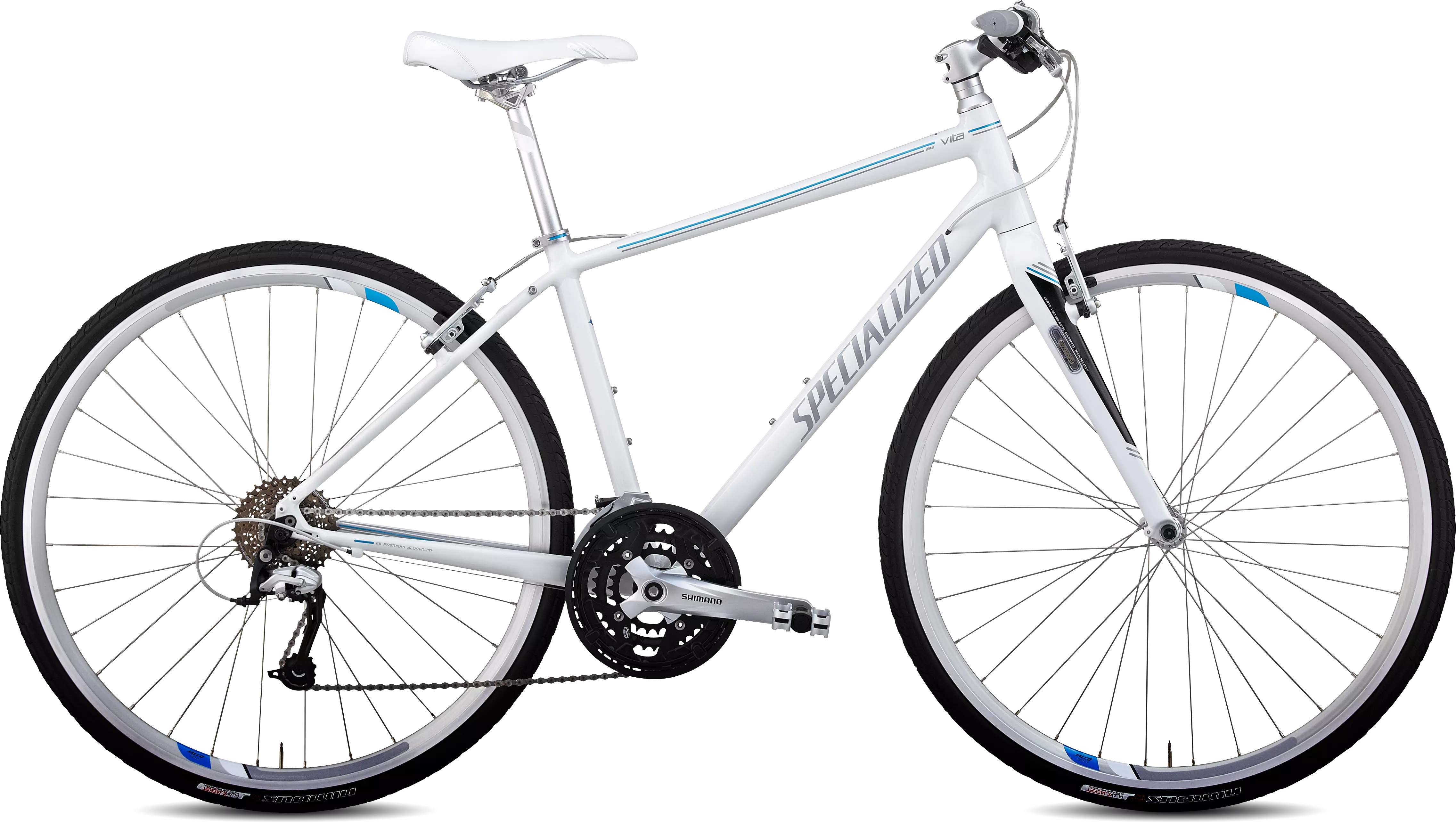 Specialized E5 aluminium, fully manipulated women's tubesets, women's fitness geometry, smooth weld, internal cable routing, integrated headset, fender/rack eyelets