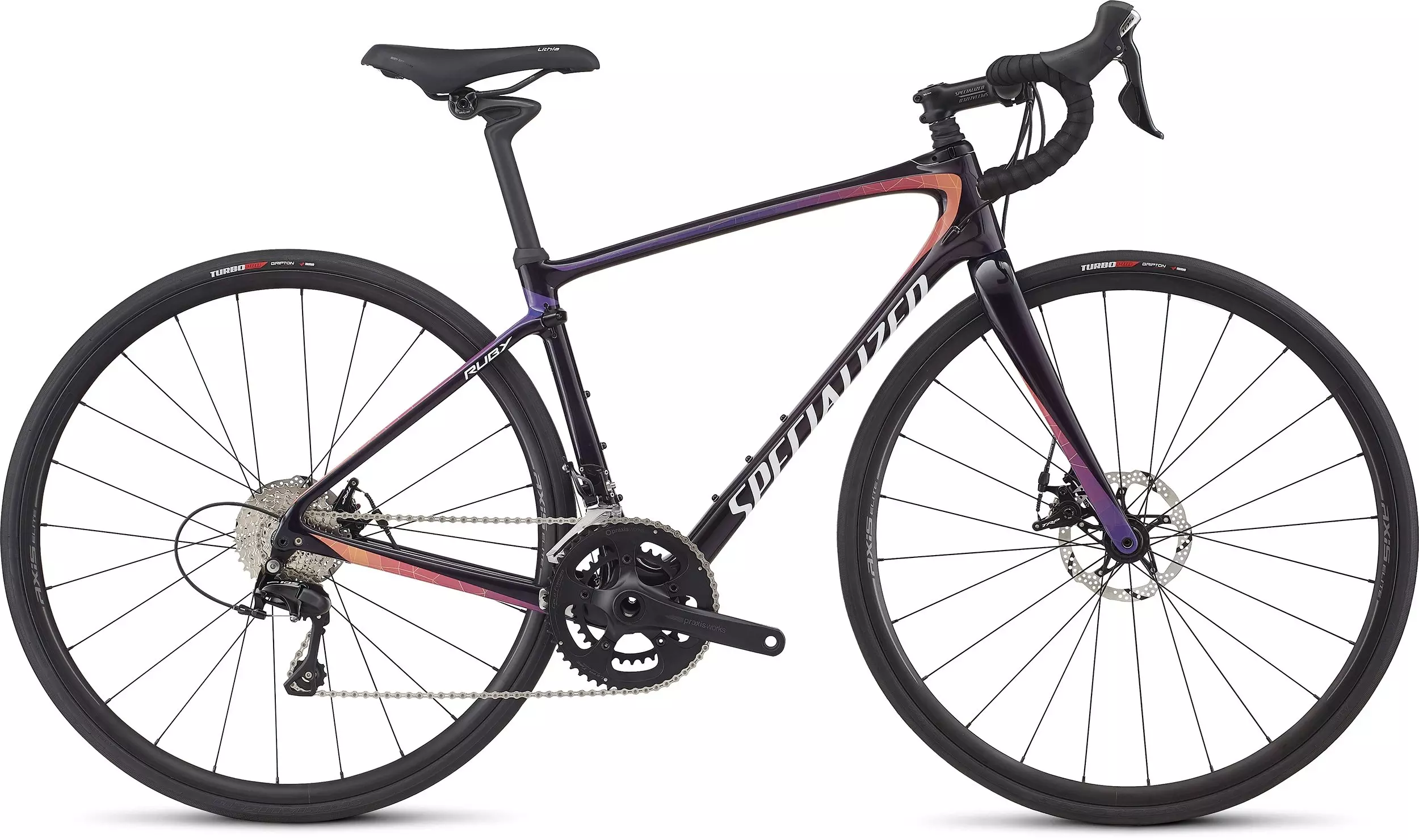 Who said that performance and comfort don't mix? It sure wasn't us, because our all-new Ruby Elite combines the two in one seamless, unprecedented package. The frame is among the lightest that we've ever made, and it's been constructed from our superlative FACT 10r carbon fibre. Its stiffness levels are also off the charts, and compared to the SL4 iteration of yesteryear, you'll experience a whole new, faster, and more efficient geometry. Through some engineering sorcery, however, we've managed to keep the same fit, feel, and position that we've all come to love from the SL4's Women's Endurance Geometry. Of course, you're probably thinking, "get on to the suspension thing up front." We call it Future Shock, and essentially, it's a piston in the head tube with 20mm of travel. We developed this technology in partnership with McLaren Applied Technologies, and the result of this are a host of drastic performance improvements, namely in the vertical compliance department. Without giving a physics lecture, we found that focusing on vertical compliance, instead of fork splay, meant that we could improve smoothness, speed, and comfort in one fell swoop. And of all the bikes that we've tested with our Rolling Efficiency Model, the new Ruby outperforms anything on the market. Lastly, we spec'd it with awesome components, like Shimano 105 shifting, hassle-free mechanical disc brakes, and a women's-specific saddle.