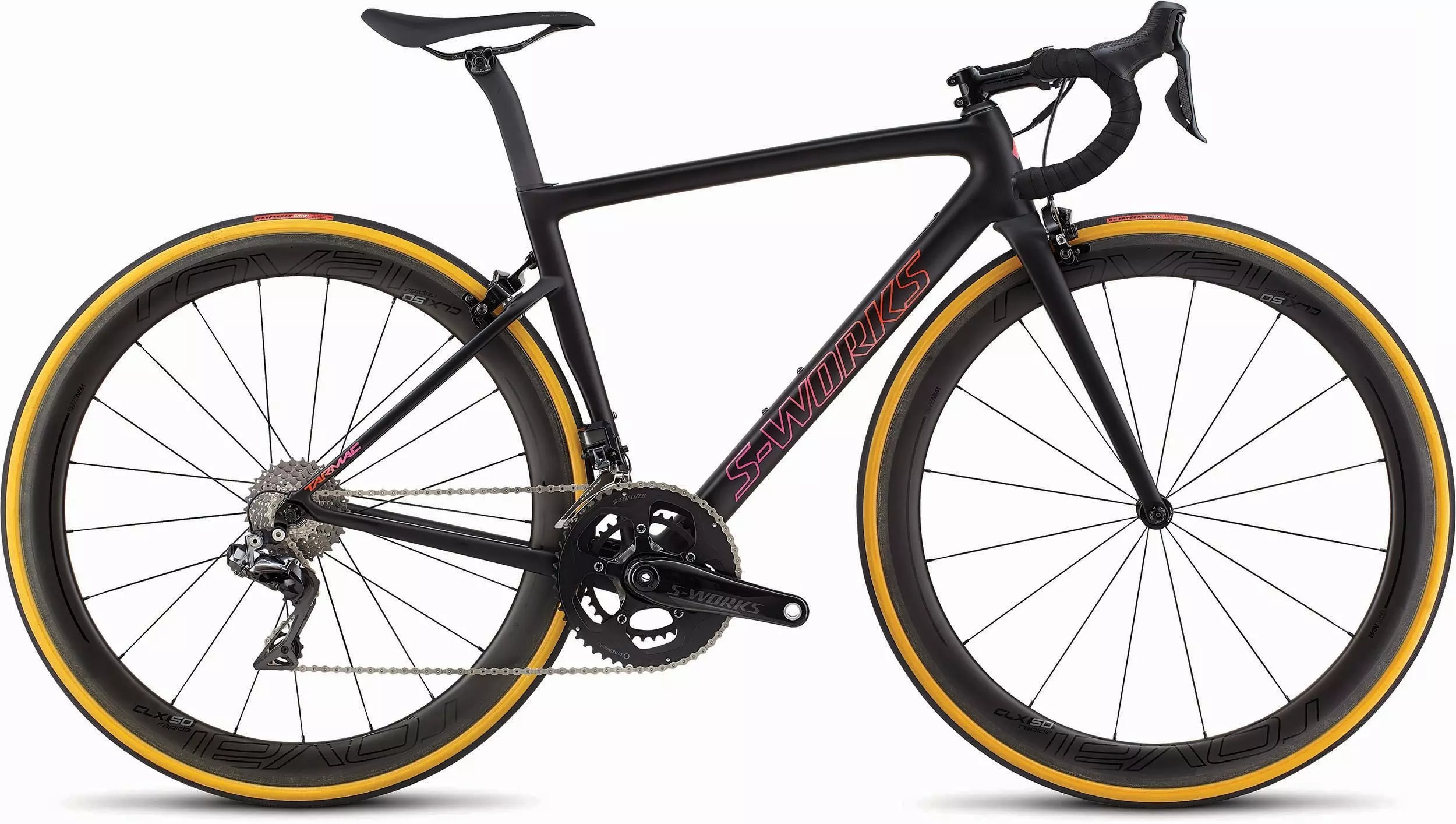 The new Women's S-Works Tarmac comes ready to race with Shimano’s new Dura-Ace 9150 Di2 groupset with direct mount brakes, our S-Works Power Cranks dual-sided power meter, and the lightweight, yet impressively aerodynamic Roval CLX 50s with 26mm Turbo Cotton tires. It's also spec'd specifically for female riders, from the handlebar width, to the crankarm length, all the way down to the saddle.