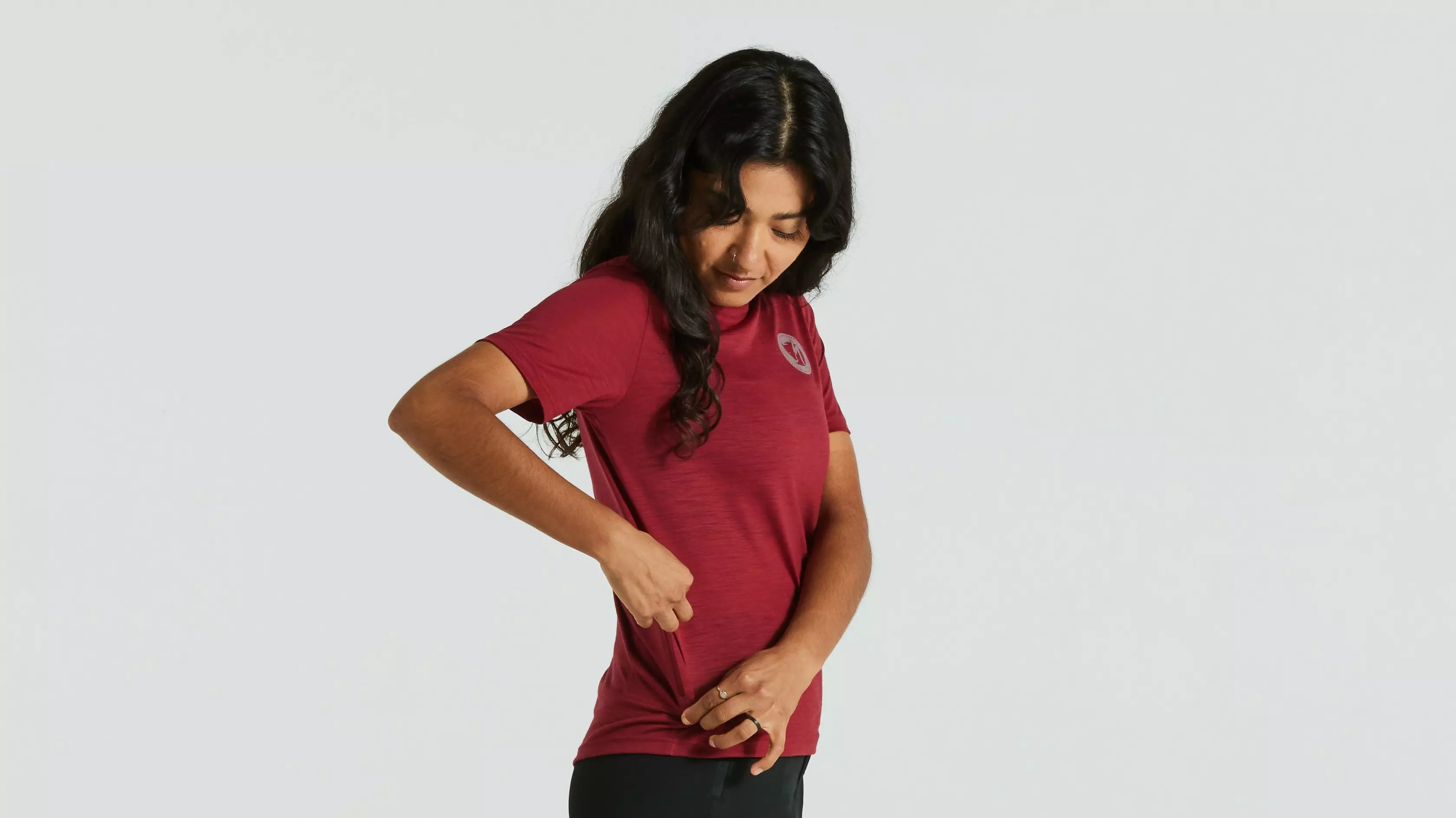 A light t-shirt in Merino wool and recycled polyester. Combines the temperature-regulating properties of wool with the durability and moisture-wicking properties of polyester. Features a Hi-Low hem that's slightly longer in the back and a zippered back pocket on the right-hand side for your keys, cash, or credit card. Slightly longer sleeves provide extra protection from the sun. Regular fit. Part of the Specialized/Fjällräven Exchange series for urban rides and bikepacking adventures.
