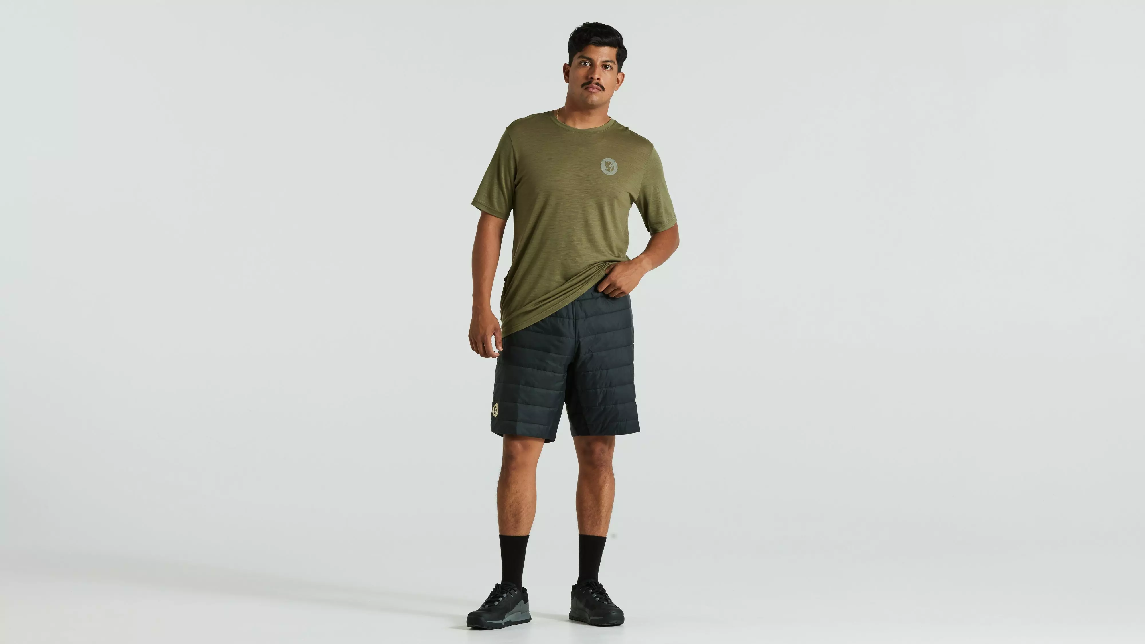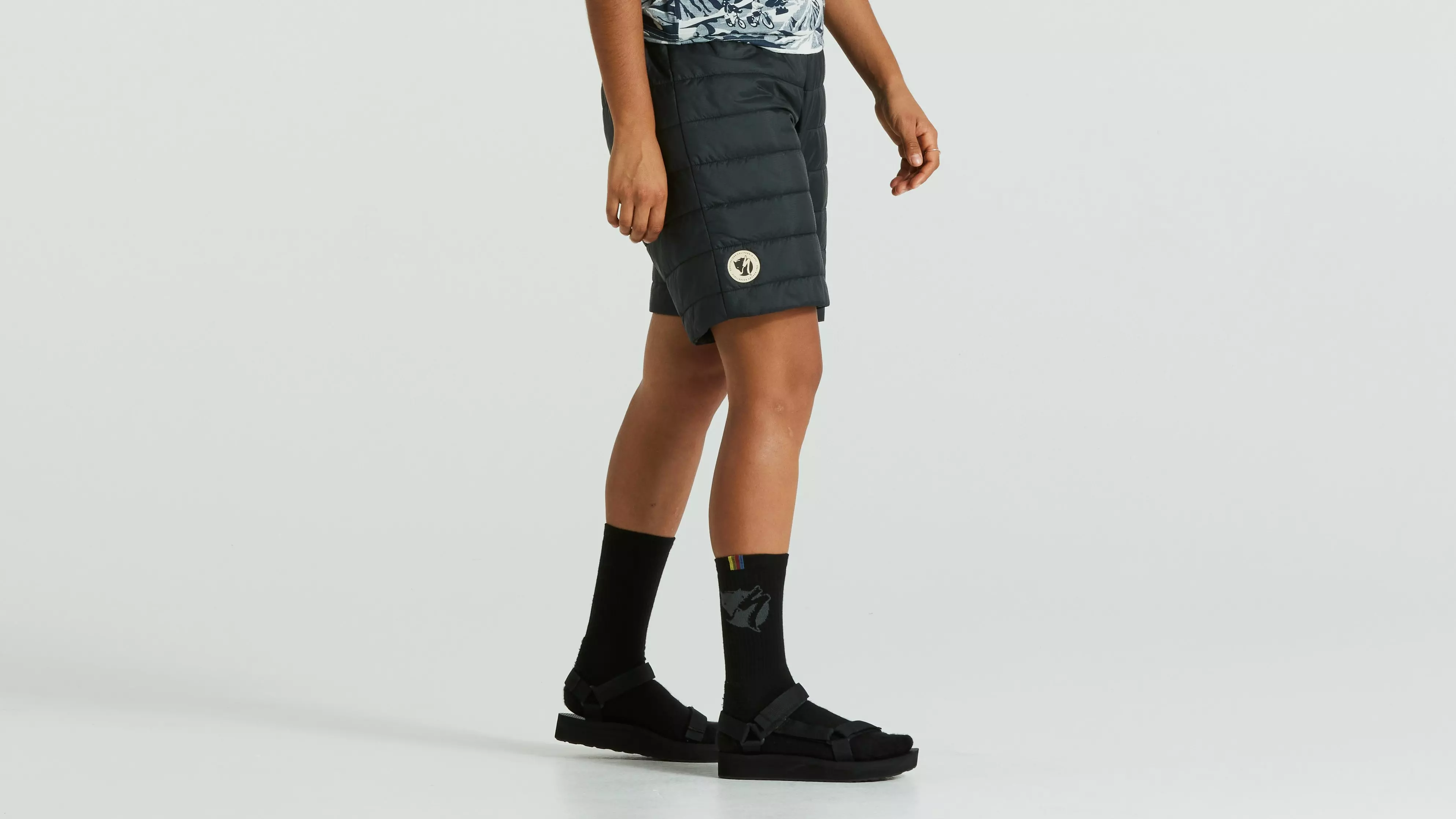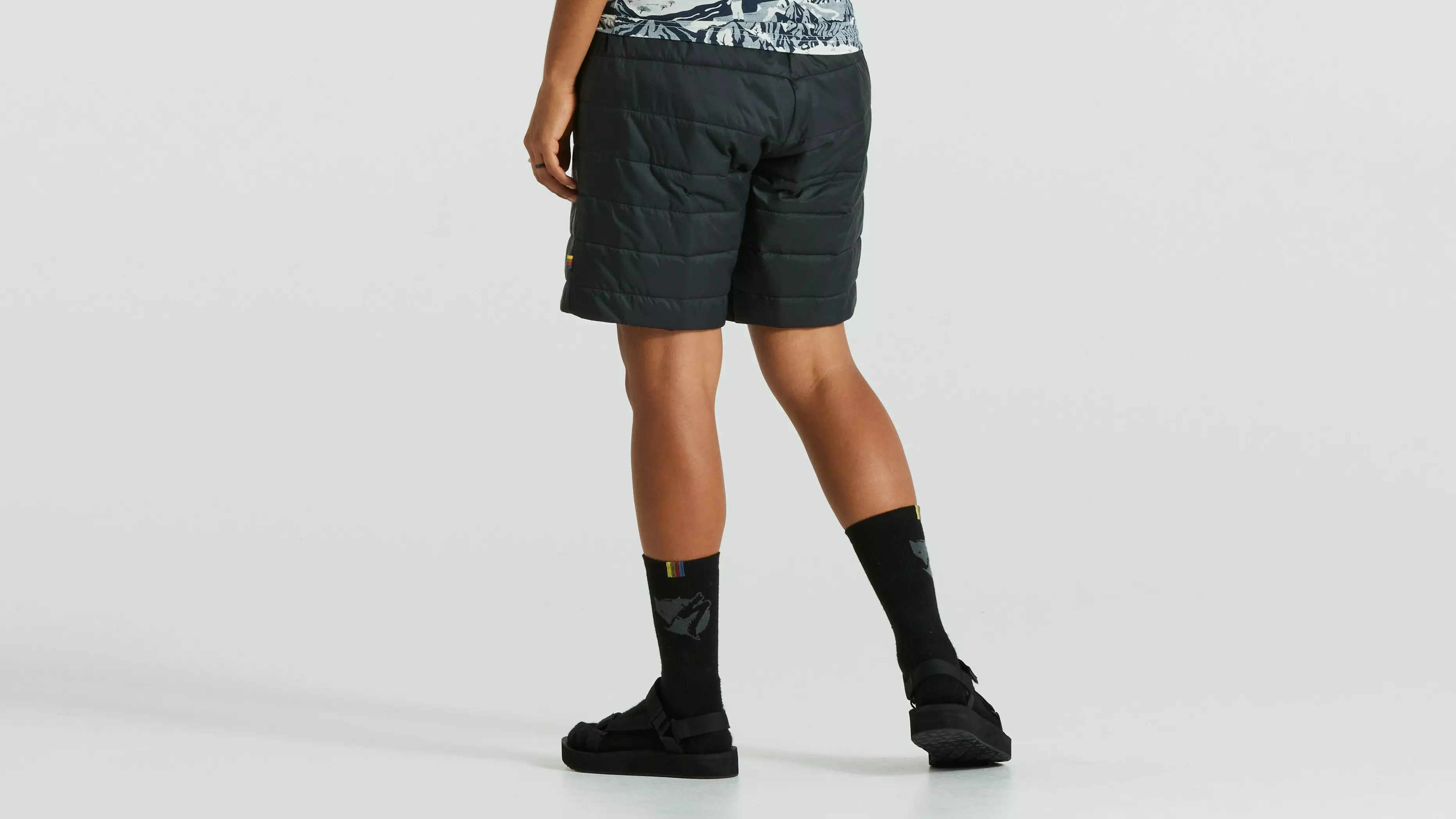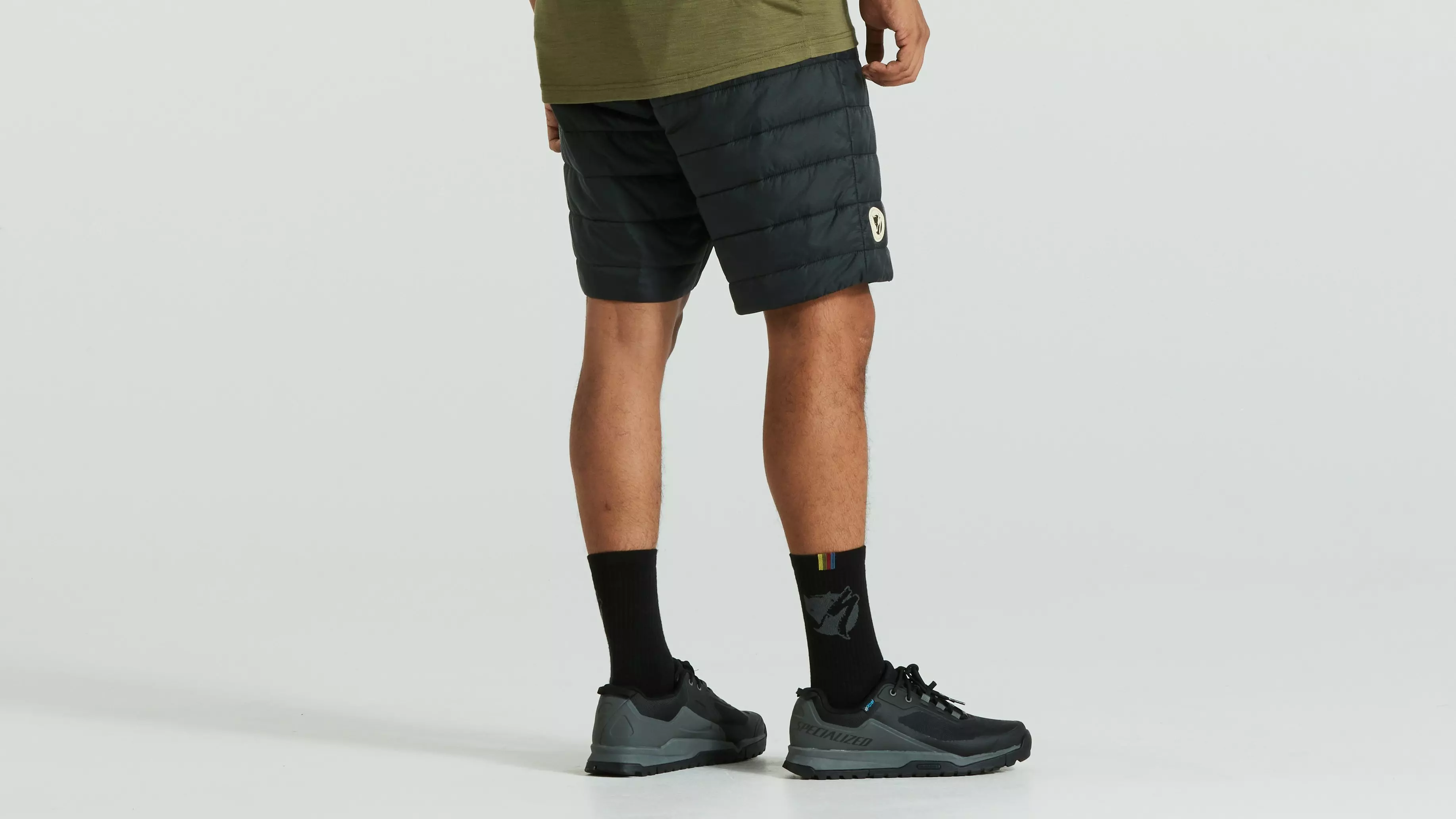 Packable, lightweight insulated unisex shorts. Lightly padded with synthetic insulation and an outer fabric in recycled polyamide. Supports the Specialized/Fjällräven Thermo Anorak and is optimized for long bike rides as a reinforcement layer for men and women. Adjustable, elastic cam-lock waistband. Unisex fit. Part of the Specialized/Fjällräven series for urban rides and bikepacking adventures.