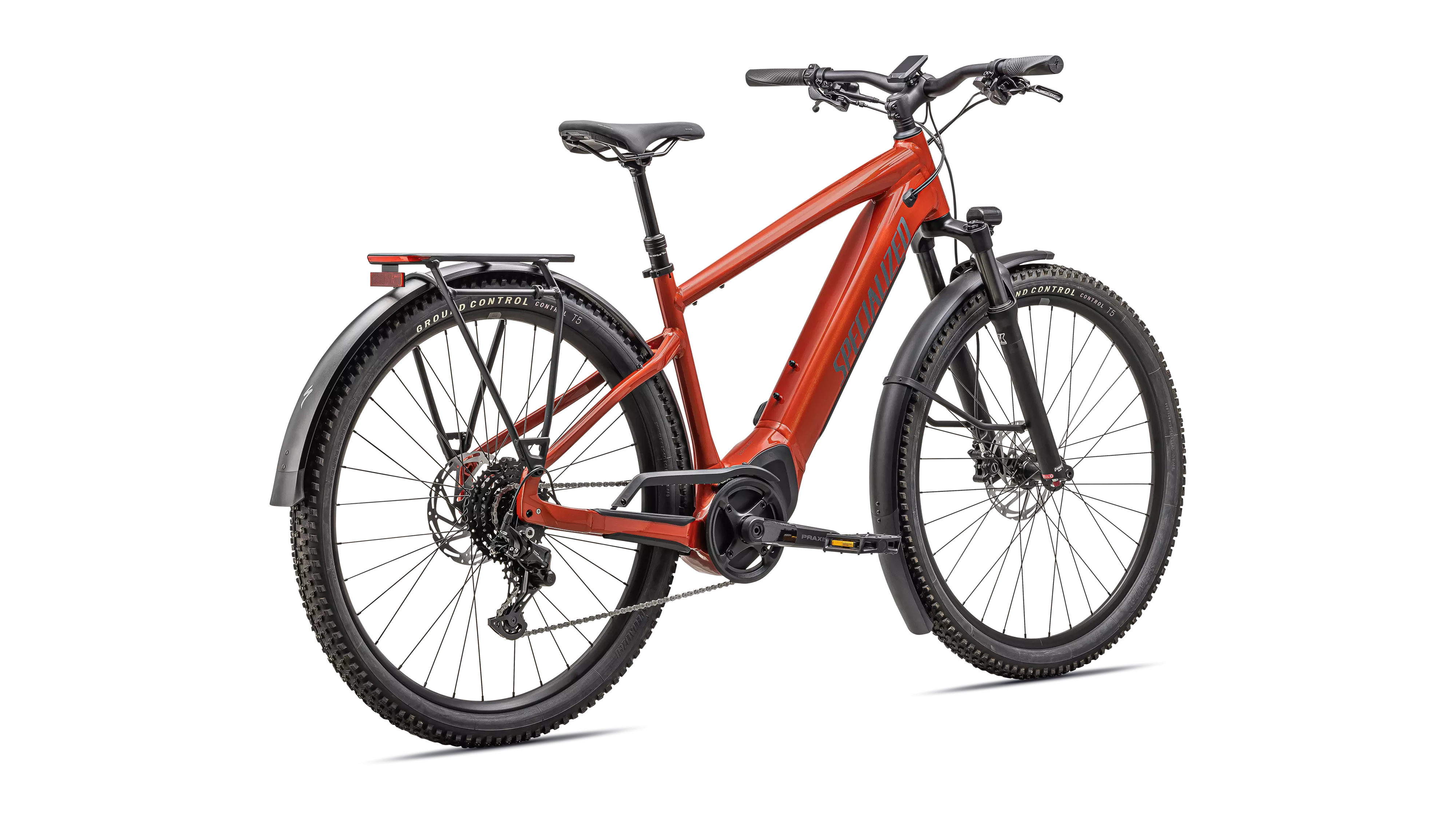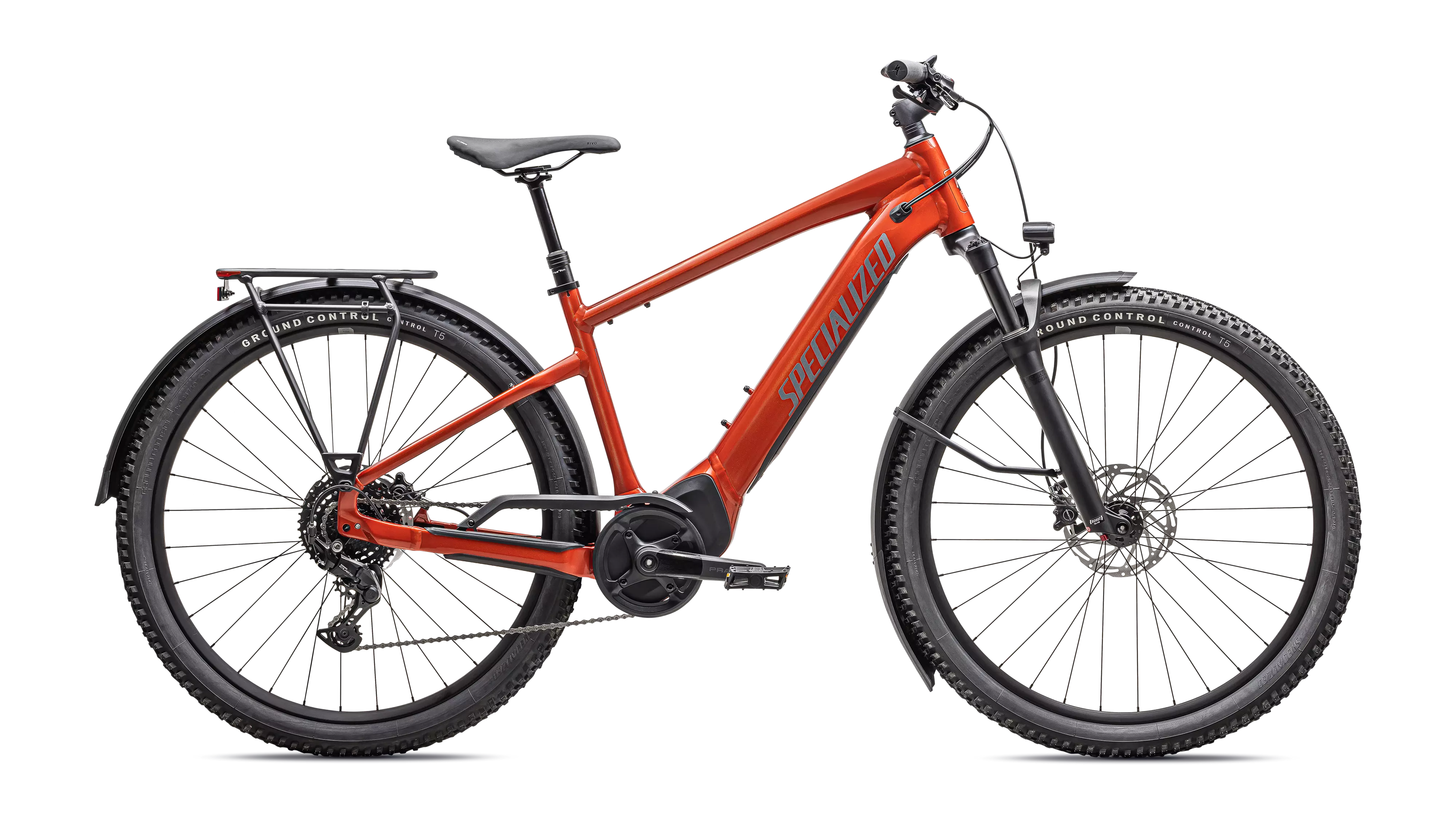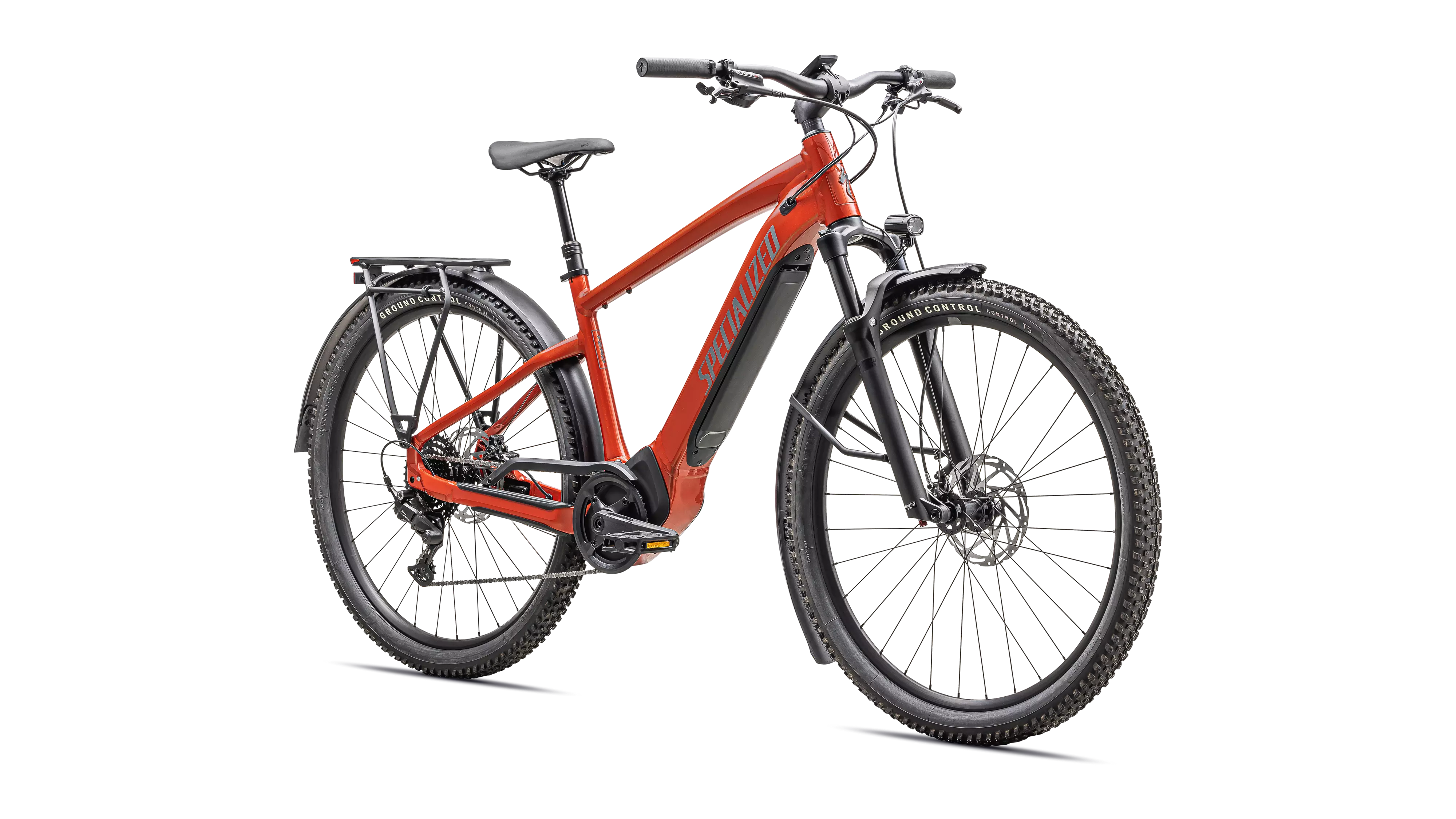 E5 Aluminum, mid-drive motor, fully integrated & lockable downtube battery, internal cable routing, wheel lock mount, and front rack compatible