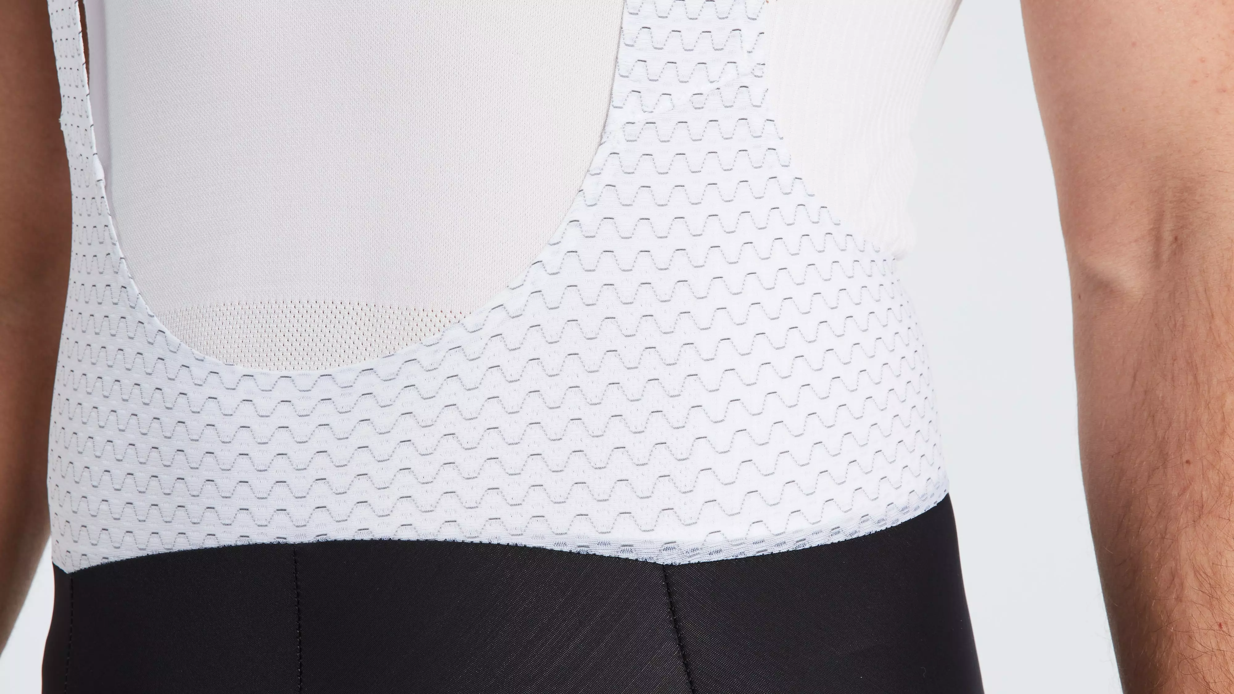 溶着ビブアッパー構造は、縫い目をなくすことで摩擦を減らし、フィット感を高めます。ビブのアッパー生地は、抗菌と体温調節効果を持つ炭素繊維糸を採用します。