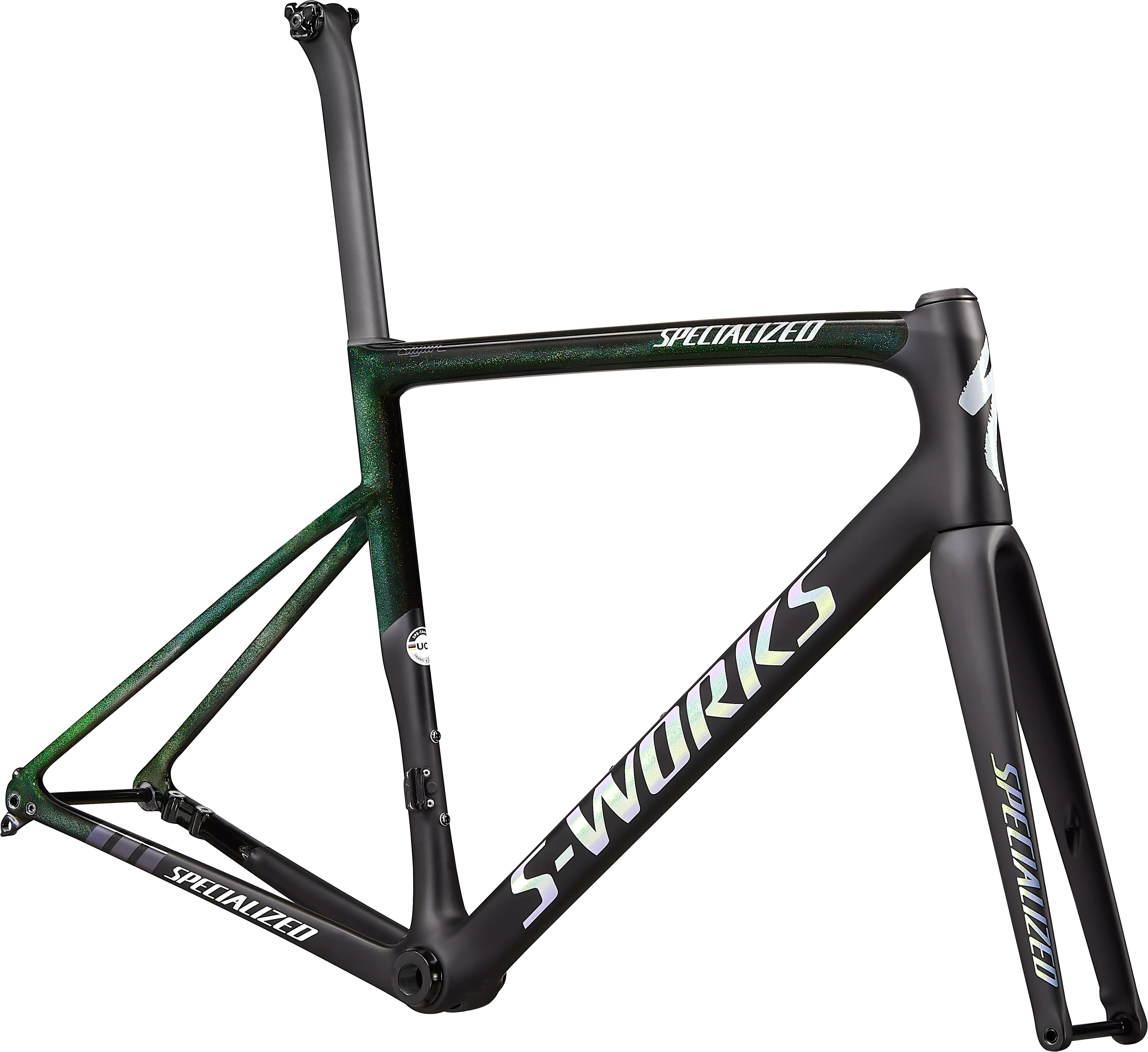新しいSagan Collectionは、ペテル・サガン「らしさ」の本質を徹底的に追求。これまでのレインボーカラーのテーマから脱却しました。 来たるシーズンにサガンが彼らしい勝利を体現するために、スペシャライズドは最速オールラウンドバイクS-Works Tarmacにかつてないカラーを採用。サガンのようにいい意味で期待を裏切るブラックのS-Works Tarmac SL6 フレームセットは、自然光のもとではグリーンが揺らめきながら現れます。スポットライトを浴びるまで真の狙いをひた隠すそのさまは、まさにカメレオン。このペイントテーマはもちろん、ツール・ド・フランスのグリーンジャージを表現しています。