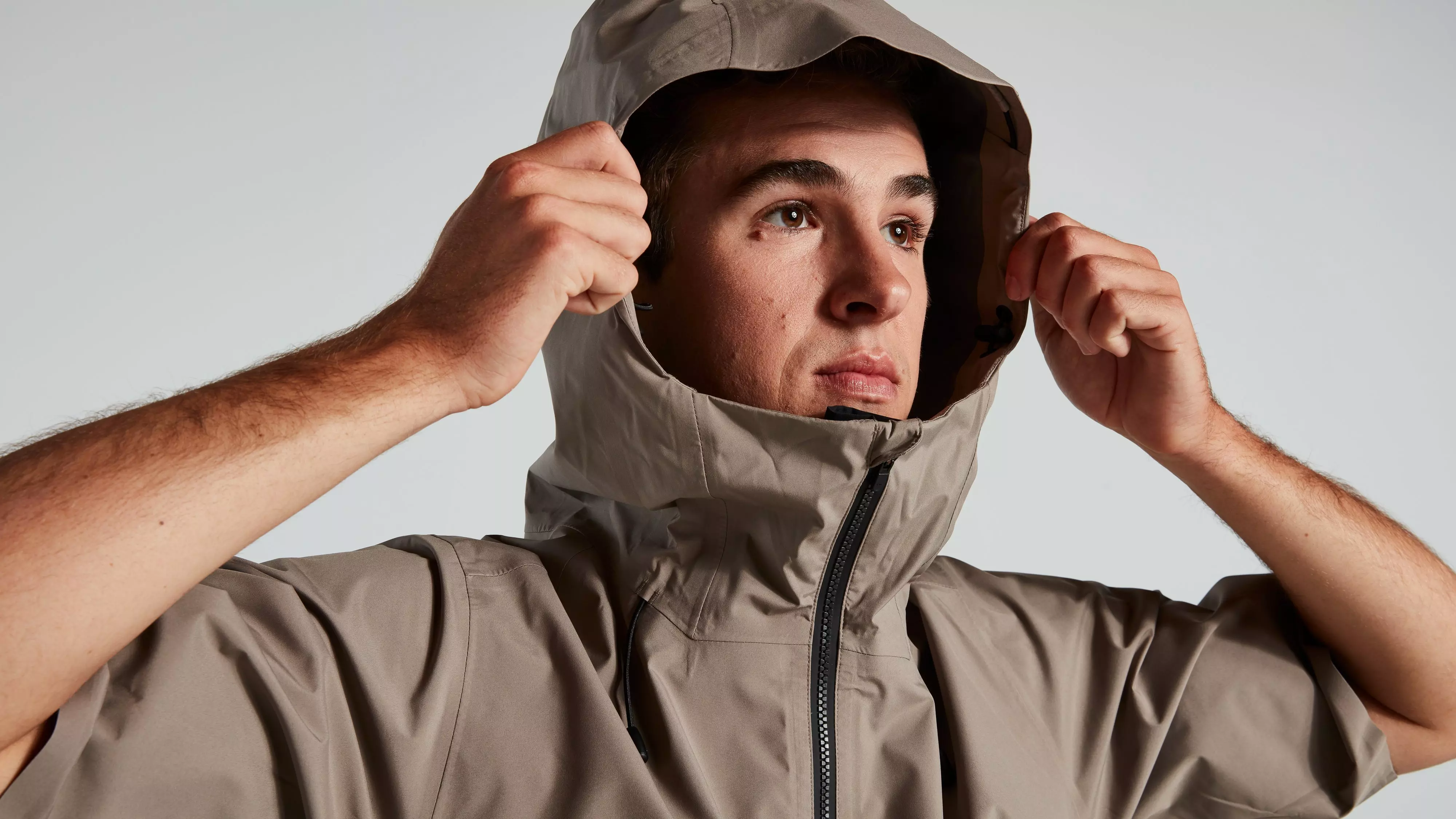 ヘルメットの上から被せられるレインバイザー付きフードと調整しやすいドローコードが、頭部を悪天候から守ります。