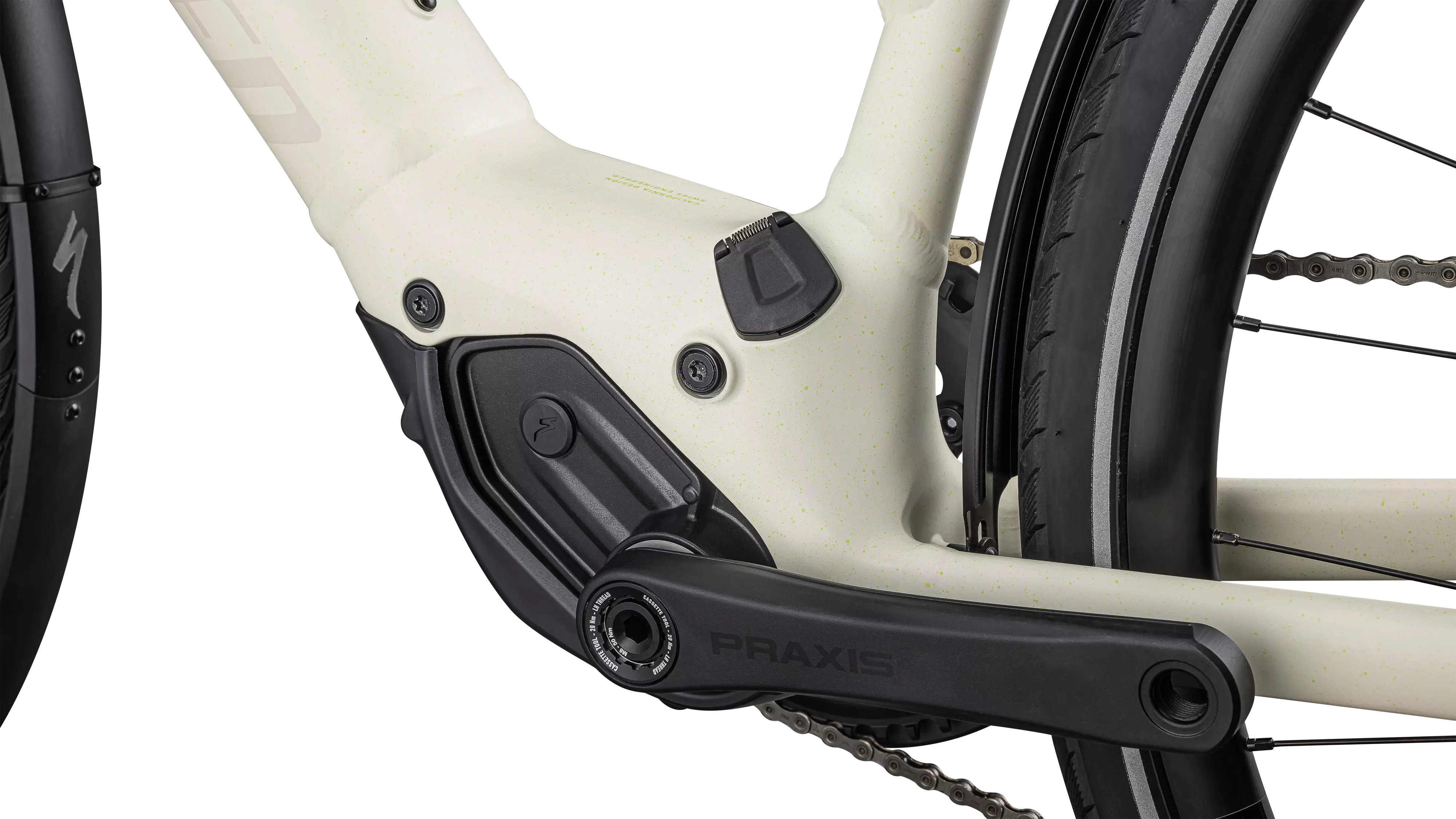 バッテリーは容量320Whでフレームのダウンチューブに完全に内蔵され、別売りのレンジエクステンダーを追加すると航続距離を最長195kmにまで延ばすことができます。