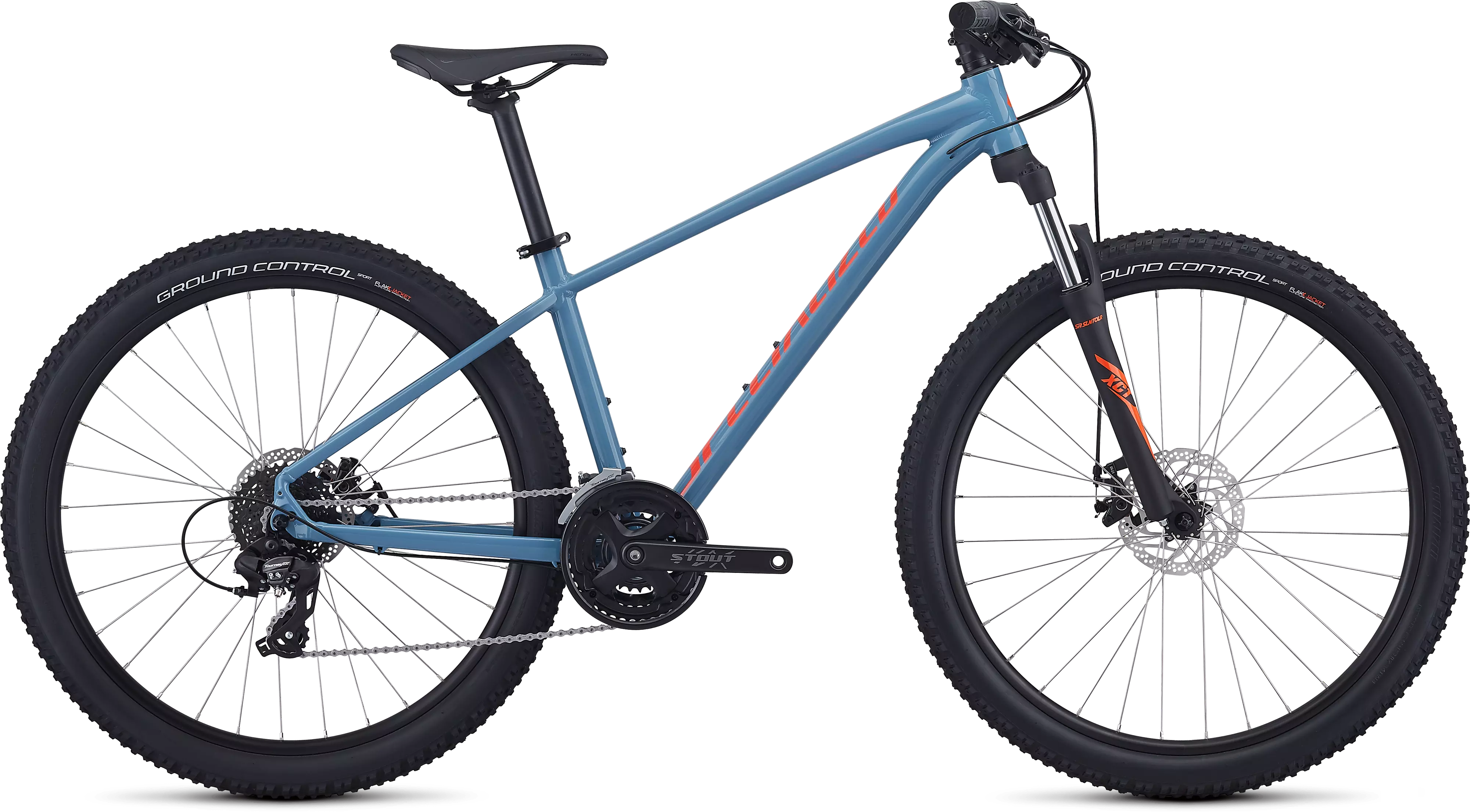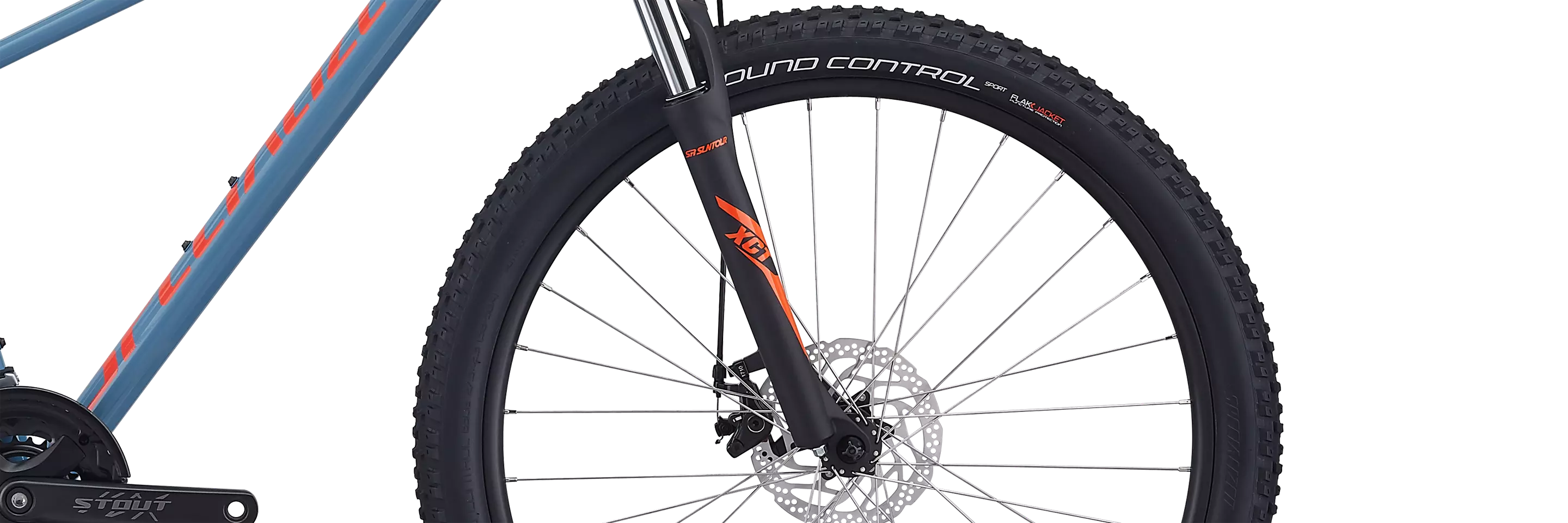 전용 SR 선투어(Suntour) XCT 포크는 사이즈에 따라 80/100mm의 코일 스프링 서스펜션 트래블을 제공합니다.