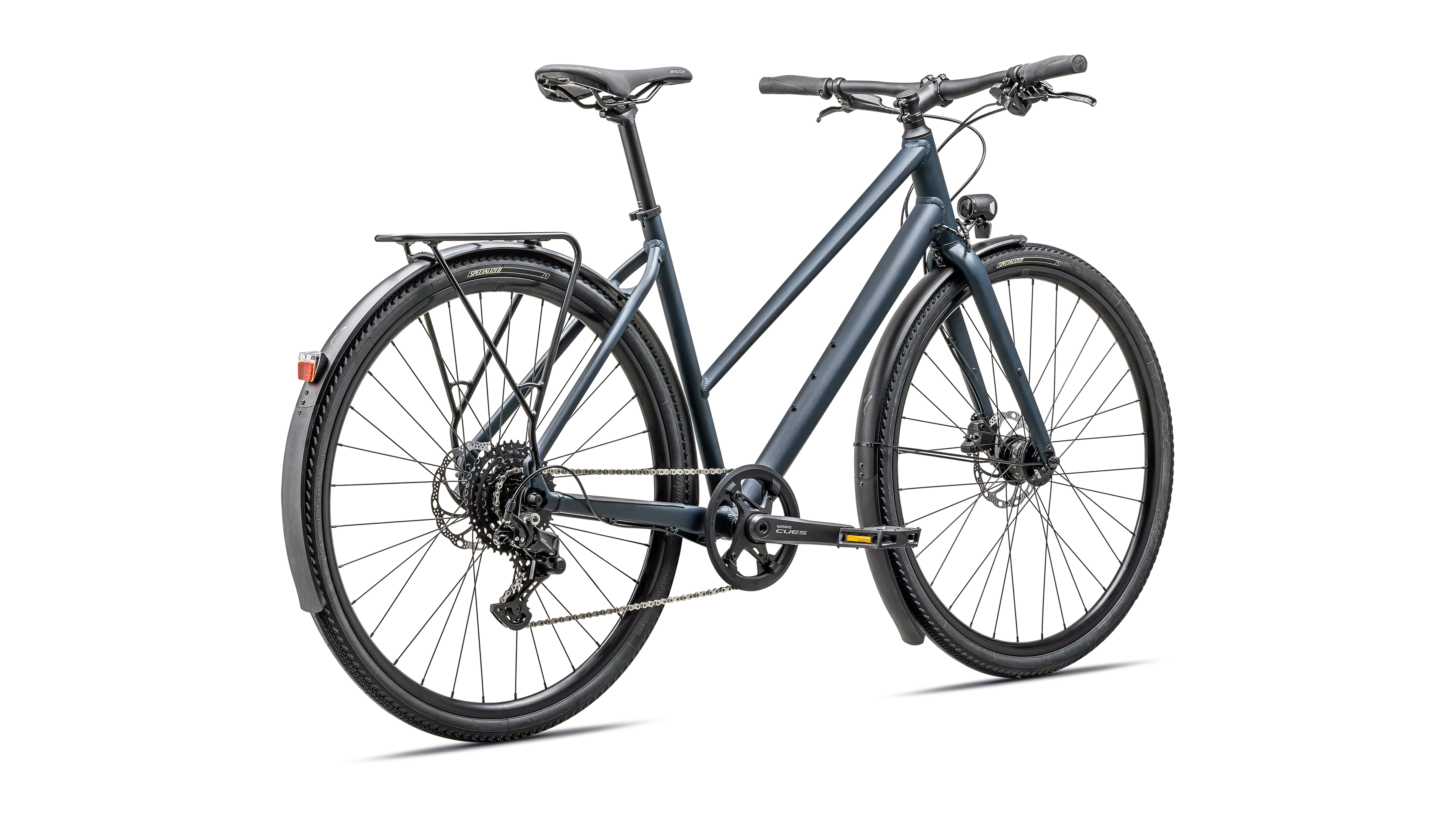 Extra-bright front and rear lighting powered by a Shimano Dynamo hub to see and be seen.