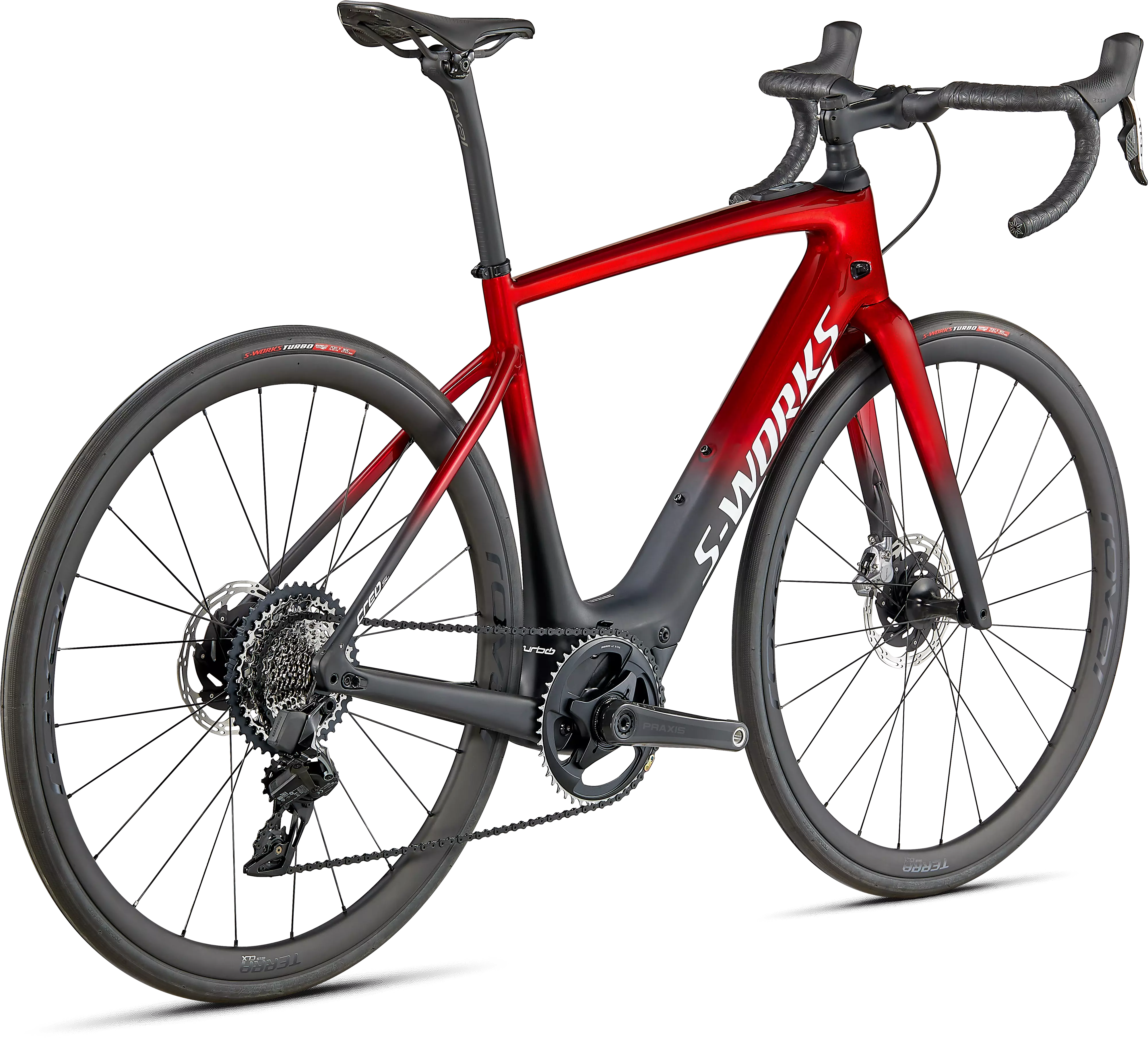 Como todas nuestras bicicletas S-Works, la S-Works Turbo Creo SL es nuestro montaje máximo. Junto al cuadro FACT 11r y el amortiguador Future Shock 2.0 hidráulico cuenta con una transmisión SRAM Red AXS eTap 1x que incluye casete de 10-44t para una relación de cambios increíble. Monta ruedas de carbono Roval Terra CLX Disc y neumáticos S-Works Turbo de 30 mm. Y para terminar la construcción, hemos incluido nuestro manillar S-Works Carbon Hover, con una potencia S-Works Future y sillín Body Geometry S-Works Power. También cuenta con un extensor de batería, ya que nunca querrás dejar de montar en esta bicicleta.