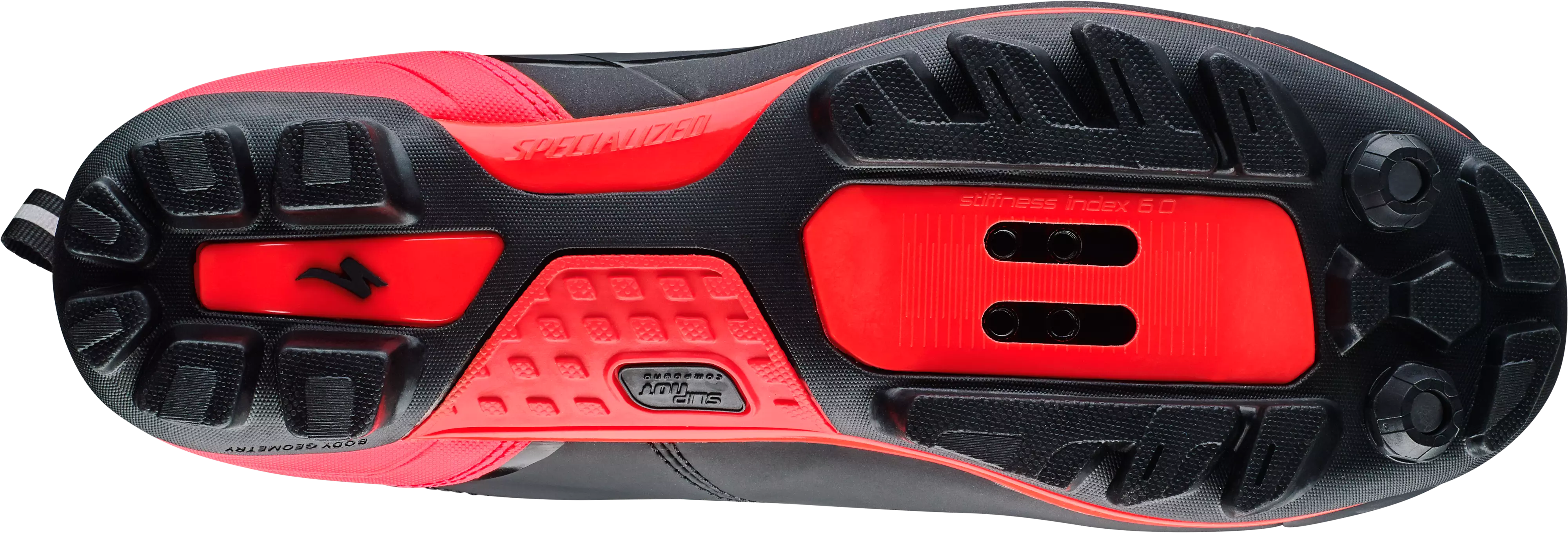 Suela moldeada por inyección de compuesto de nylon con pisada de goma con tecnología SlipNot™, de excelente tracción y moderada rigidez en el pedaleo: Índice de Rigidez 6.0.