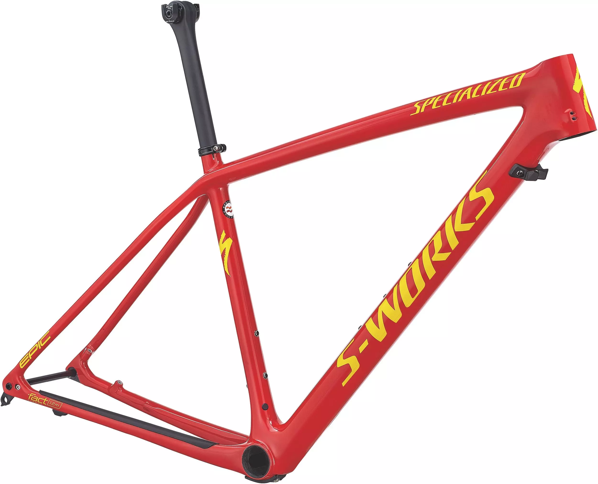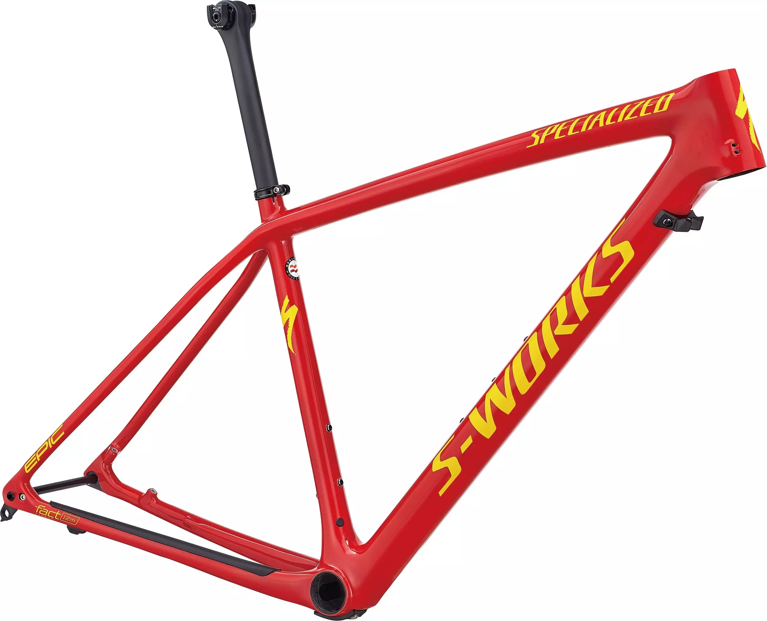 S-Works FACT 12m, full carbon frame w/ S-Works layup, XC Geometry, internal split-housing cable routing, PF30 BB, 12x148mm rear end, triangulated post-mount 160mm brake