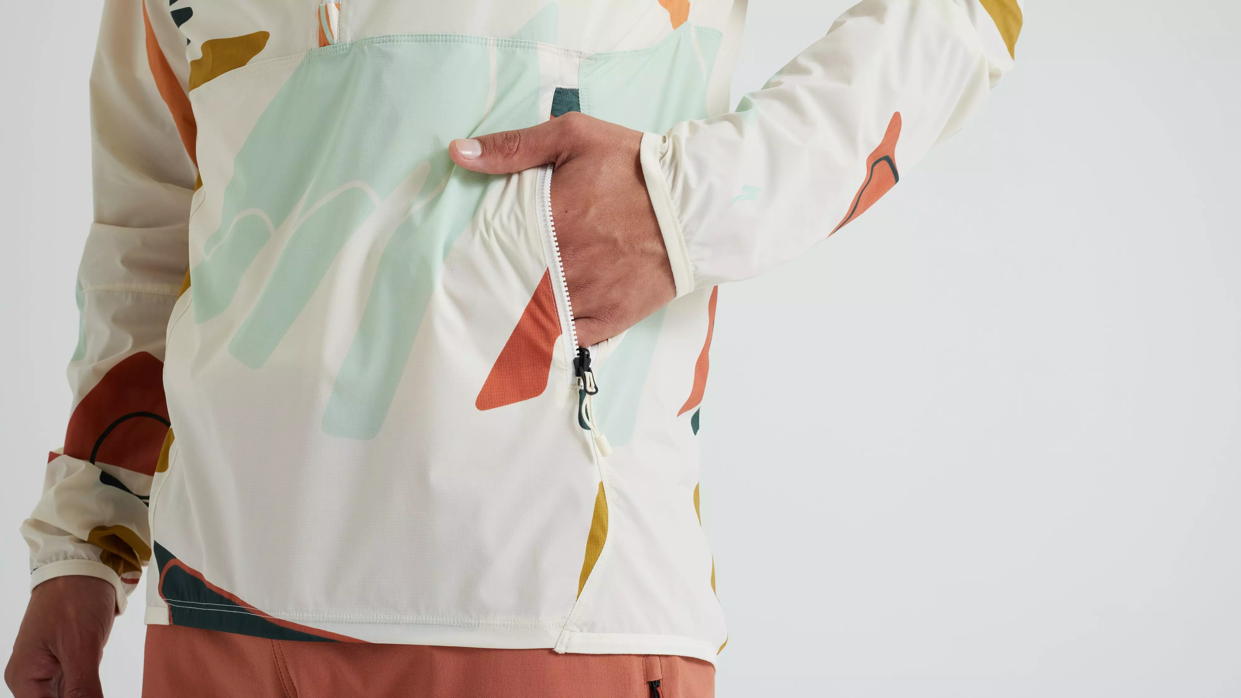 Integrated hood with fixed elastic for perfect fit and added weather protection.