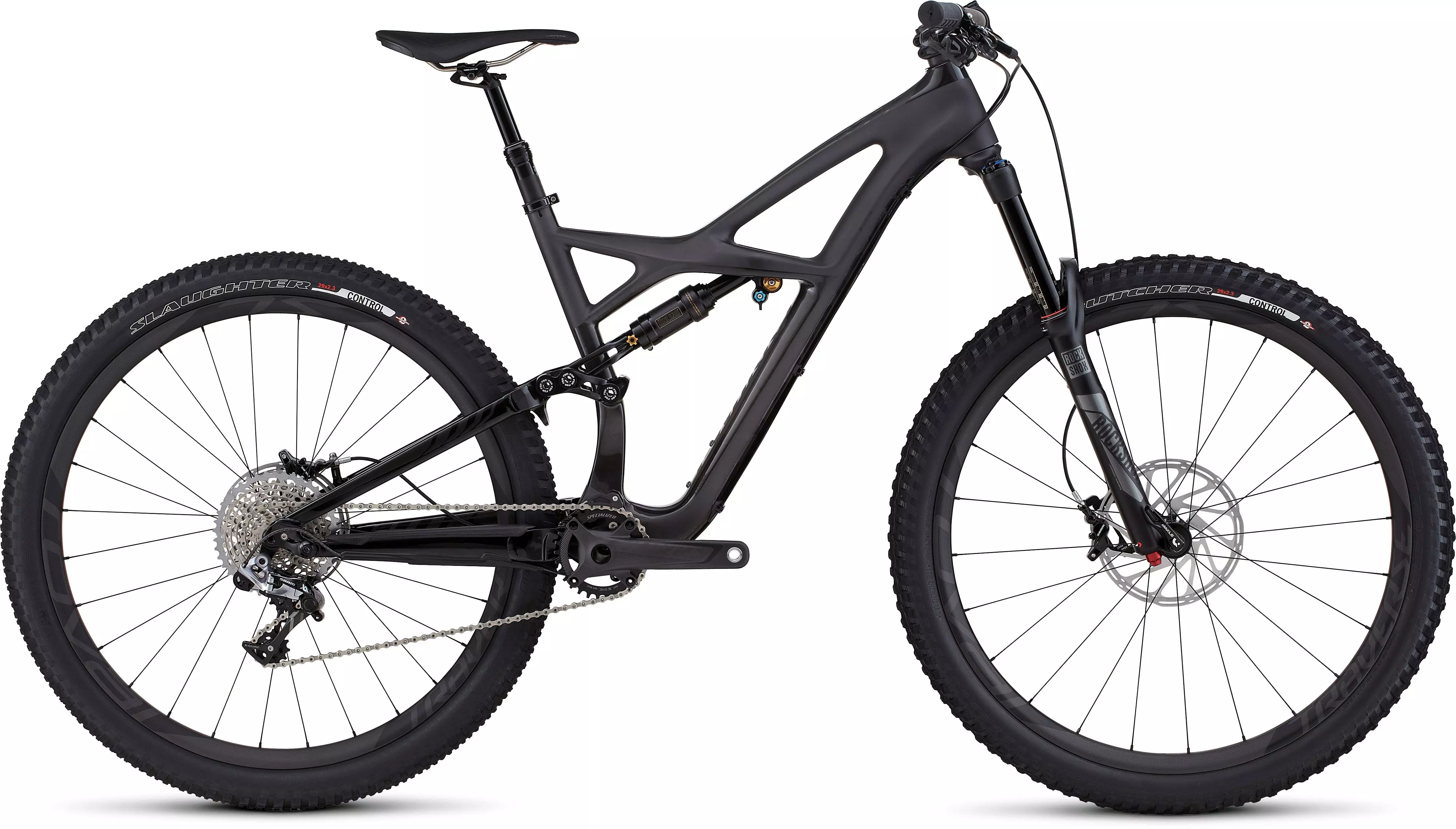 To ride all mountain, your bike has to be able to ride the entire mountain. This means being ready for whatever the trail throws at you, whether it's heading up or down, and there's no better bike for doing this with speed than the S-Works Enduro FSR 29. To keep the weight down, the frame is constructed from our top-tier FACT IS-X 11m carbon fibre. This material comes with the added benefit of being incredibly stiff, which is balanced out by our 29 Geometry's roomy top tube, short chainstays, slack head tube, and longer wheelbase. To ensure top-level performance on the descents, this geo is mated with 160mm of plush travel up front and 155mm at rear. And handling suspension duties out back is the revolutionary Öhlins single tube rear shock. For the build, the Enduro spares no expense at hitting the pinnacle of performance, with a full SRAM XX1 groupset, powerful Guide RS Carbon brakes, hand-built carbon Roval wheels, and our all-new Command Post IRcc with up to 10 middle positions. Make the mountain bend to you.