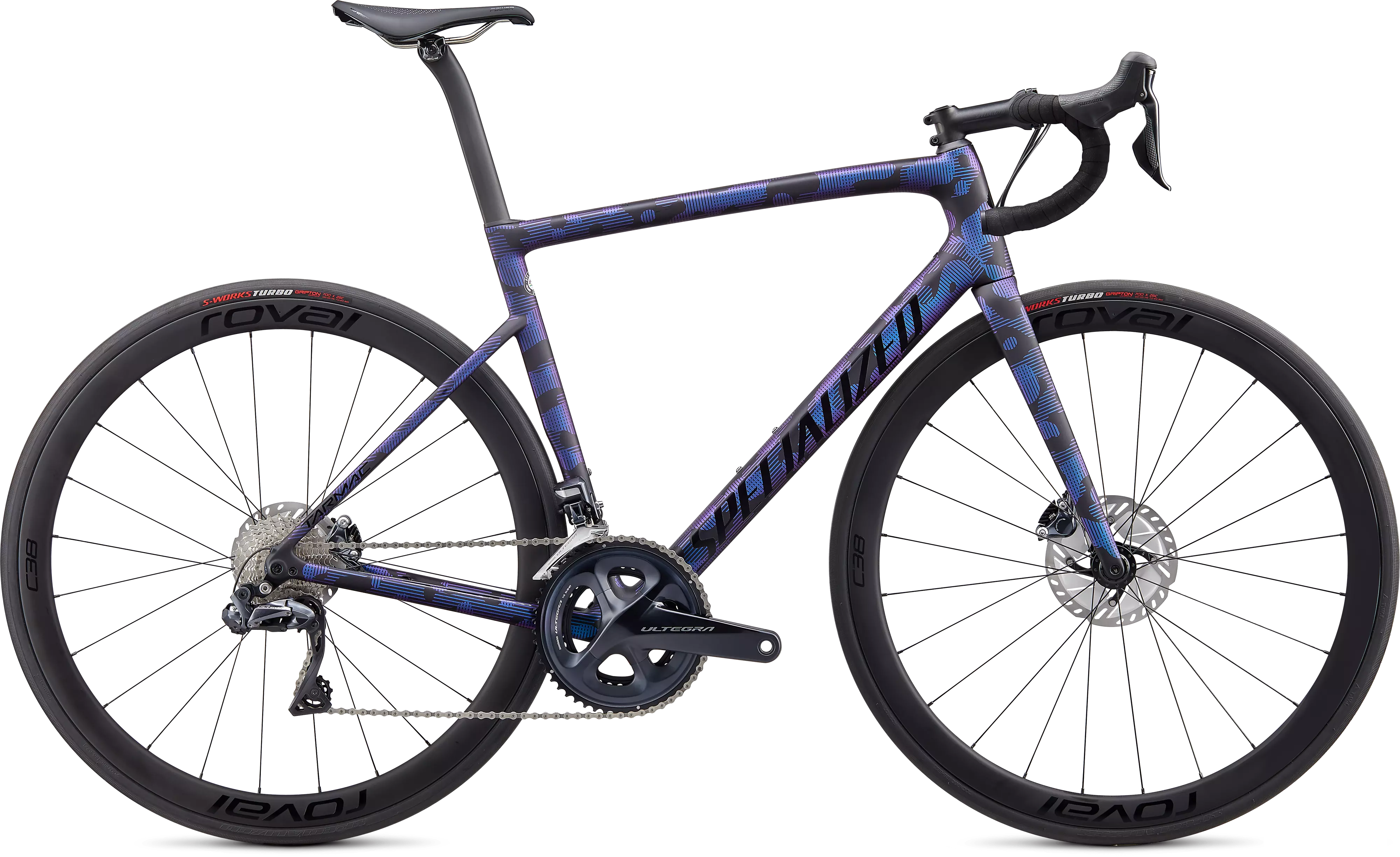 When we developed the Tarmac Disc, we didn't just want it to be fast. We wanted it to be fast everywhere. Long climbs, windy flats, Grand Tour stages, local fondos—we built a race bike to be the most complete out there. How'd we do it? We started with our Rider-First Engineered™ frame with a perfectly-tuned ride quality for every size, added in some serious aero tech that makes it 45 seconds faster over 40 kilometers than the Tarmac SL5, and then made it 20% lighter. Nothing is lighter, faster, and better handling. The build spec on this Tarmac Disc is value-packed, featuring Shimano Ultegra Di2 electronic shifting and hydraulic disc brakes, a Roval C 38 Disc carbon fiber wheelset, S-Works Turbo tires, and our fan-favorite Power saddle.