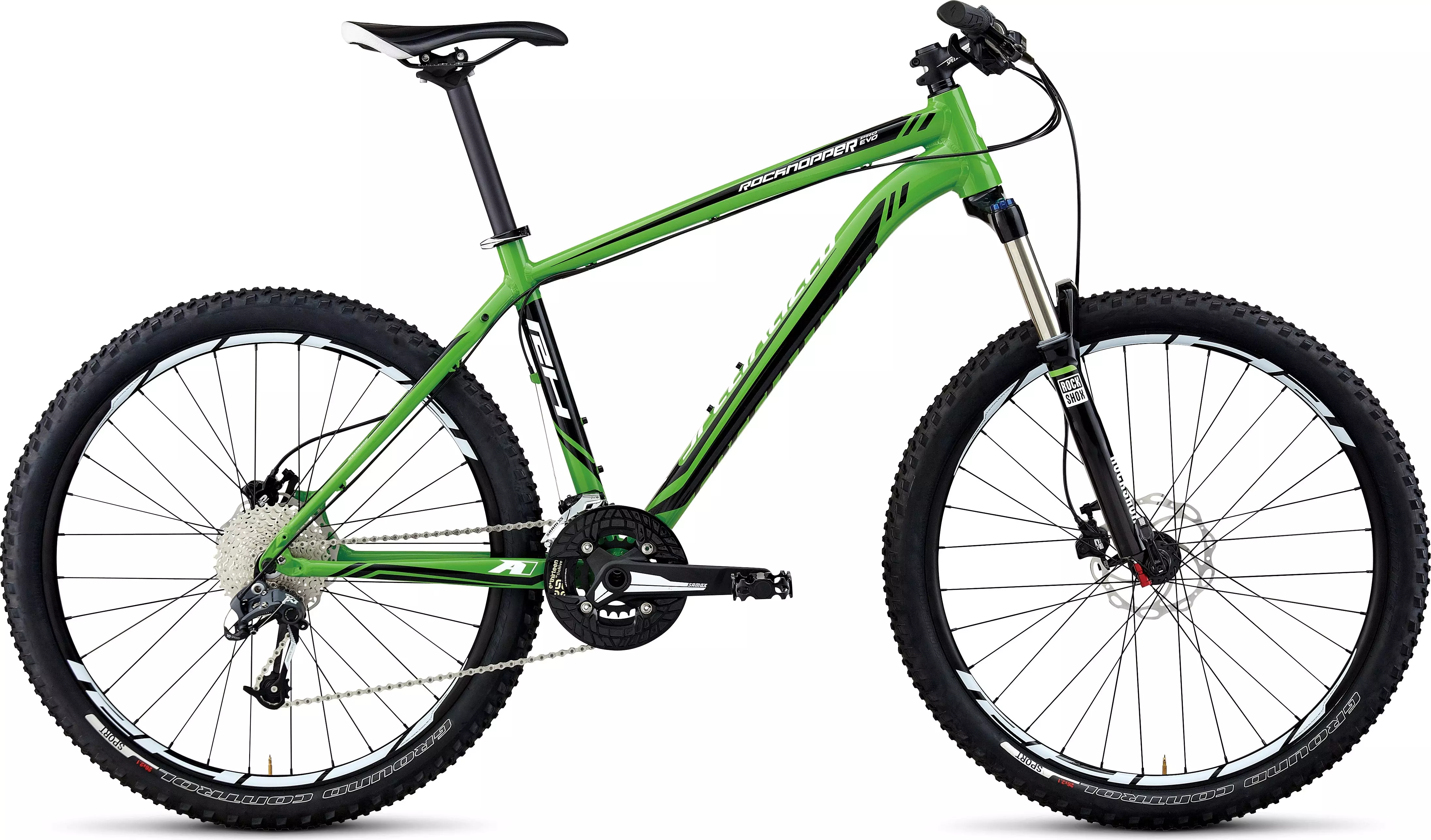 The EVO model uses the same fully butted A1 Premium frame as other Rockhopper models, but delivers a more aggressive trail experience. The 120mm-travel RockShox fork relaxes the geometry for more stable handling, and a bash guard improves chain retention and drive train durability