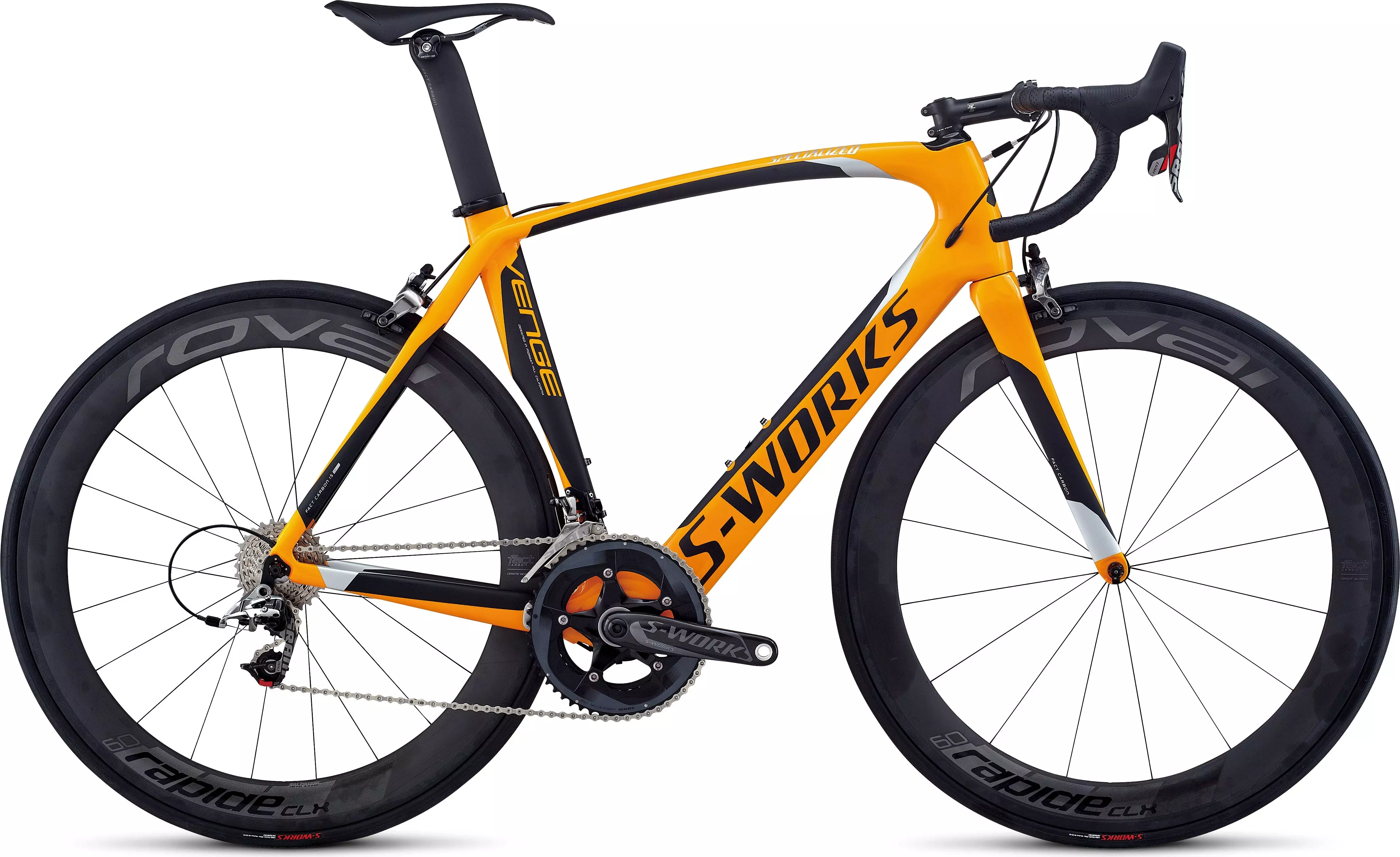 S-Works FACT carbon crankset is OSBB, with removable carbon spider, and CeramicSpeed ceramic bearings, plus SRAM's Pro Tour-proven RED rings, to provide a feather-light package to deliver maximum power transfer